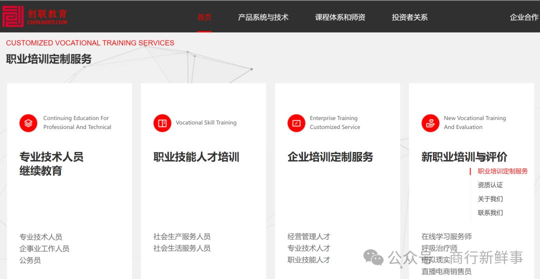 据创联教育官网介绍,该公司是一家终身教育培训平台。业务覆盖职业教育、继续教育、技能评价、人力资源服务,以数字化、智能化为核心,为政府、院校、企事业单位、个人提供综合解决方案。