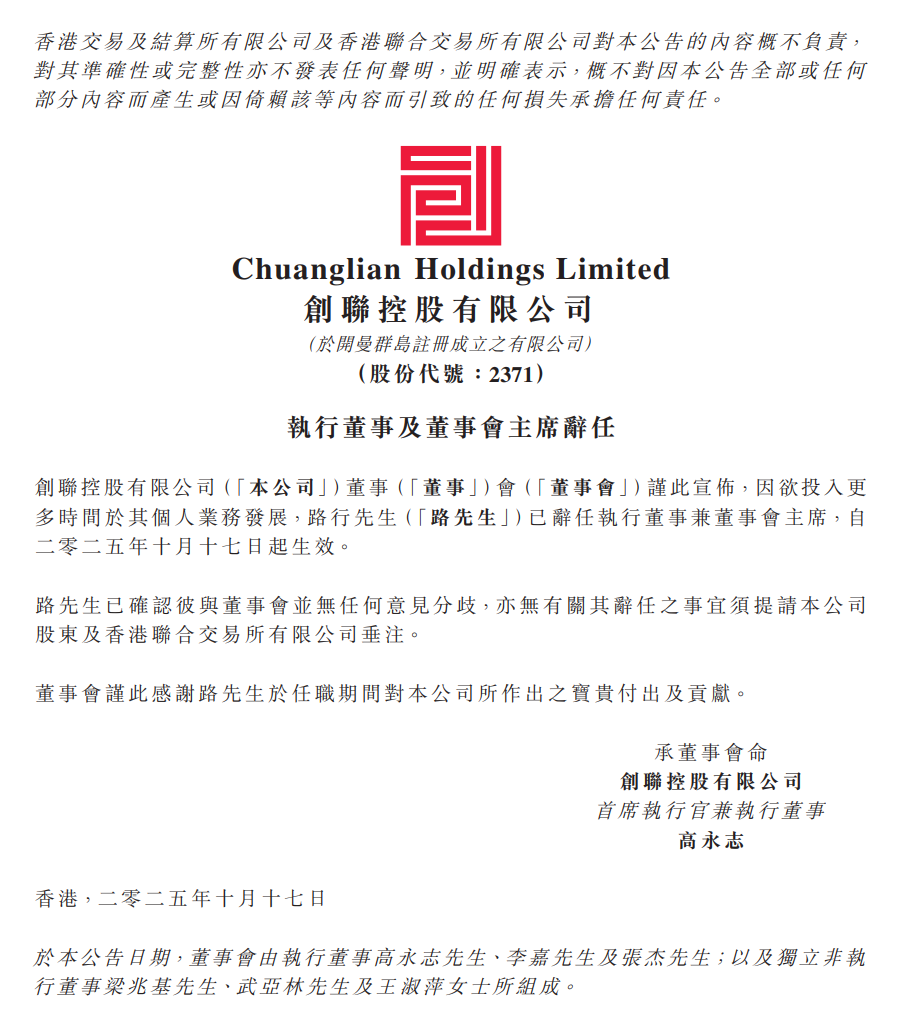 就在节目播出次日,路行宣布辞去上市公司创联控股董事会主席一职,理由为“投入个人业务发展”。
