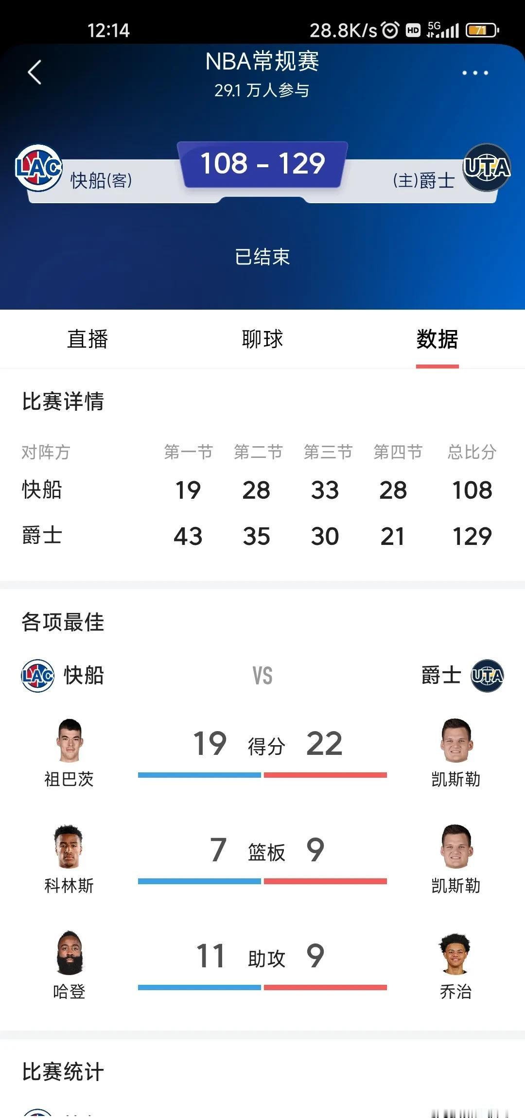 快船输了21分,不是被爆了,是老了。 莱纳德膝盖发炎,打25分钟像在走钢丝。 哈登全场9次出手,连自己都嫌少。40岁的保罗,第四节连板凳都没坐,直接被教练当成了战术背景板。 比尔不打首发了,改去带二队。 不是降级,是腾地方——哈登和莱纳德的球权,早就挤得喘不过气。 爵士不是突然变强,是快船太脆。 马尔卡宁三分雨下得干脆,快船的防守像退休老人散步,慢,还容易岔气。 这支球队,不是没实力,是时间不等人。 哈登想扛,但肩膀也老了。 莱纳德想拼,膝盖先喊停。 比尔想证明自己,可球权不够分。 他们不是在打篮球,是在和年龄赛跑。 每一场赢球,都是抢来的。 下一场打太阳,再输,球迷该考虑的不是战术,是明年选秀签该往哪放了。 这支球队,不是重建,是延寿。 能撑到季后赛,就是胜利。