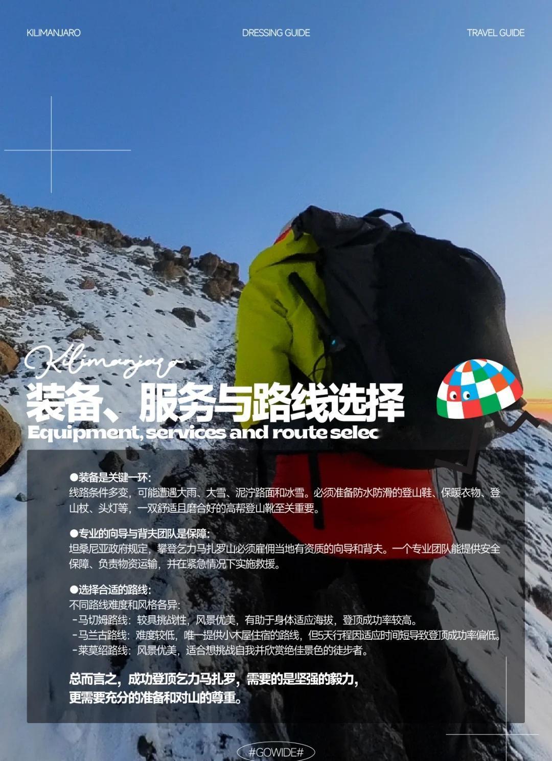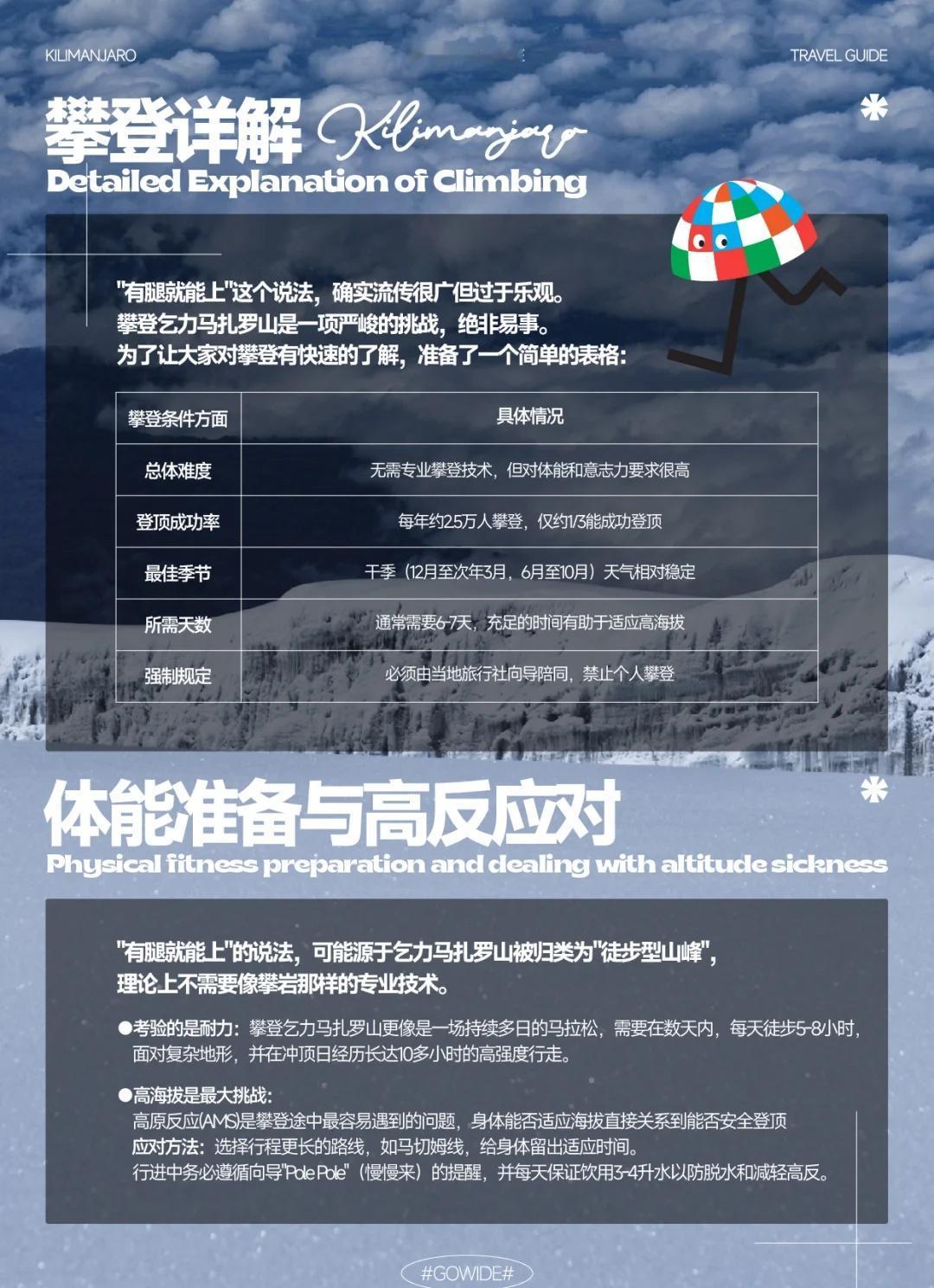 "有腿就能上乞力马扎罗?" "有腿就能上"这个说法,确实流传很广但过于乐观。攀登乞力马扎罗山是一项严峻的挑战,绝非易事。为了让大家对攀登有快速的了解,准备了一个简单的表格: 💪 体能准备与高反应对 "有腿就能上"的说法,可能源于乞力马扎罗山被归类为"徒步型山峰",理论上不需要像攀岩那样的专业技术。 - 考验的是耐力:攀登乞力马扎罗山更像是一场持续多日的马拉松,需要在数天内,每天徒步5-8小时,面对复杂地形,并在冲顶日经历长达10多小时的高强度行走。 - 高海拔是最大挑战:高原反应(AMS)是攀登途中最容易遇到的问题,身体能否适应海拔直接关系到能否安全登顶 - 应对方法:选择行程更长的路线,如马切姆线,给身体留出适应时间。行进中务必遵循向导"Pole Pole"(慢慢来)的提醒,并每天保证饮用3-4升水以防脱水和减轻高反。 🎒 装备、服务与路线选择 - 装备是关键一环:线路条件多变,可能遭遇大雨、大雪、泥泞路面和冰雪。必须准备防水防滑的登山鞋、保暖衣物、登山杖、头灯等,一双舒适且磨合好的高帮登山靴至关重要。 - 专业的向导与背夫团队是保障:坦桑尼亚政府规定,攀登乞力马扎罗山必须雇佣当地有资质的向导和背夫。一个专业团队能提供安全保障、负责物资运输,并在紧急情况下实施救援。 - 选择合适的路线:不同路线难度和风格各异。 - 马切姆路线:较具挑战性,风景优美,有助于身体适应海拔,登顶成功率较高。 - 马兰古路线:难度较低,唯一提供小木屋住宿的路线,但5天行程因适应时间短导致登顶成功率偏低。 - 莱莫绍路线:风景优美,适合想挑战自我并欣赏绝佳景色的徒步者。 总而言之,成功登顶乞力马扎罗,需要的是坚强的毅力,更需要充分的准备和对山的尊重。 户外徒步 徒步的意义 乞力马扎罗 雪山 荒野的呼唤