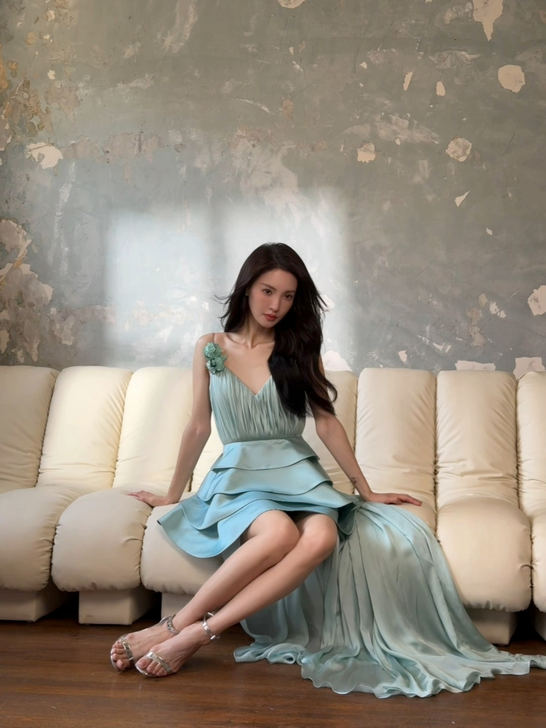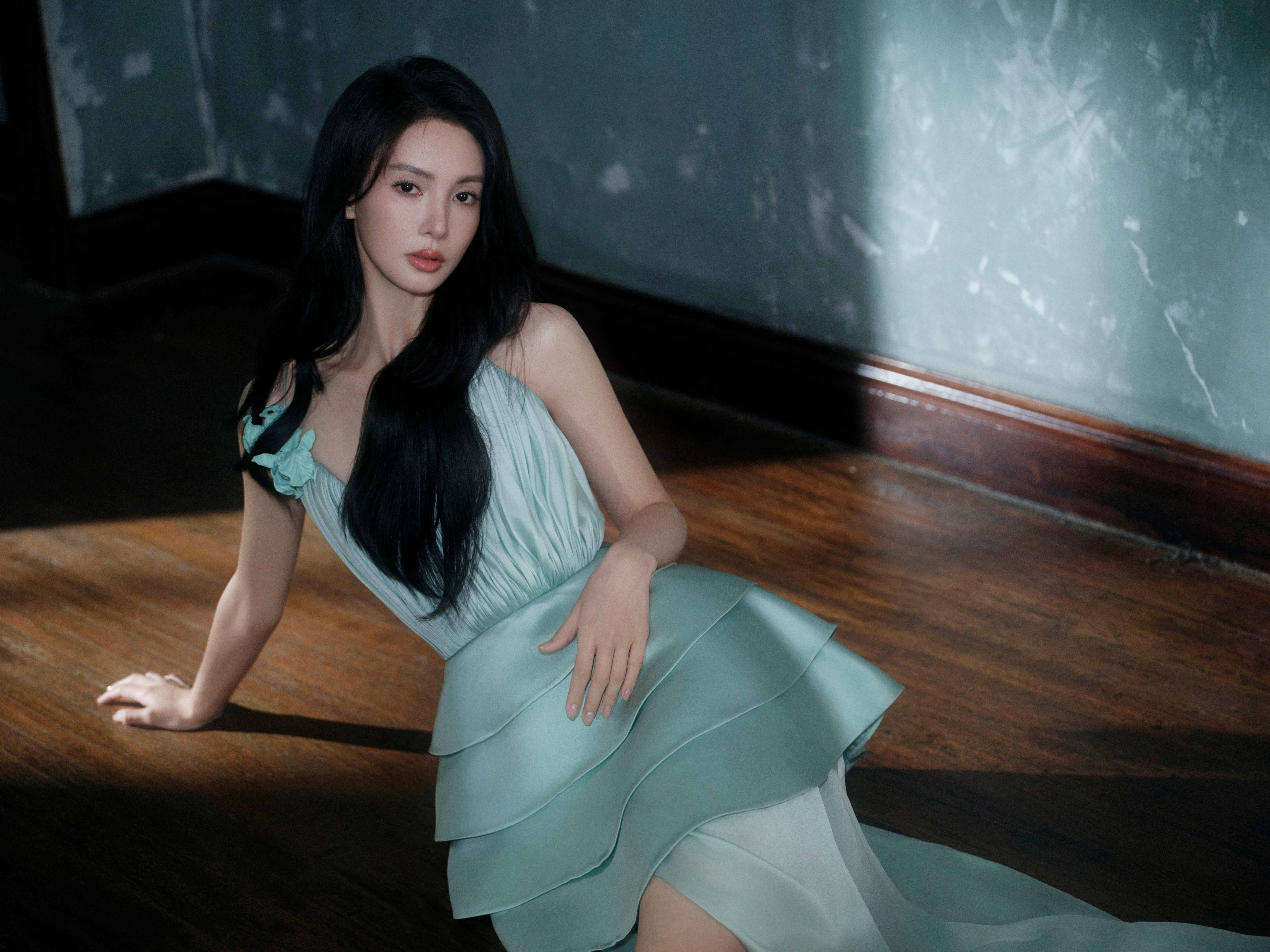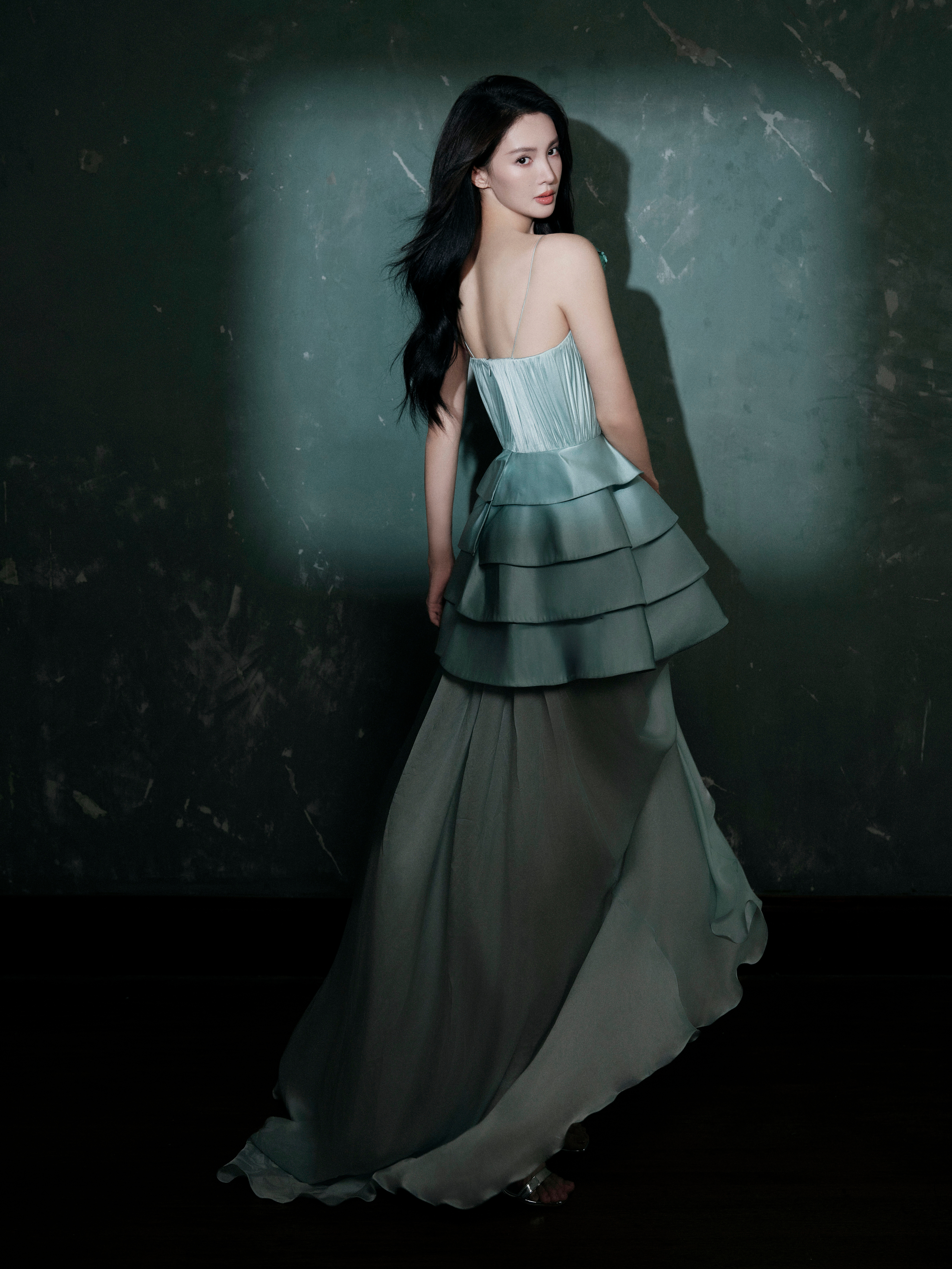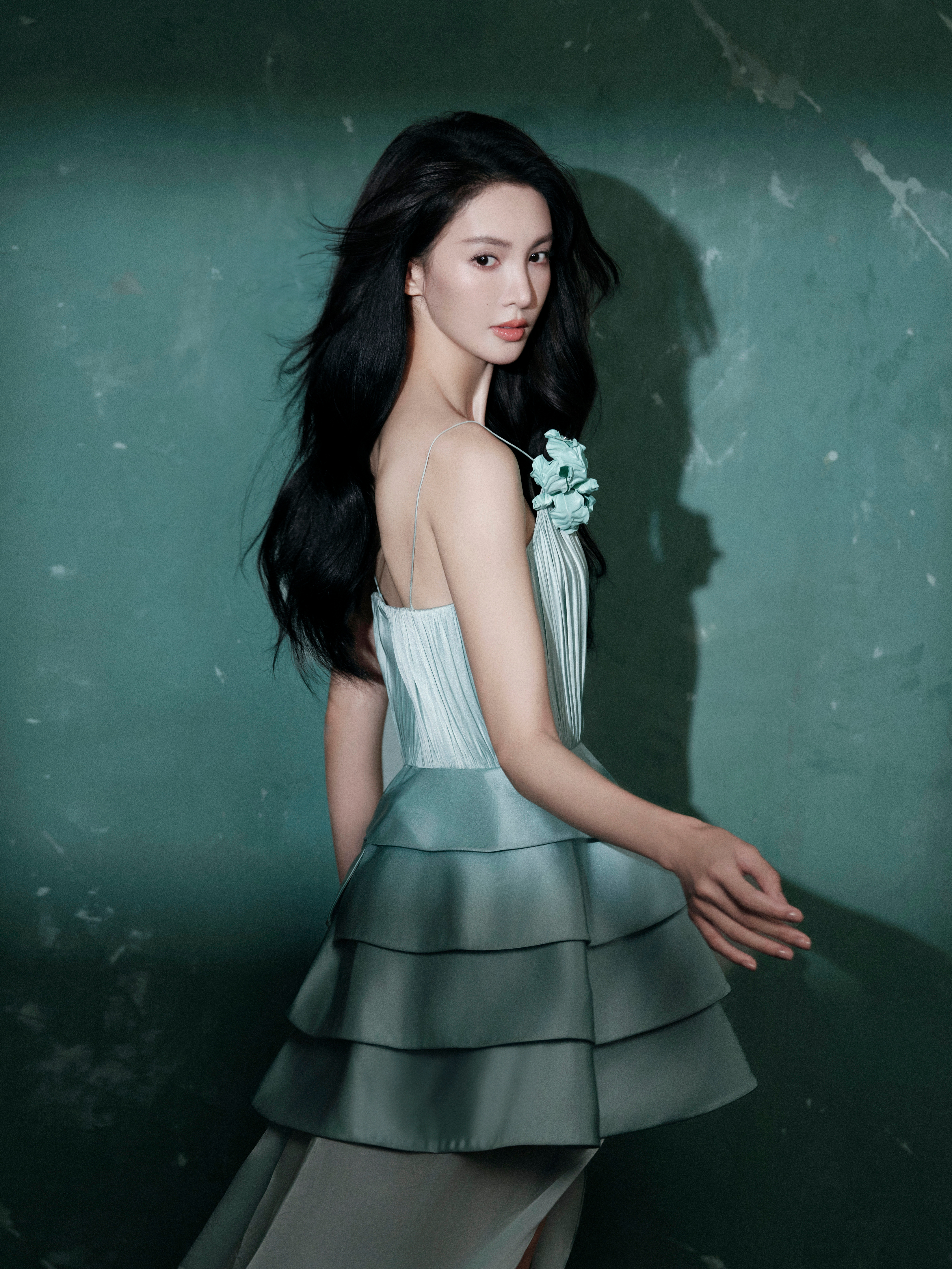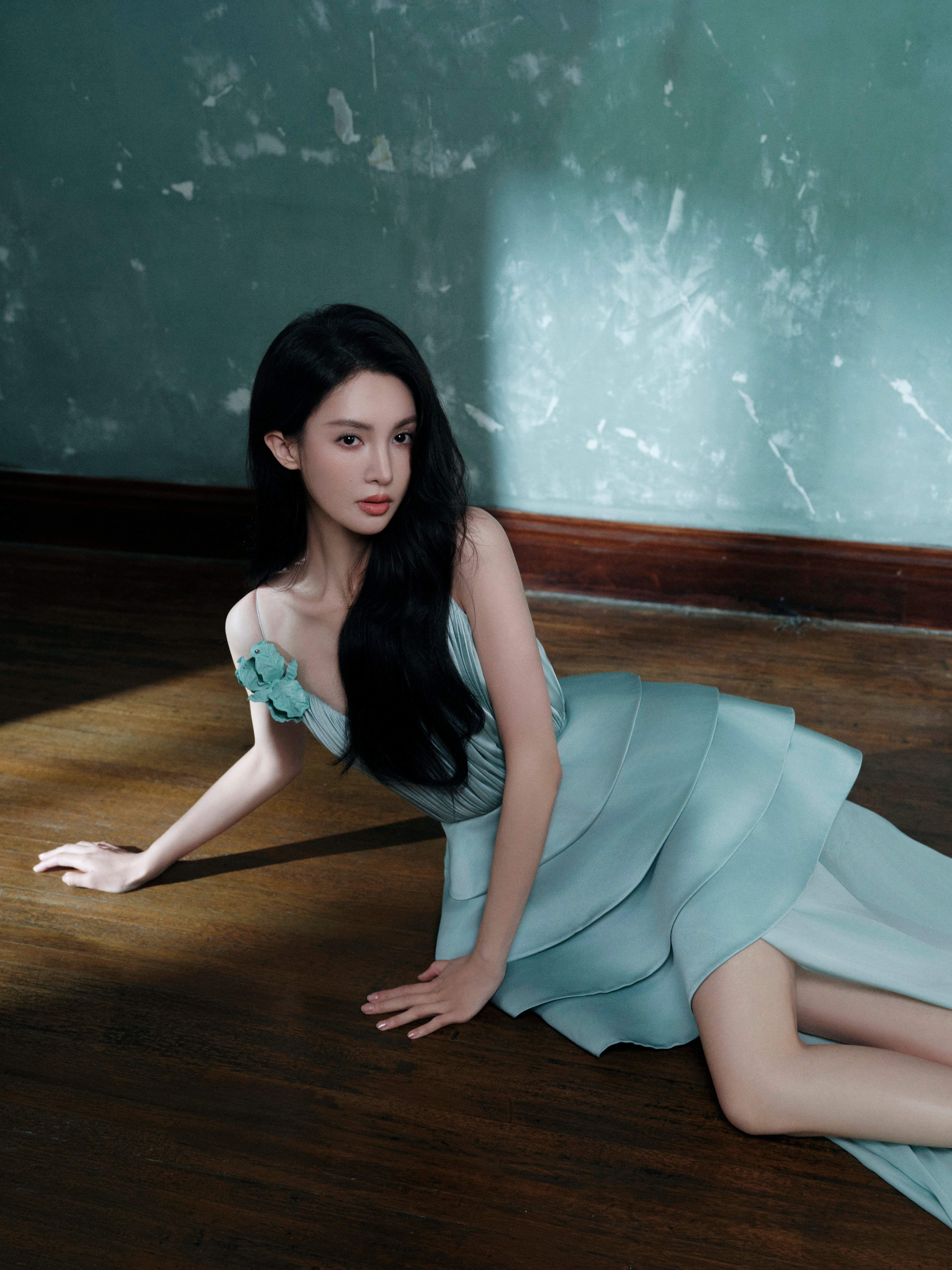 金晨迷人妆造,青纱碧裙,一字高跟大长腿