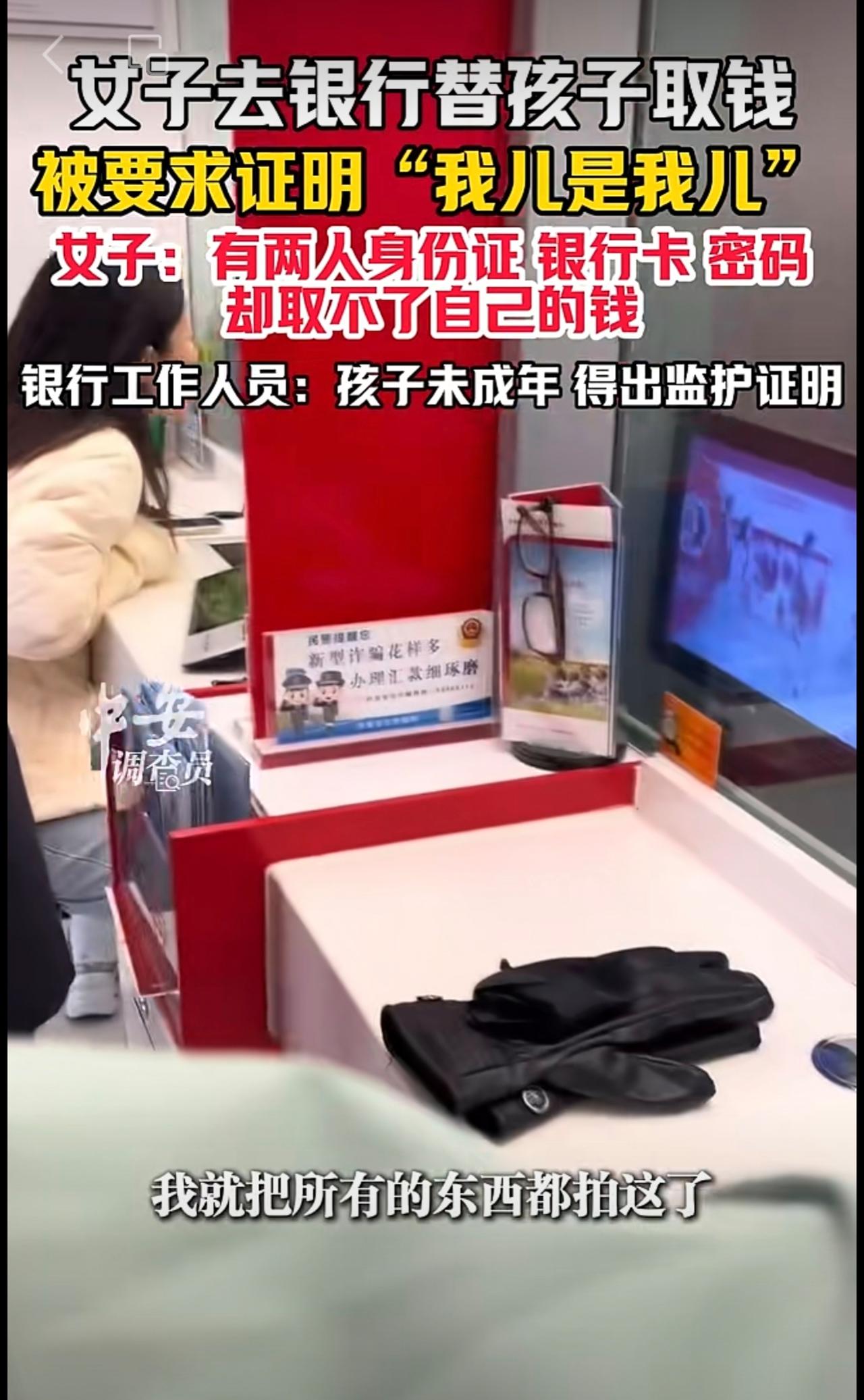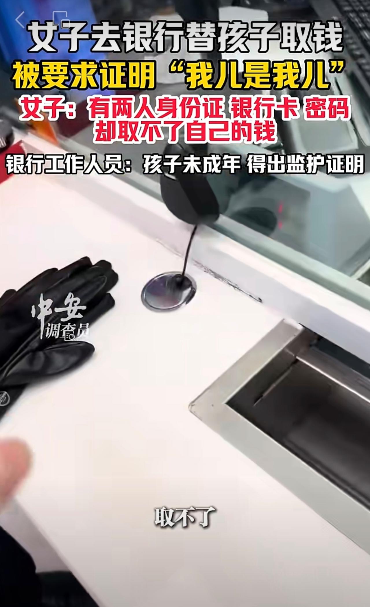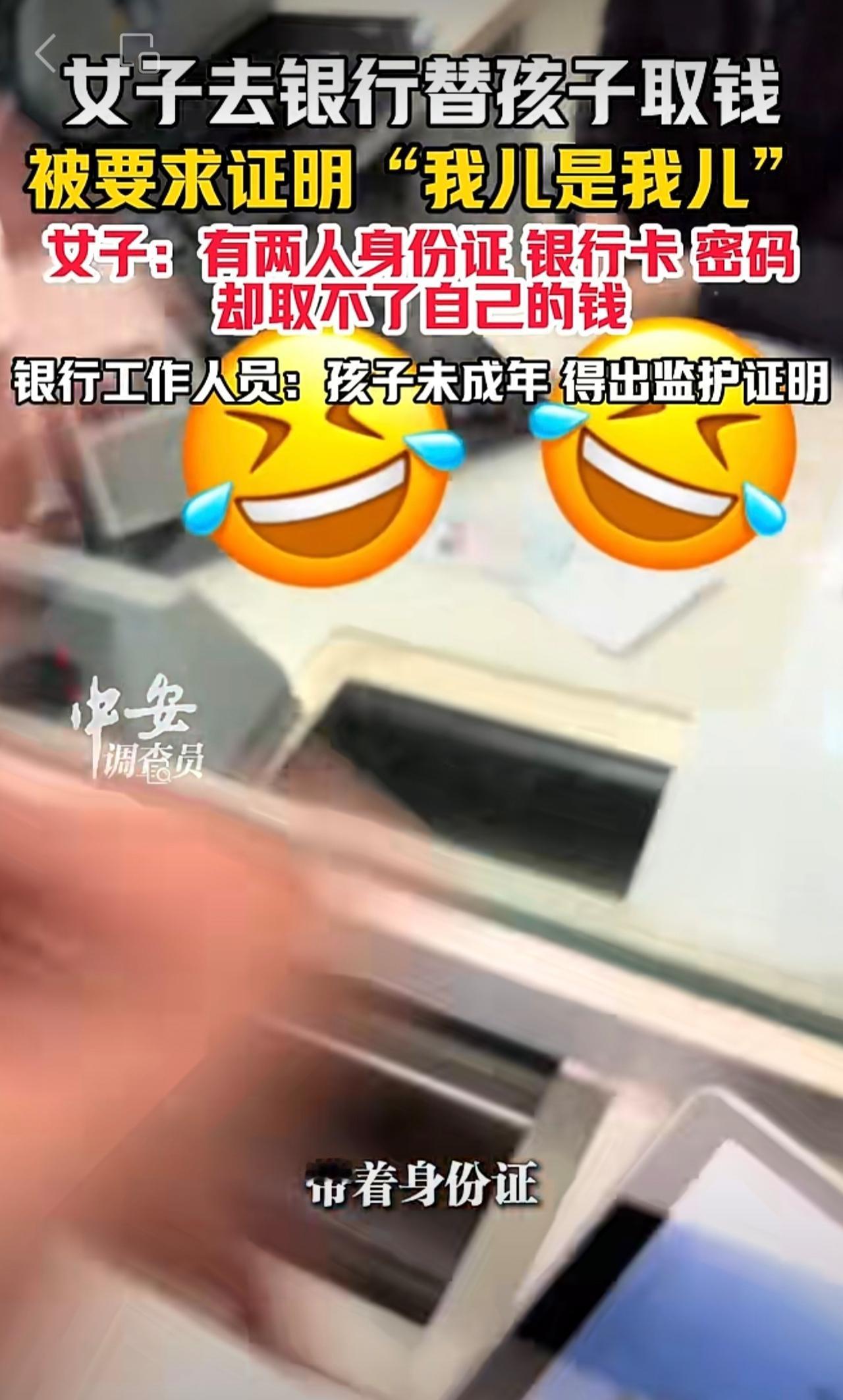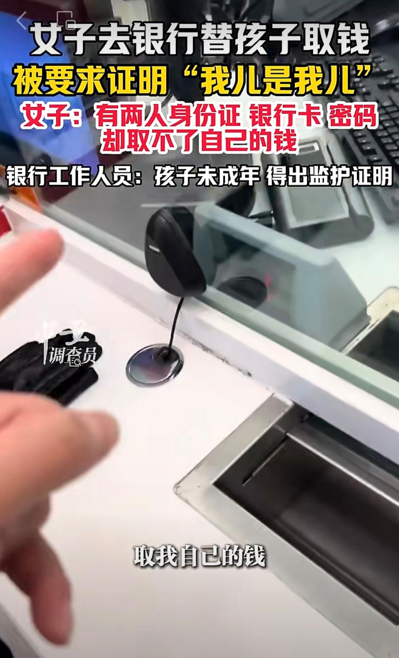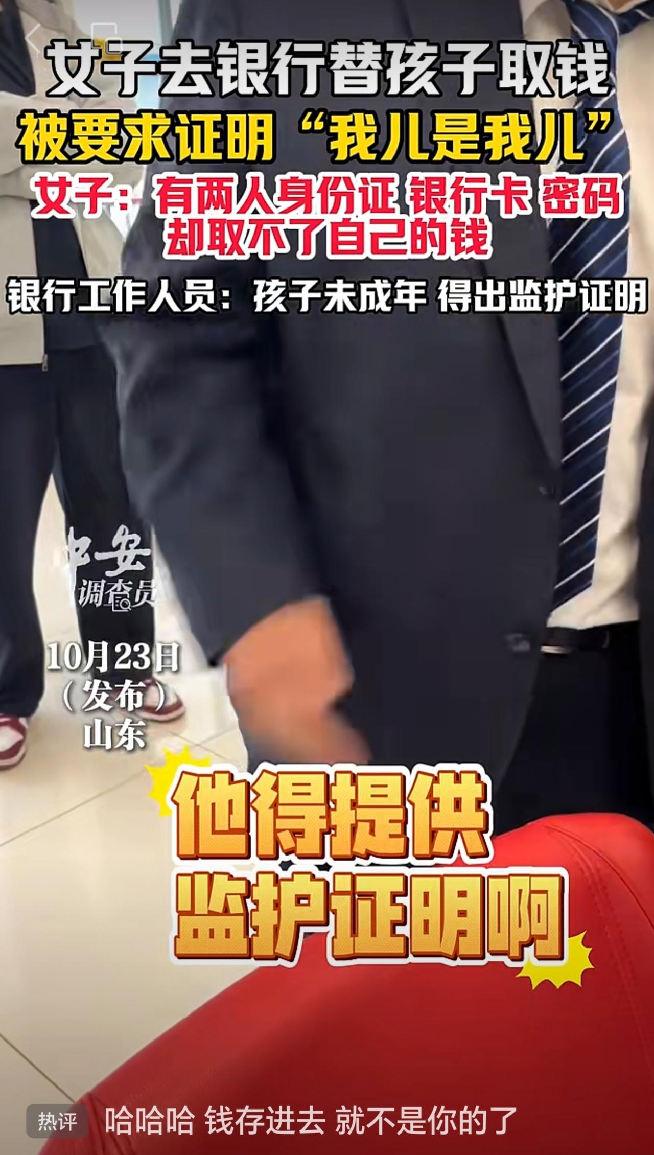 10月23日(发布),山东。女子去银行替孩子取钱,被要求证明“我儿是我儿”。女子:有两人身份证、银行卡、密码,却取不了自己的钱。银行工作人员:孩子未成年,得出监护证明。(编辑:琳琳)