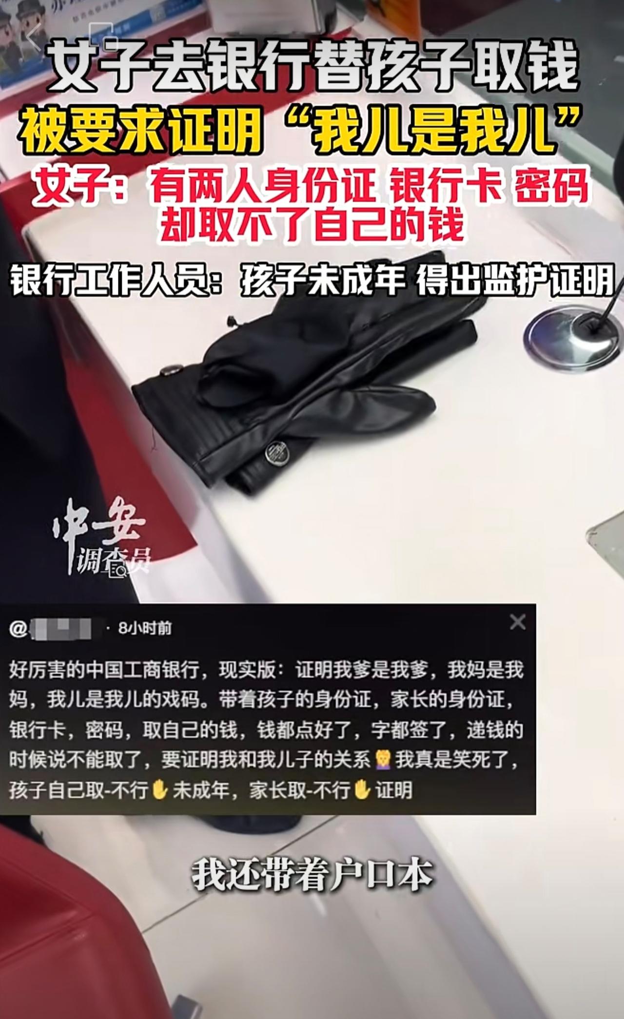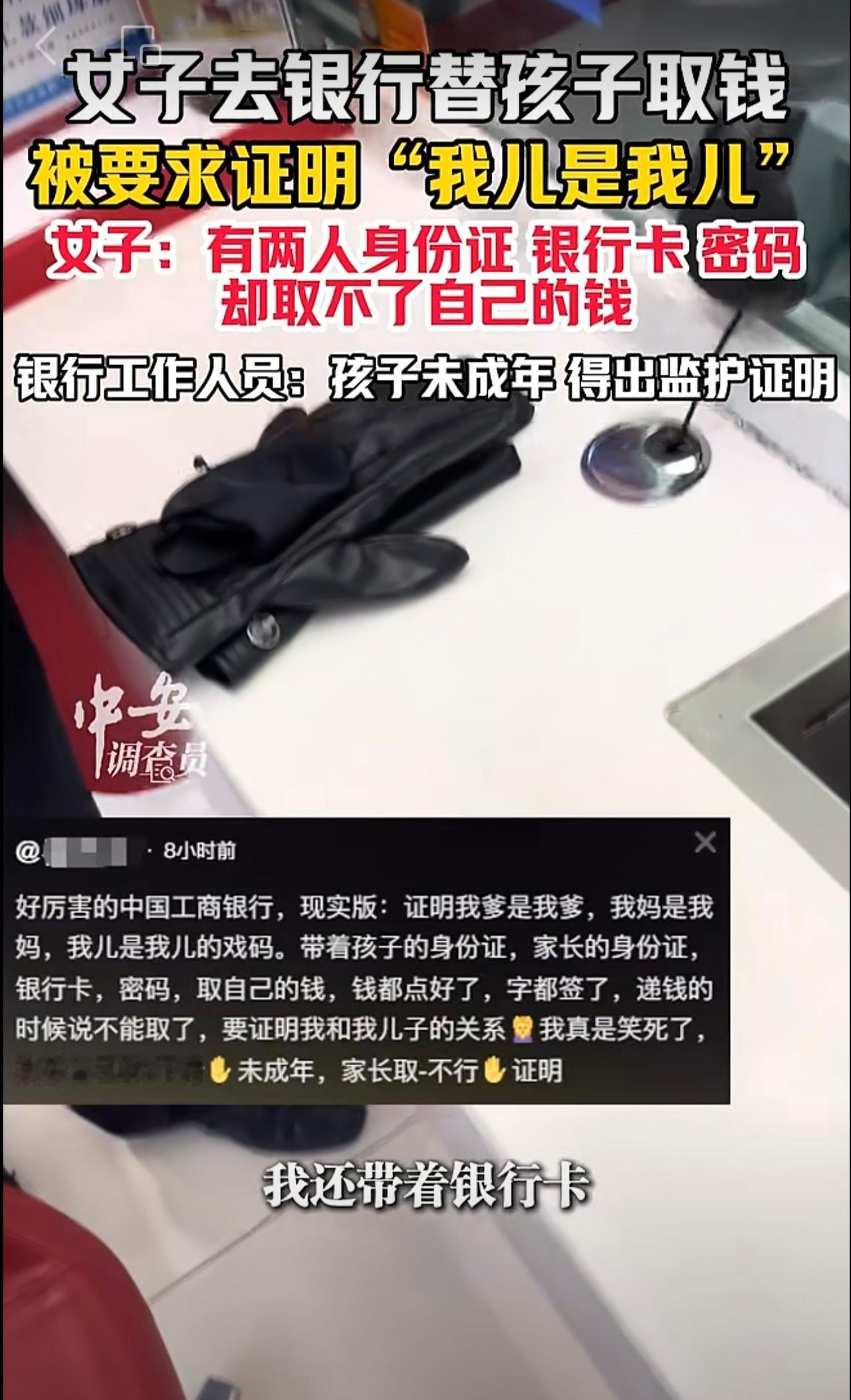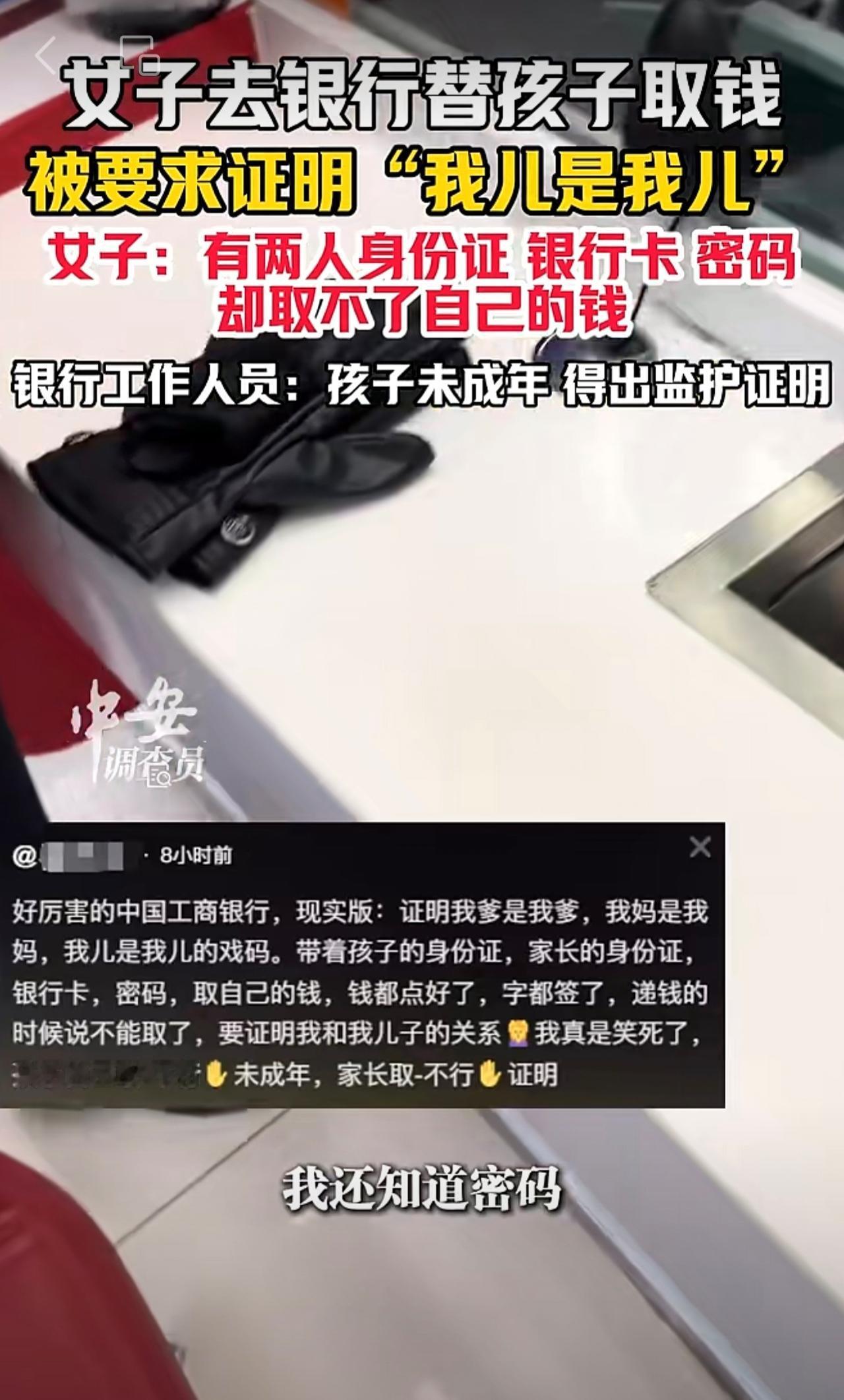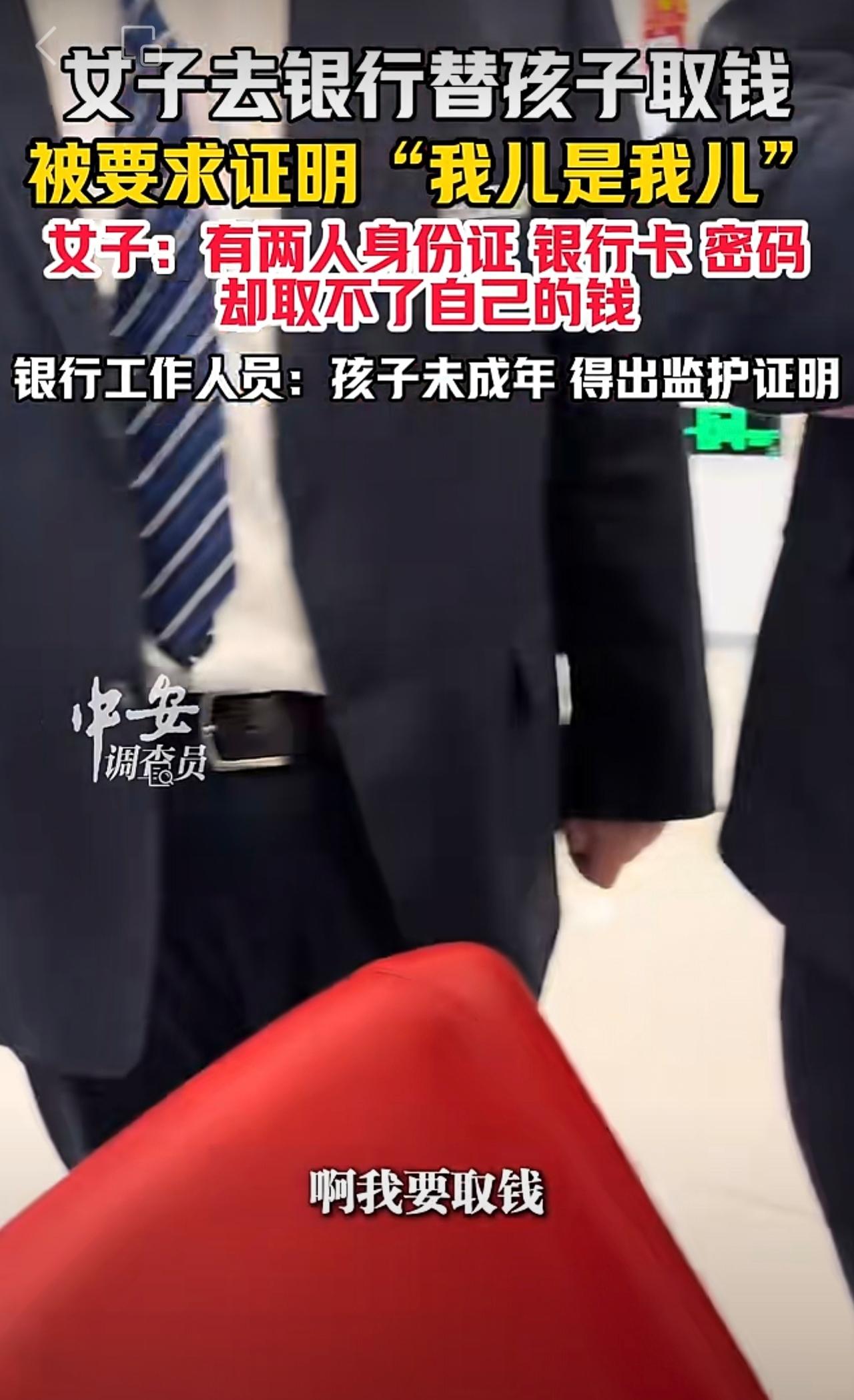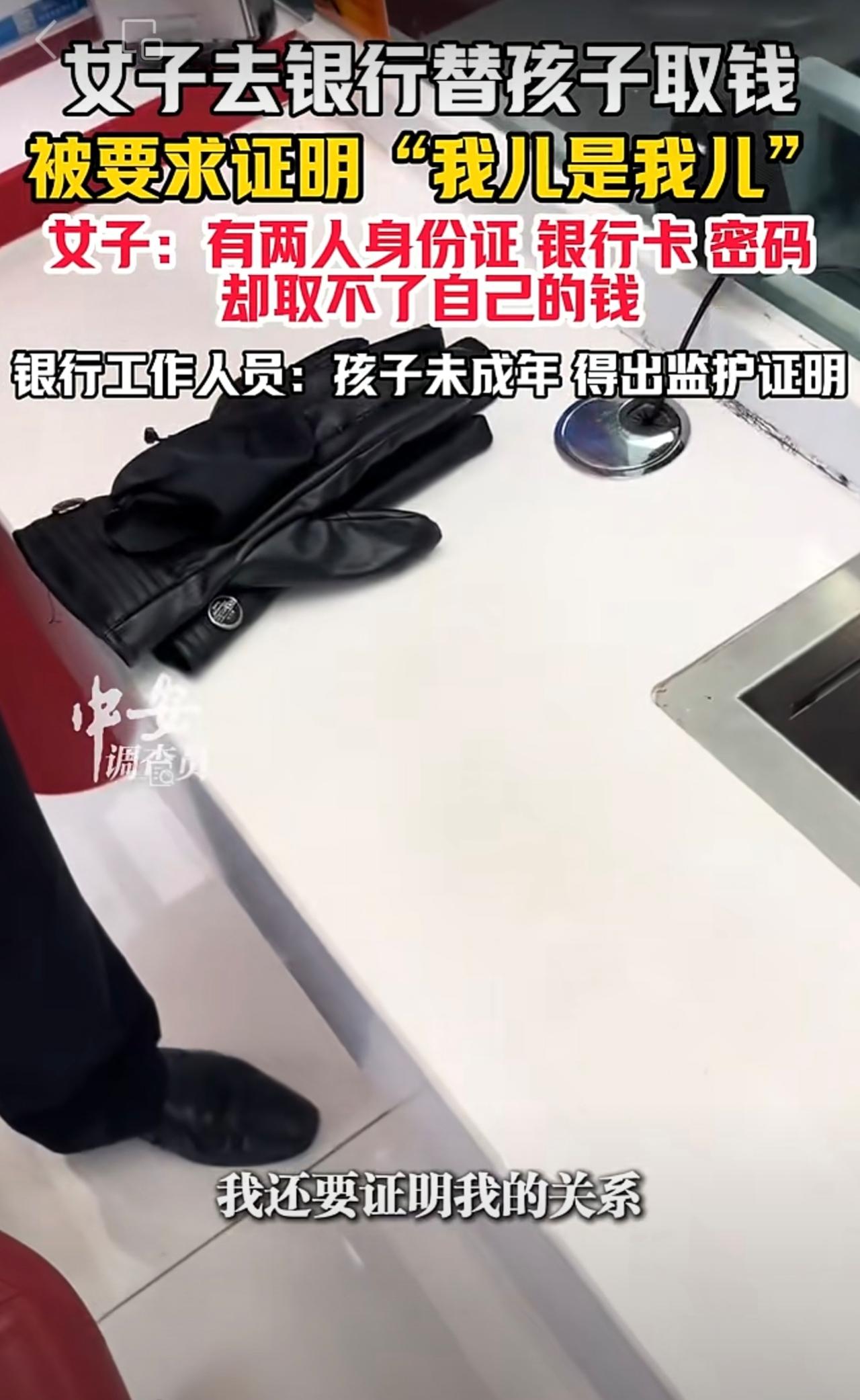 10月23日(发布),山东。女子去银行替孩子取钱,被要求证明“我儿是我儿”。女子:有两人身份证、银行卡、密码,却取不了自己的钱。银行工作人员:孩子未成年,得出监护证明。(编辑:琳琳)