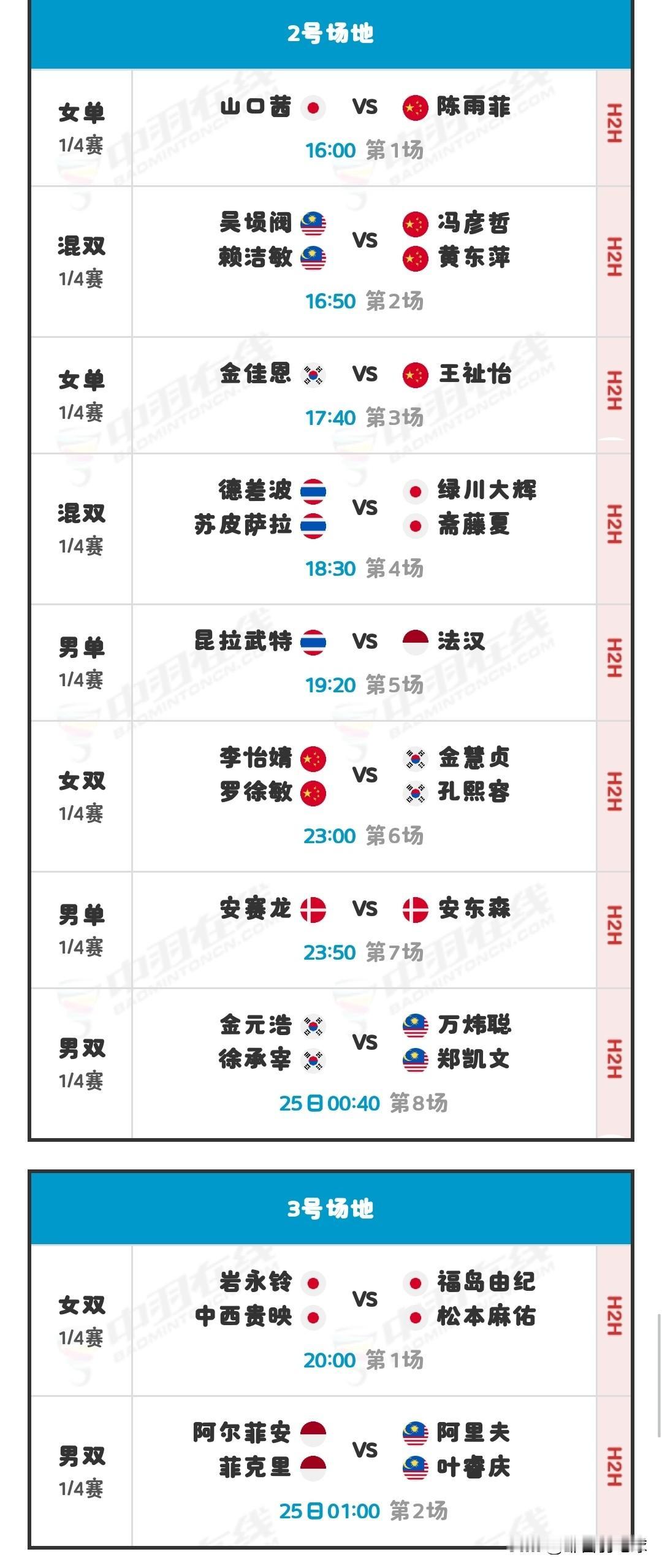 10月24日法国羽毛球公开赛1/4决赛安排 国羽昨日战绩为8胜3负。酱板鸭组合历经三局苦战,被马蒂亚斯/博尔逆转淘汰;浩瀚组合连丢两局,不敌阿里夫/叶睿庆。至此,国羽男双全军覆没。鲍骊婧/张殊贤同样连输两局,败于陈康乐/蒂娜拍下,他们均止步16强。 今日将进行1/4决赛,一、二号场地于北京时间16:00开赛,三号场地20:00开赛。对阵分别为李诗沣vs渡边航贵,陈雨菲vs山口茜,高昉洁pk安洗莹,凡晨组合vs陈康乐/蒂娜。国羽今日皆面临硬仗,关注我,一同为国羽加油助威,详细对阵安排如下: 国羽赛程 羽毛球 羽毛球爱好者 羽毛球比赛 国羽决赛名单 国羽 国羽加油 李诗沣 陈雨菲