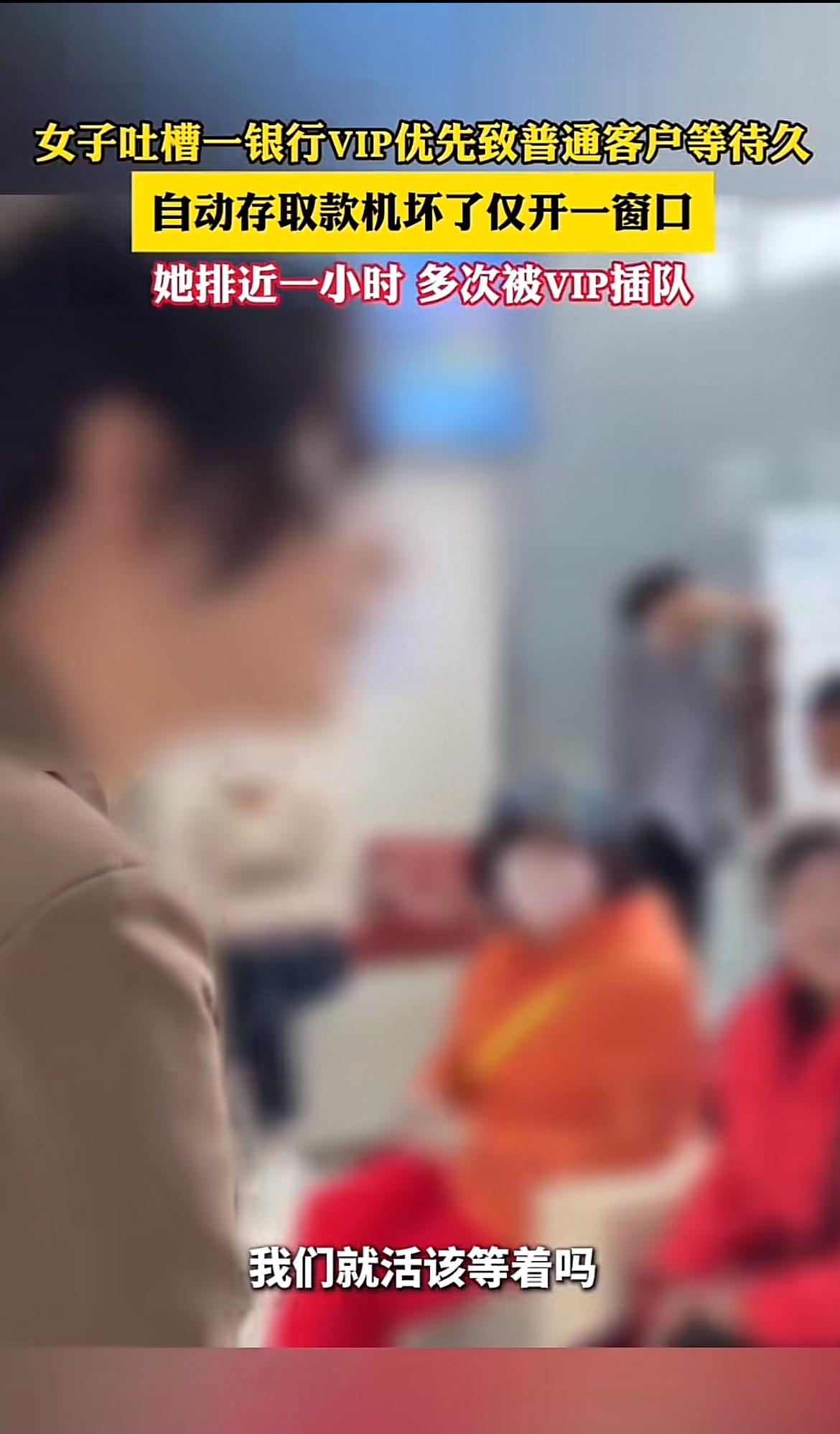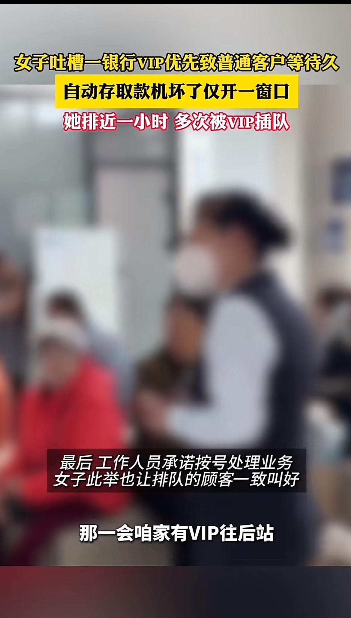 10月辽宁一女子可把银行的服务问题狠狠吐槽了一把。自动存取款机坏了,银行就开一个窗口。女子取号后,多次被VIP插队,等了快一小时,眼瞅要轮到自己,又来个VIP插队。她就想办个存取款业务,咋就这么难。她质问工作人员“我们活该花时间等吗?”,这话说到排队顾客的心坎里了,大家都一致叫好。最后工作人员承诺按号处理业务。银行啊,VIP重要,普通客户也不能晾着,平衡好两边,别让普通客户寒了心。
