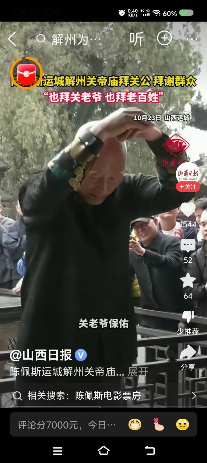 陈佩斯来到了关帝庙!—— 据报道,陈佩斯、刘芳菲等人来到了运城关帝庙。 陈佩斯向关羽像行礼,向游客致意:“关老爷保佑,拜关老爷,也拜老百姓。” 点评: 评论区有人问:“陈老师拜的姿势不对吧?” “他是党员么?” 有人问关公文化有什么新特色。 问题不少。 我一一解答。 一、爱用什么姿势用什么姿势,只要不是无礼举止。 二、各党派各阶层都可拜关公吧。这是民间信仰,不是宗教。 再说了,入乡随俗,参观景点,不礼拜难道砸场子? 三、优秀传统文化,革命文化,社会主义先进文化,并行不悖。历史的关公,今日的关公,未来的关公,都在这片土地上。来吧!运城欢迎您!
