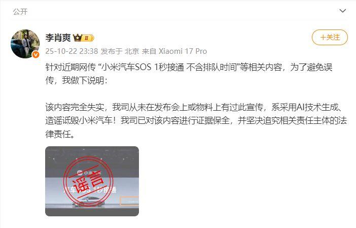 针对近期网传“小米汽车SOS1秒接通,不含排队时间”等相关内容,小米汽车副总裁李肖爽发文称,该内容完全失实,公司从未在发布会上或物料上有过此宣传,系采用AI技术生成、造谣诋毁小米汽车。公司已对该内容进行证据保全,并坚决追究相关责任主体的法律责任。