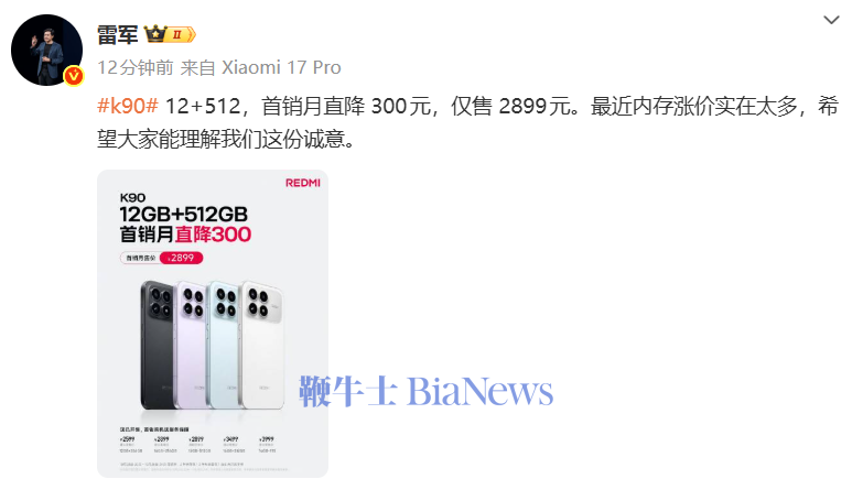 雷军表示,REMIK90“12+512”,首销月直降300元,仅售2899元。