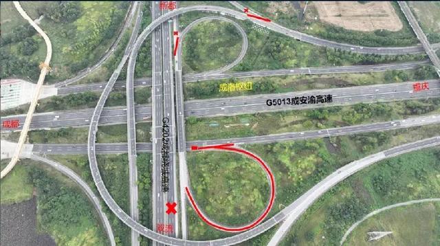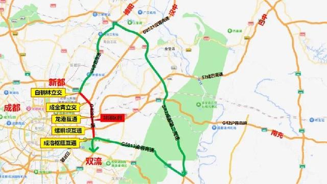路线2:通过成洛枢纽→G5013渝蓉高速公路→SA2成都第二绕城高速公路→S2成巴高速公路或G0521汉蓉高速公路或G5京昆高速公路→G4202成都绕城高速公路。