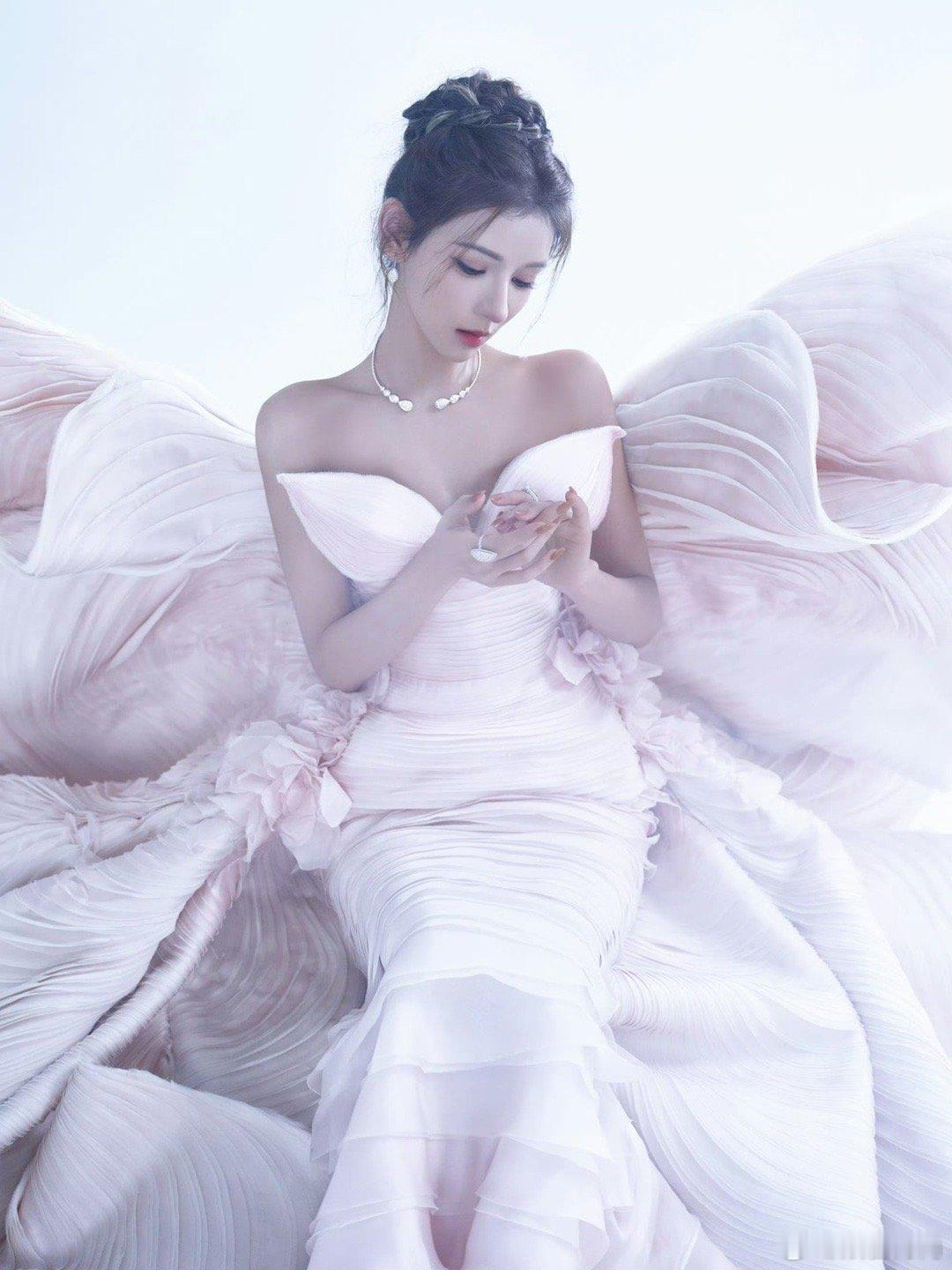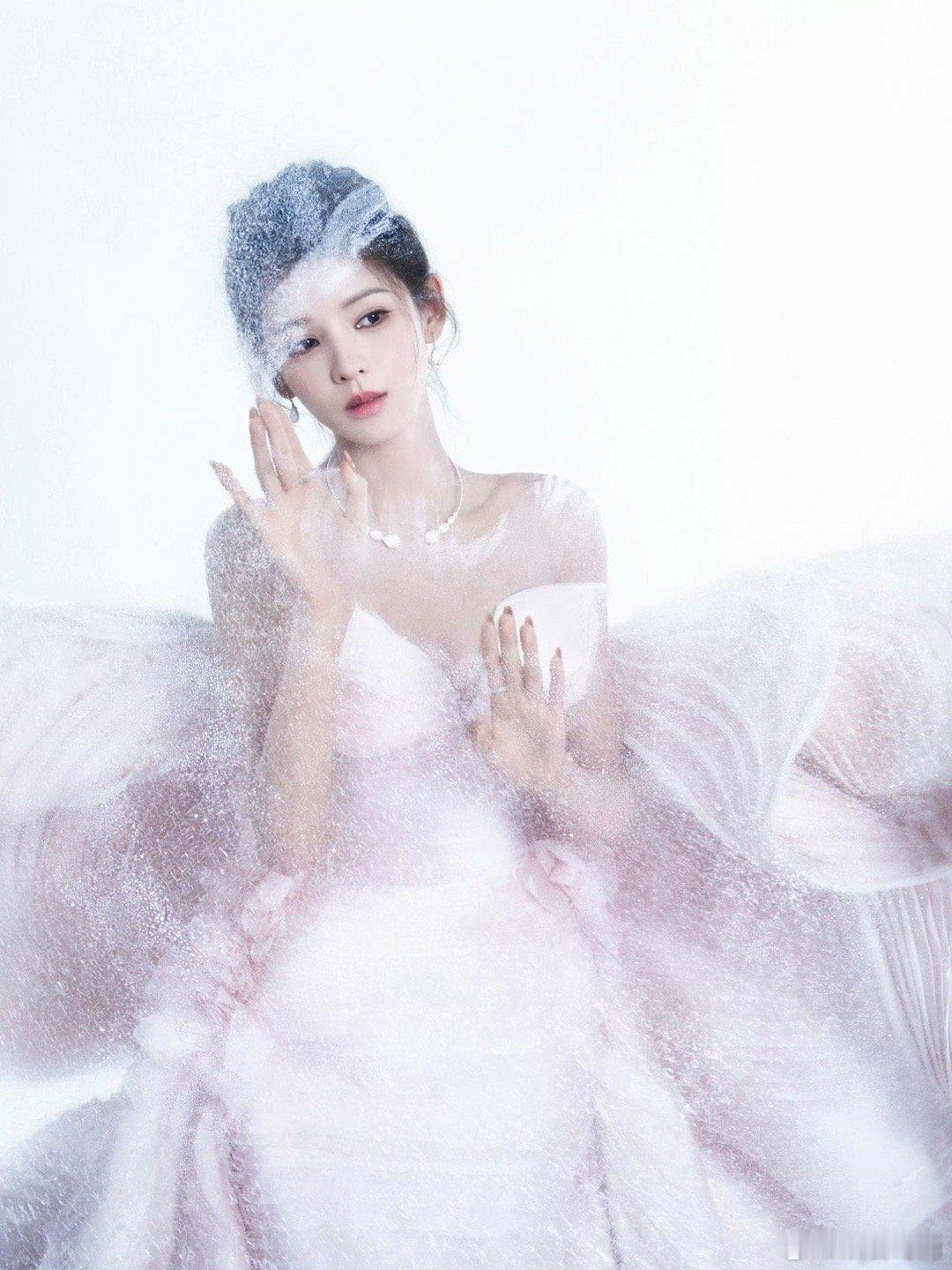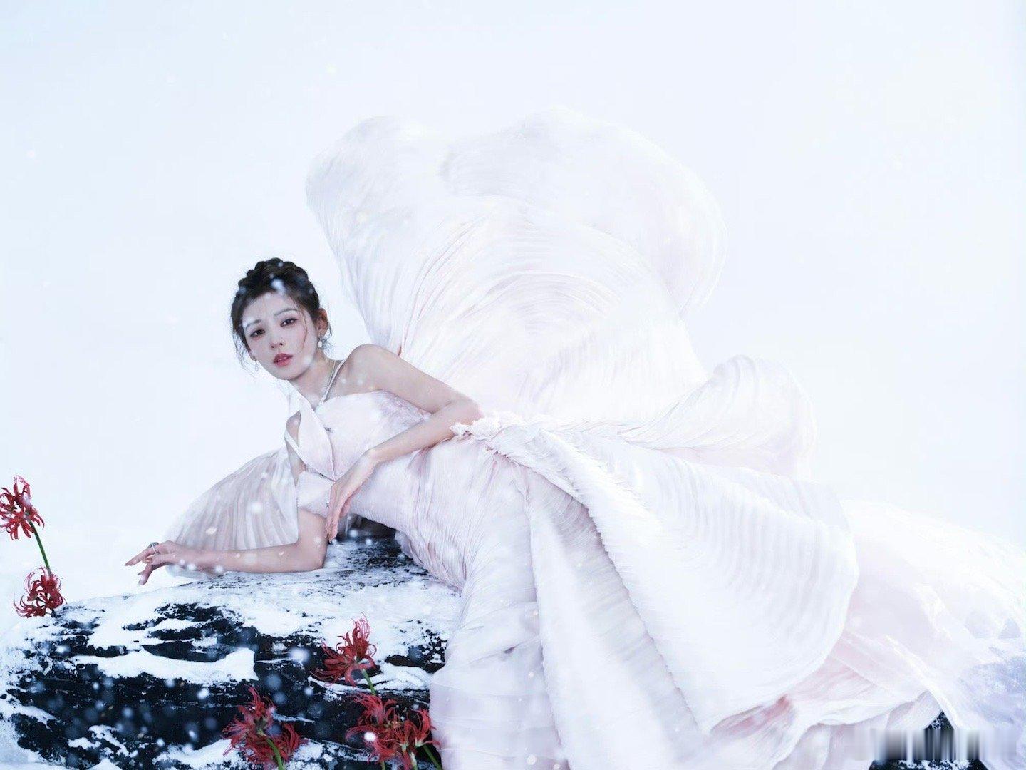 张予曦好美 这款定制白纱礼服与张予曦的气质相得益彰,层叠褶皱模拟冰雪花瓣的形态栩