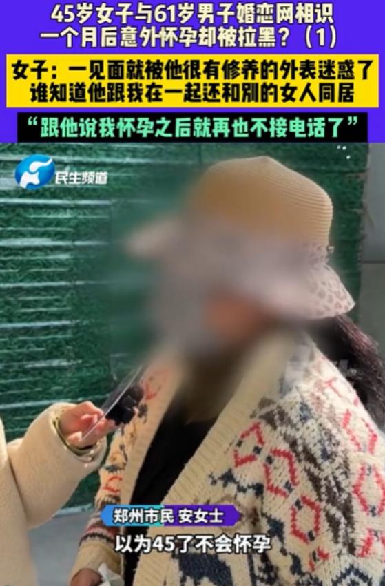 河南郑州,45岁女子与61岁男子谈恋爱,一个月后意外怀孕,不料,当她把这个好消息告诉男子后,却遭男子无情拉黑,女子无奈求助媒体,哭诉:我是被他很有修养的外表迷惑,谁知他跟我在一起还和别的女人同居,再次见到男子,女子情绪激动大吼:你的孩子在我肚子里,一天我都恶心!   河南郑州街头,45岁的安女士攥着孕检单,指尖泛白,这张单子本该是惊喜,离异独自带娃的她,终于盼来能搭伴过日子的人,可现在只剩满心冰凉。   事情得从一个月前说起,安女士被母亲催着找对象,点开婚恋网,刷到61岁的刘先生。   两人约在公园见面,刘先生头发虽白,说话却温和,递水时手指都透着客气,举止看着比实际年龄年轻不少,安女士当下松了口气,觉得年纪大些稳当,只要对自己好就行。   两人迅速热络,几乎天天黏在一起,刘先生嘴甜,说“生个男孩就给你买套房”,连孩子名字“刘路坦”都想好了。   安女士渐渐放下戒心,直到某天撞见刘先生家里有个陌生女人,面对质问,刘先生只说“早分了,对方纠缠”,还当着那女人的面选了安女士。   没等疑虑完全消散,安女士发现自己怀孕了,45岁怀孩子不容易,她揣着孕检单找刘先生,想商量以后的日子。   可电话打不通,微信发出去全是红色感叹号,显然是被拉黑了,跑到刘先生住处,门锁都换了新的。   走投无路的安女士找了记者,镜头里,她眼眶红肿,声音发颤:“我就是被他那有修养的样子骗了,哪想到他跟我在一起时,还跟前女友同居。”   记者陪着找上门,门开的瞬间,安女士情绪直接炸了,她指着刘先生大吼,声音里全是愤怒和委屈:“你的孩子在我肚子里!我一想到就恶心!”   刘先生倒打一耙,先说“就是相处看看,没确立关系”,被问起发生关系,又甩锅“她主动的,我错就错在没拒绝”。   提到孩子,他更是一脸不屑:“谁知道是谁的?她指不定跟多少人有关系,”末了还污蔑安女士骗了他4000块钱和一台电脑。   后来被逼问急了,刘先生才松口,承认当时只是和前女友闹矛盾,并没真分手,说安女士是“趁虚而入”,这话彻底击垮了安女士,她哭着拿出聊天记录,上面全是刘先生当初的承诺。   民警很快到场,听完经过,建议先调解,不行就走法律程序,安女士当场提出做亲子鉴定,刘先生嘴上说“是我的就担责”,眼神却躲躲闪闪。   也有人替安女士可惜,说婚恋网识人得擦亮眼睛,别光看表面修养,多观察些日子总没错。   眼下调解还没结果,安女士站在人生岔路口,留不留孩子都是难题,这场闹剧给所有人敲了警钟:感情里,甜言蜜语再好听,也不如人品可靠。   那么你对这个事情有什么看法呢?欢迎在评论区留言。