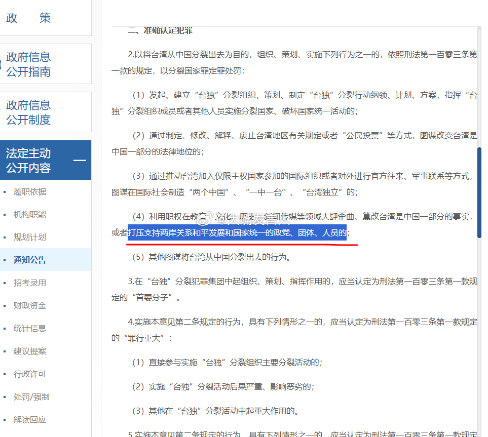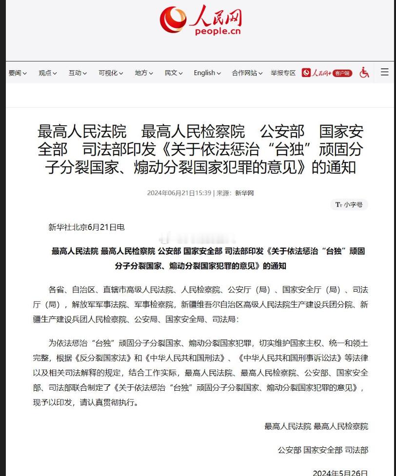 2024年6月,我们颁布了《关于依法惩治“台独”顽固分子分裂国家、煽动分裂国家犯罪的意见》,里面明确规定,,以分裂国家罪定罪处罚的条件之一是(图2),“打压支持两岸关系和平发展和国家统一的政党、团体、人员的”[怒][怒]