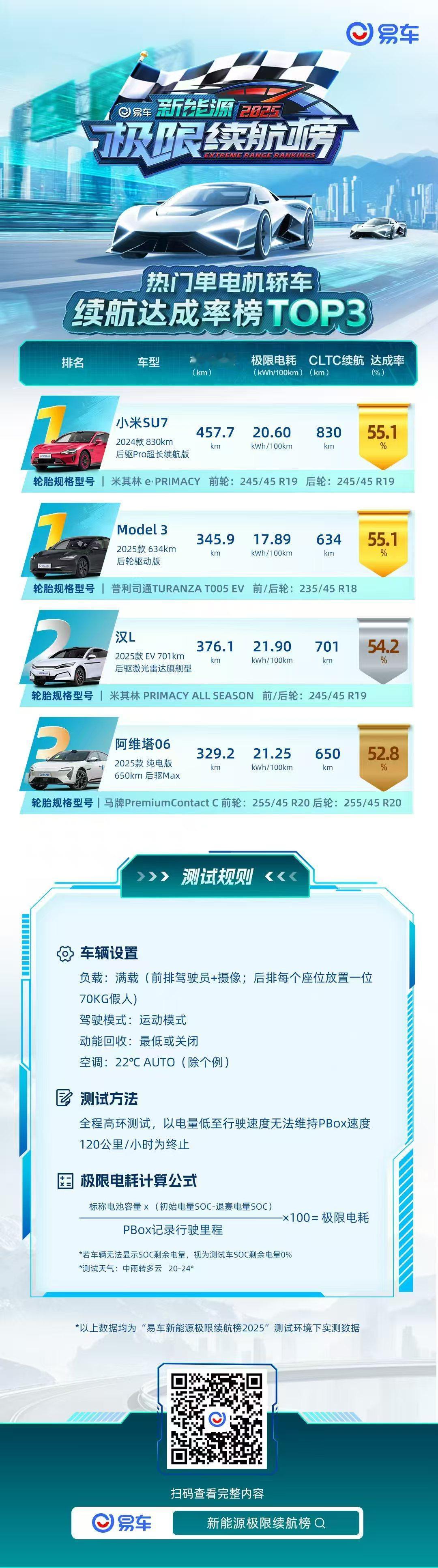 易车2025新能源极限续航榜揭晓! 60+车型满载120km/h高环测试,真实还