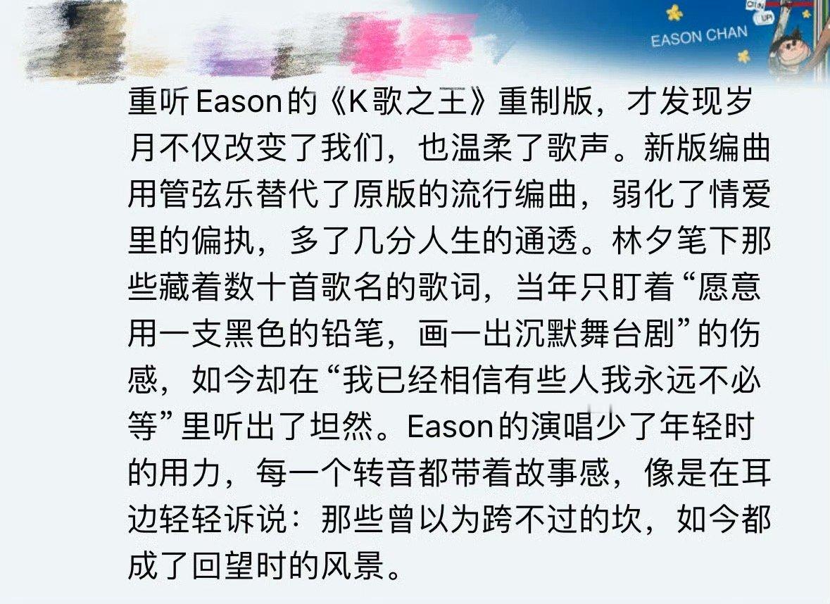 25年了陈奕迅依旧是内娱的K歌之王 陈奕迅用实力证明经典从不过时!《K歌之王》重制版以管弦乐重新编曲,九段独奏暗藏巧思,粤语的深情与国语的细腻被他完美诠释,25年过去,他依然能唱进每个有故事的人心里。
