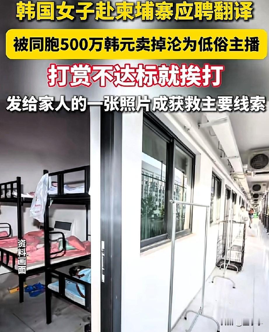 韩国,一女子去柬埔寨应聘翻译工作后,被同胞用500万的韩元给卖了,做低俗的主播,只要做的不达标,就会被挨板子,不过好在最后的结果是好的。网友: 500万韩元等于25万人民币? 女子被应聘上后,只身一人赶往柬埔寨,机场接机的也是一名韩国人,人很热情,看起来谦谦有礼。 女子被送到公寓后,就联系了家人报平安,随后,三个陌生男人闯了进来,直接抢走她的手机和护照,女子也反抗过,但是不是对方的对手,只能被对方用暴力给控制住了。 事发一个月后,家人也凭着当初女子发布的一张照片搜索定位,在与柬埔寨这边的警察,顺利把女子给解救出来了。 不得不说,这位韩国女子也太幸运了。 有网友指出,金三角最危险地区,千万不要去旅游,更不相信熟人引导。 还有网友表示,总是有人相信,天上会有馅饼,钱多么多么好赚,其实,自己就是天选之人。 生活就要平凡点,那些挣习惯大钱的人,小钱一般可是看不上,其实,大钱就是鱼饵,最后一场空,弄不好还搭条命。 且行且珍惜!