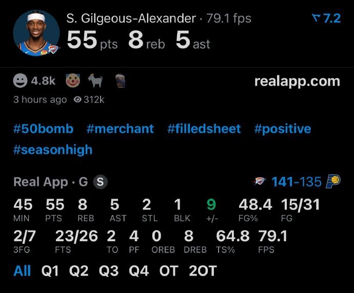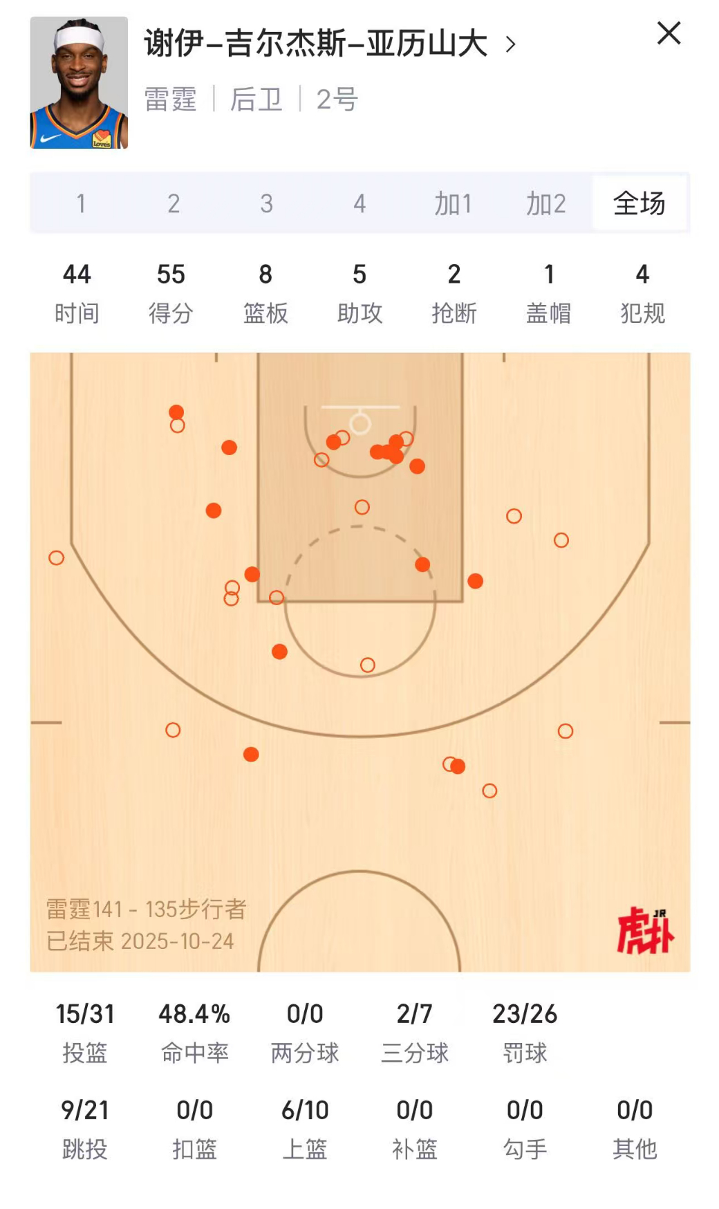 雷霆双加时141-135战胜步行者,亚历山大砍下生涯最高分——55分8篮板5助攻。