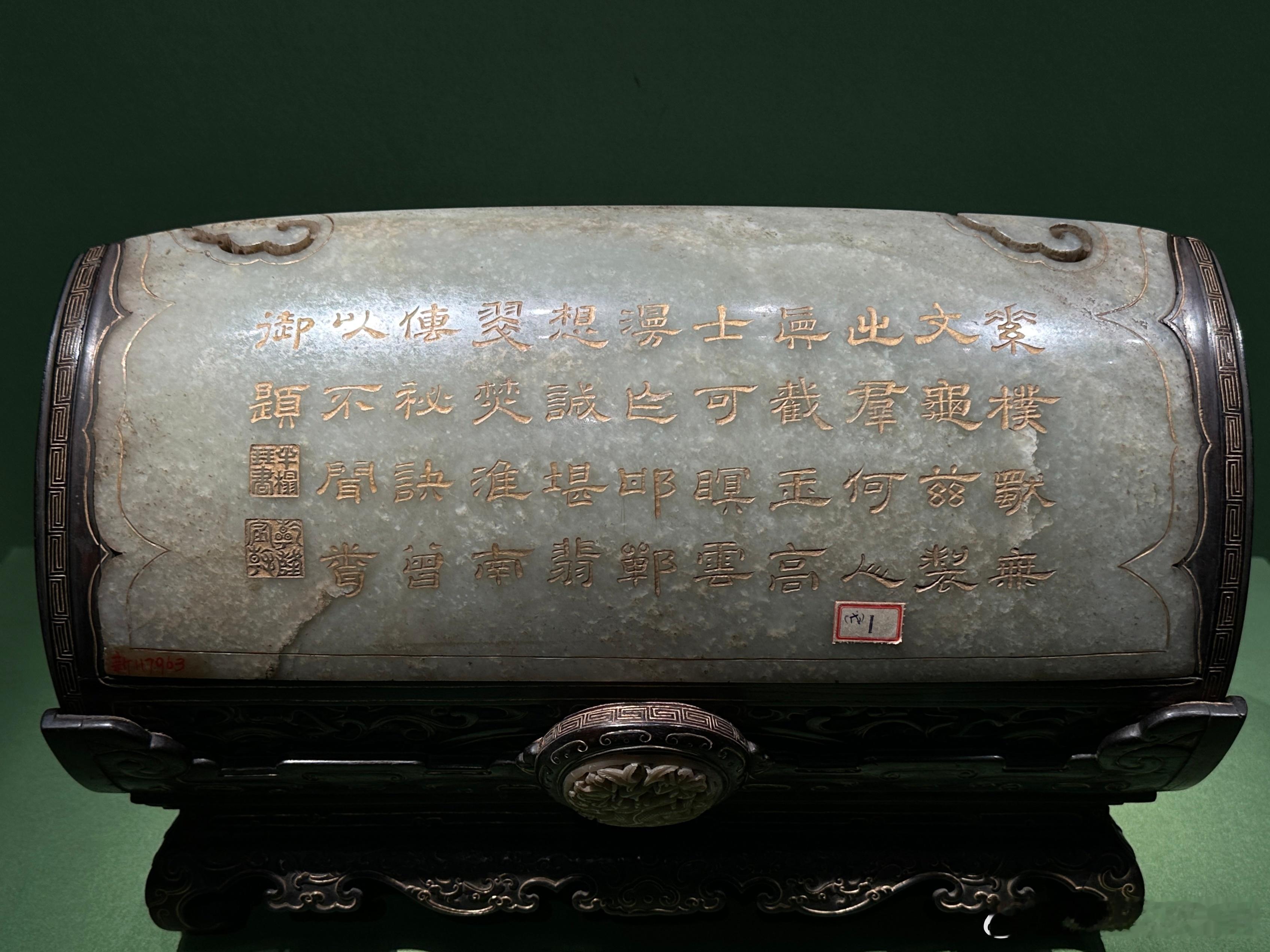 清宫旧藏,1924年被逊清皇室内务府抵押给盐业银行。玉枕为青玉质地,两端作垂云,有元代风格。两面均填金刻有乾隆御制诗文。配紫檀嵌金丝镂雕枕座,其正面、背面中央分别镶嵌白玉灵芝佩、鹿纹饰。