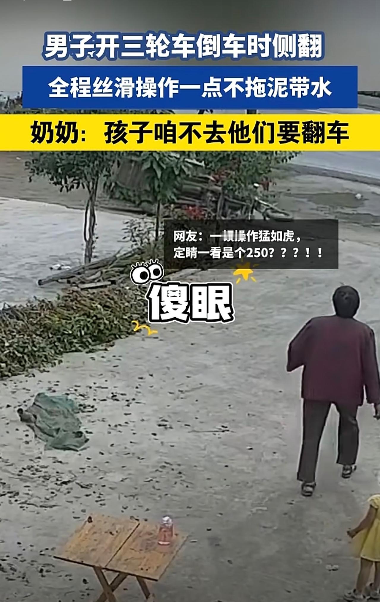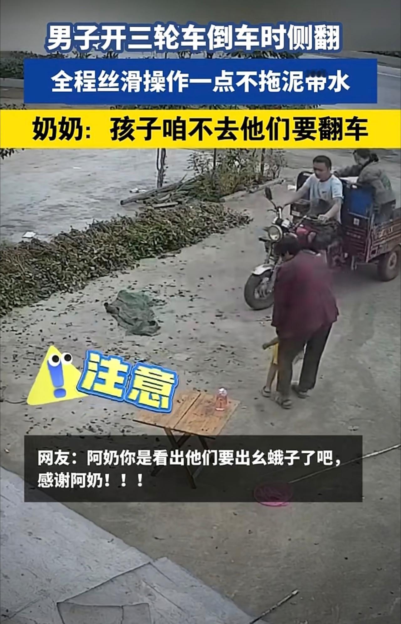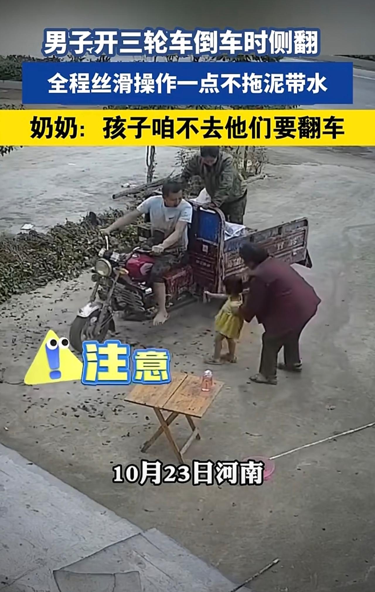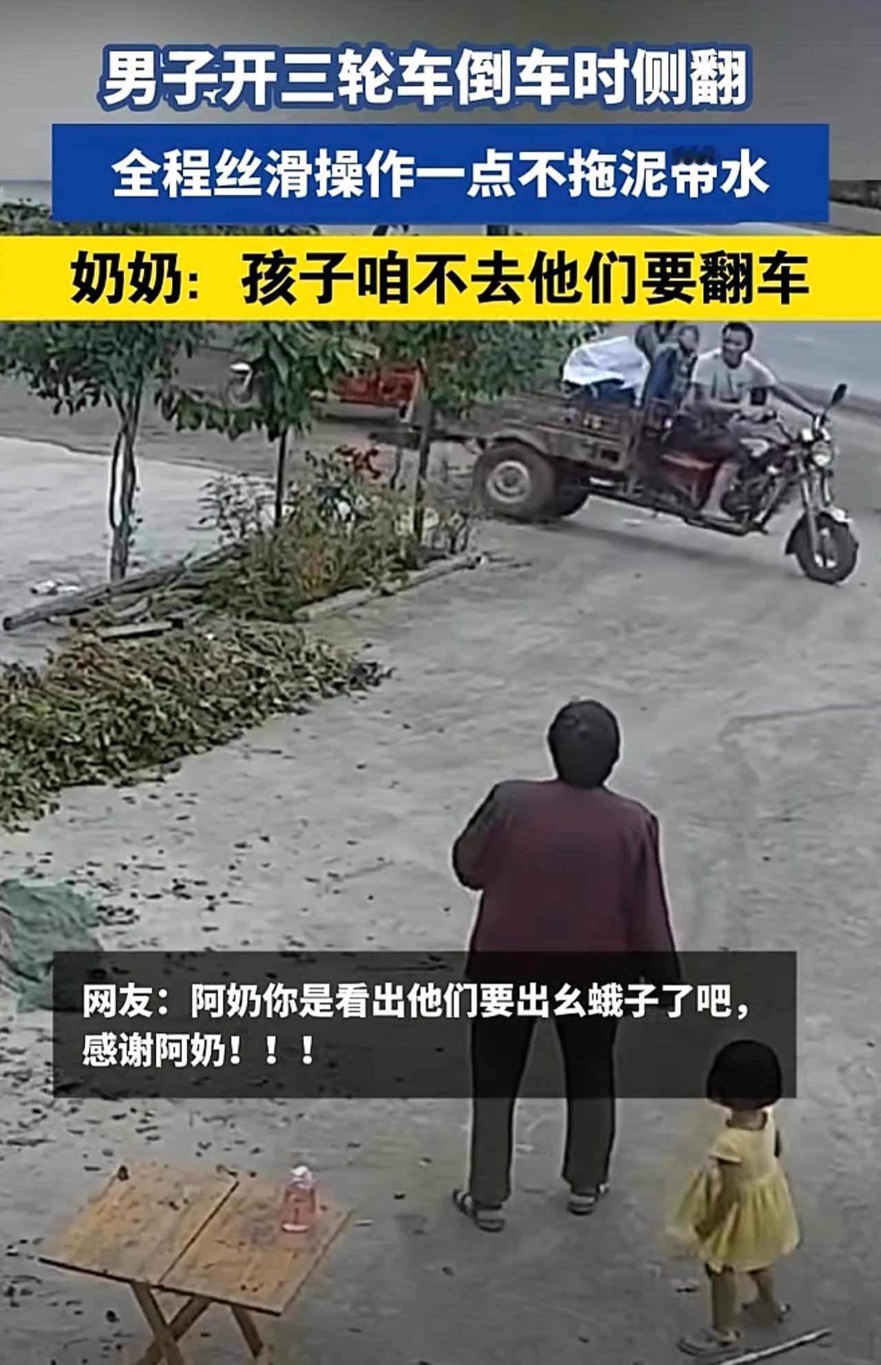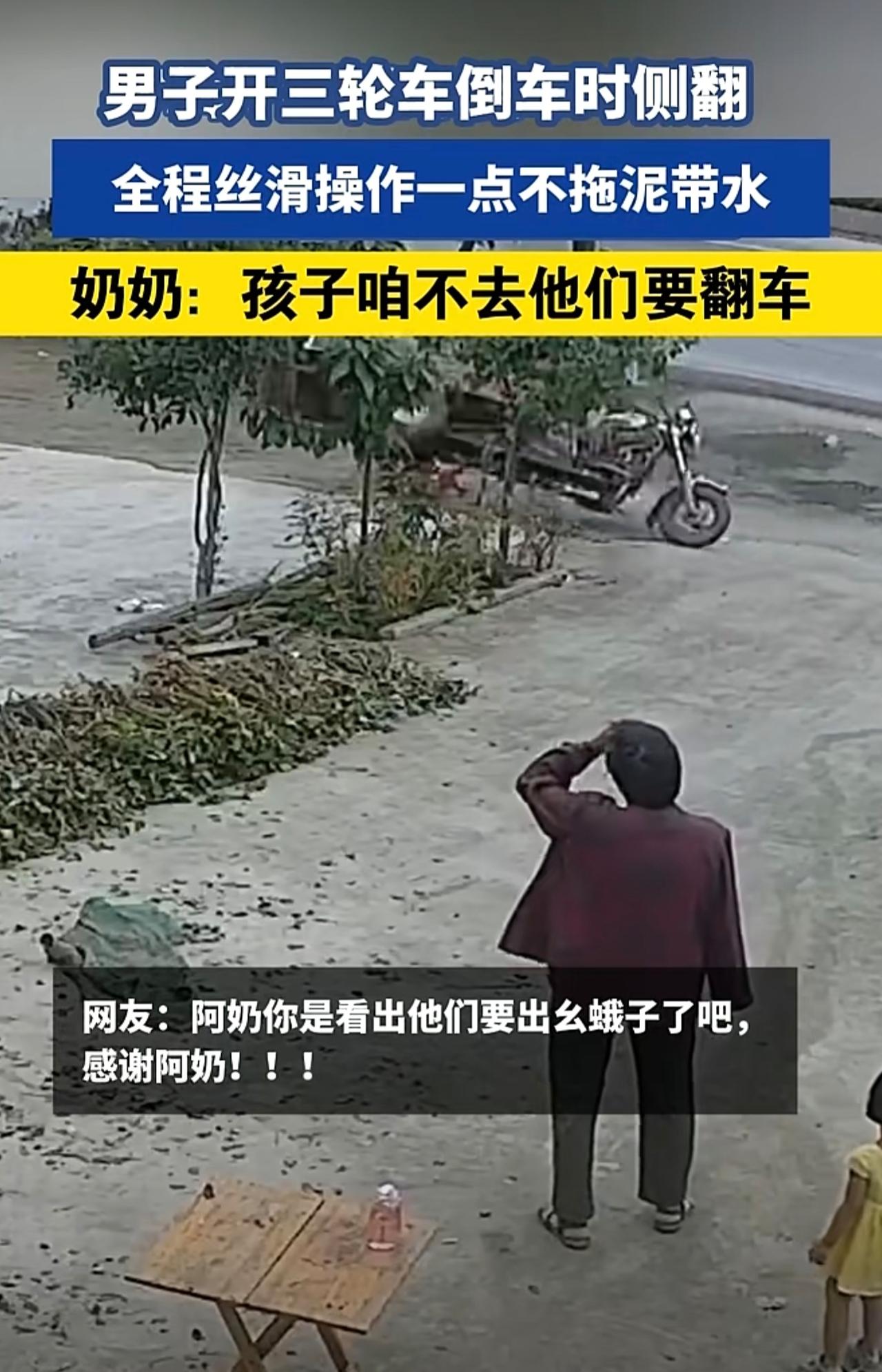 男子开三轮车倒车时侧翻,丝滑操作一点不拖泥带水,奶奶:孩子咱不去他们要翻车