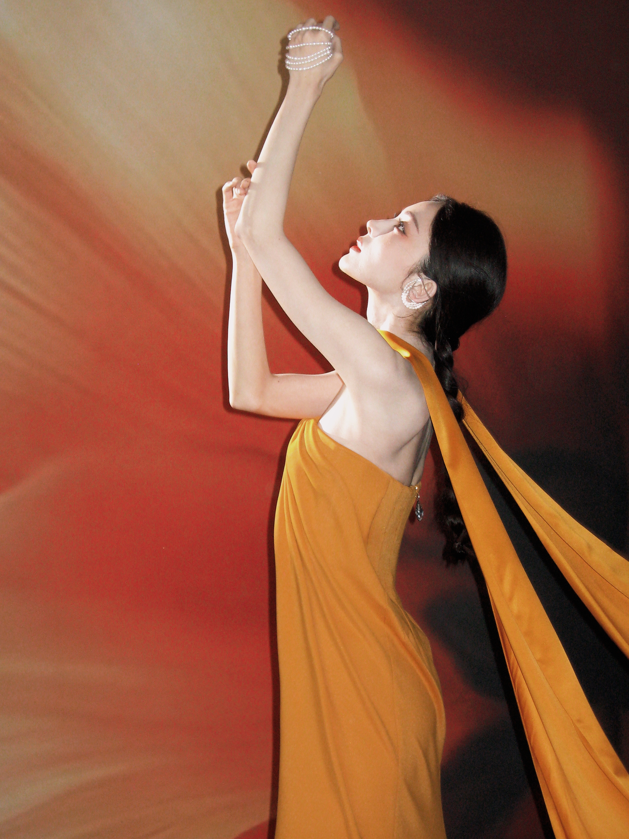 古力娜扎 暖橙曳地如落霞,在复古拱廊间舒展身姿,将时光的柔意,裁成独属于此刻的优雅诗行。娜扎把橙色穿的好高级