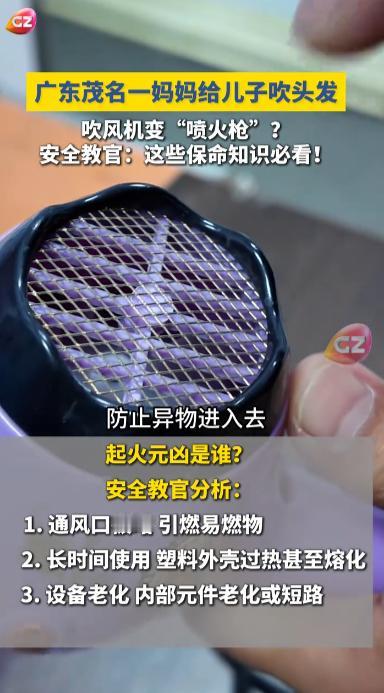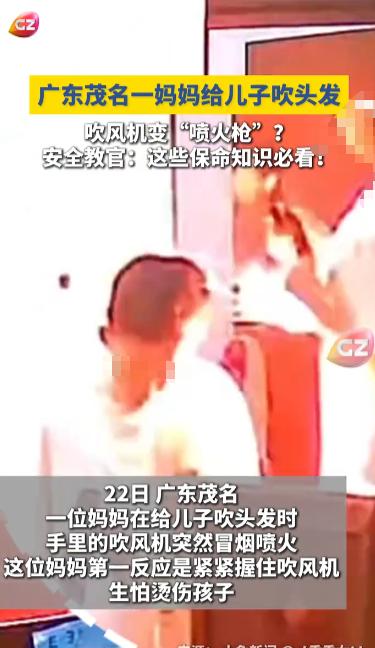 “防不胜防!”10月22日,广东茂名,一女子正用电吹风给儿子吹头发,谁知电吹风竟然突然变成“喷火枪”,溅出的火花把孩子的衣服都烫出了几个洞,女子赶忙拔掉电源,网友:这也太吓人了! 几乎家家都有吹风机,不论男女洗完澡都会用吹风机吹吹头发,可在使用吹风机前,最好是先检查一下通风口。 一女子刚帮儿子洗完头,她拿出家中的电吹风,插上电源,开始给孩子吹干头发,谁知,女子开启电吹风没一会,通风口突然开始喷火,吹风机秒变成“喷火枪”,溅出来的火星子把孩子身上的短袖都烫出好几个洞。 这可把女子吓了一跳,但她怕烫到孩子,走远了才将电吹风扔掉,电源也被女子拔了下来,随后她将一旁惊魂未定的孩子拉到身边安慰。 女子感觉到一阵阵后怕,孩子头发比较短,如果当时吹头发的是自己,估计头发已经着火了,还好没出现什么大意外。 那么,女子家的吹风机为什么会突然着火呢?其实这个可能性有很多,通风口被堵、内外部元件老换损坏等等。 不少网友觉得这也太吓人了,其实正确使用吹风机一般不会发生这种问题,以后使用吹风机时,可一定要小心谨慎! 信息来源:《一妈妈给儿子吹头发,吹风机变“喷火枪”?安全教官:这些保命知识必看!吹风机安全 家用电器隐患 》广州广播电视台