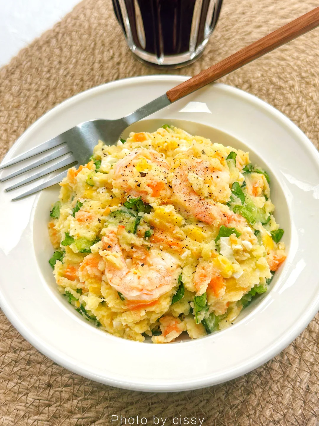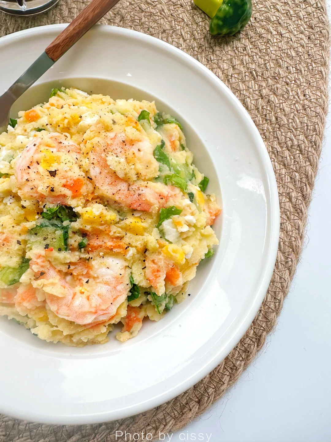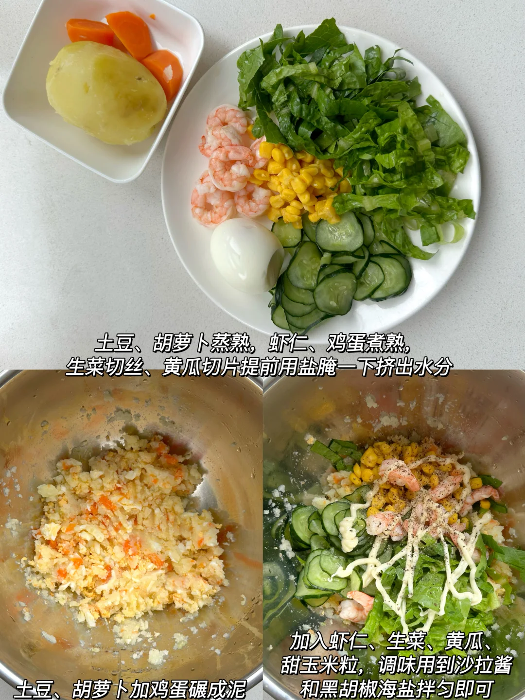 🥗今天吃低卡又满足的土豆泥虾仁沙拉,一盘包含了碳水蛋白质和蔬菜。 🧂调味用到约10g的低卡蛋黄酱和少许黑胡椒海盐,随便拌拌就可以啦! 🍤食材:土豆、胡萝卜、虾仁、黄瓜、生菜、甜玉米粒 ~