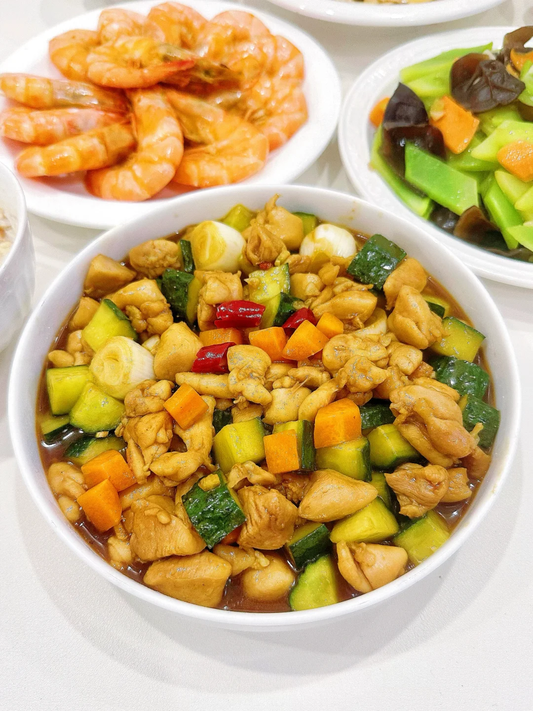 ✨今天吃: 🍗宫保鸡丁 🫑尖椒干豆腐 🥕莴笋炒木耳 🦐水煮虾 ~
