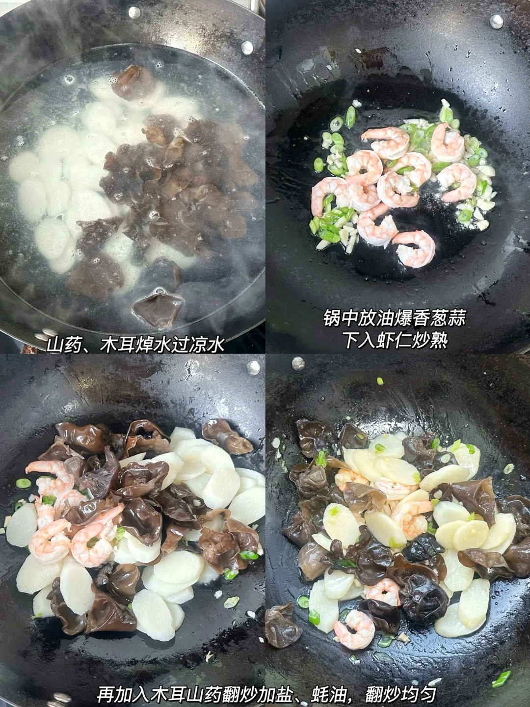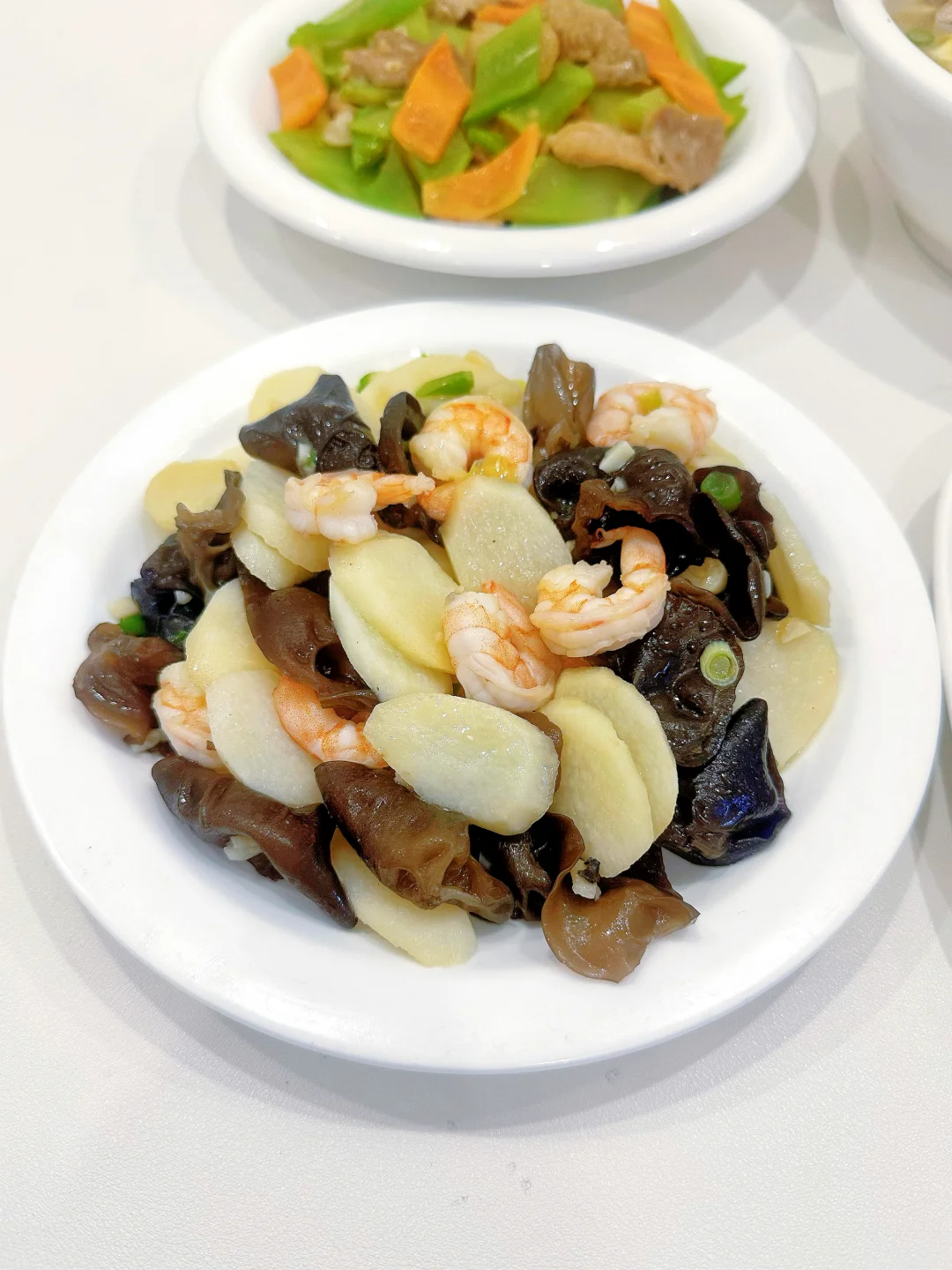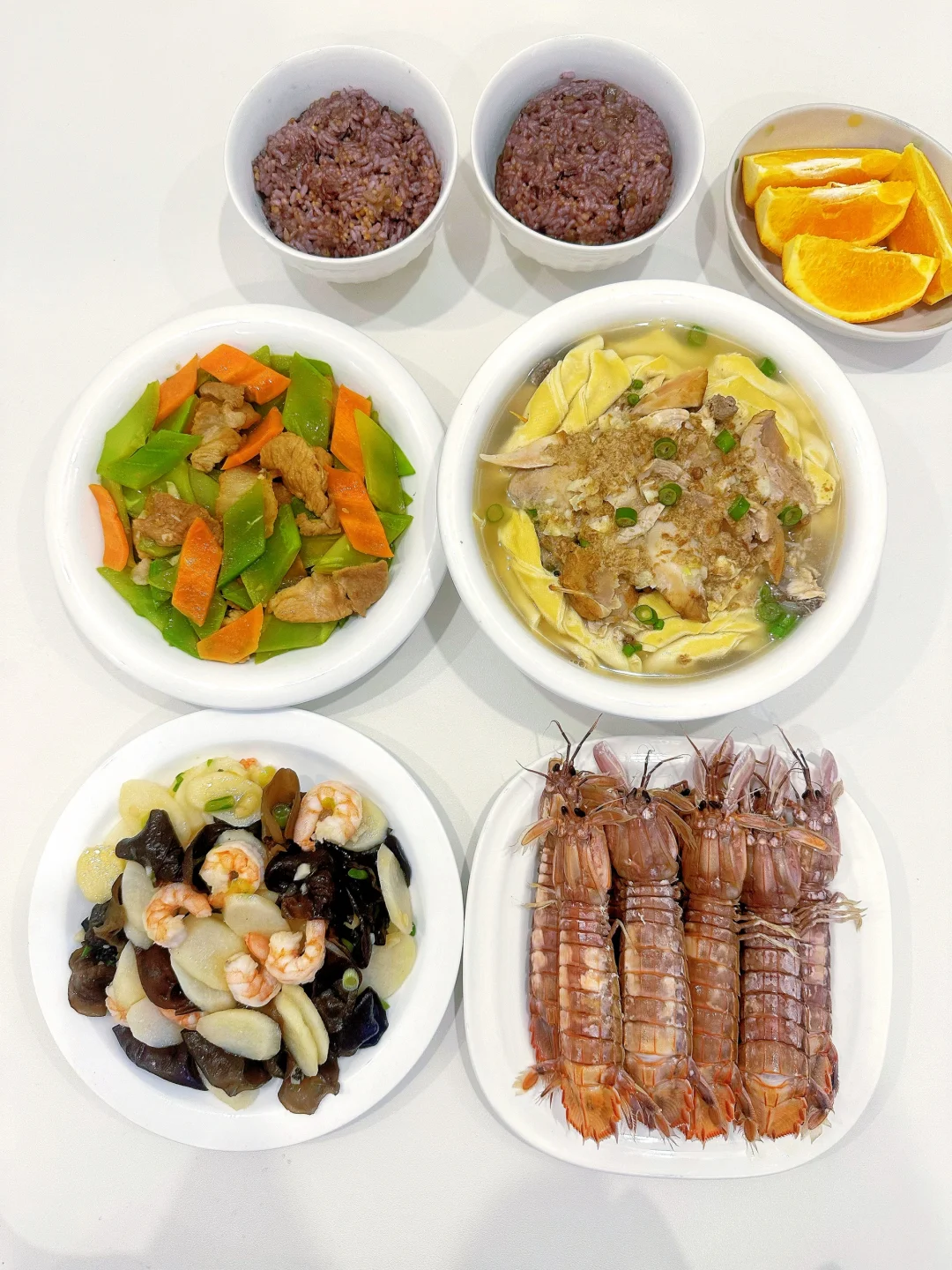 今天吃: 山药木耳炒虾仁 🥕莴笋炒肉 🍗鸡汤千叶豆腐 🦐皮皮虾 ~