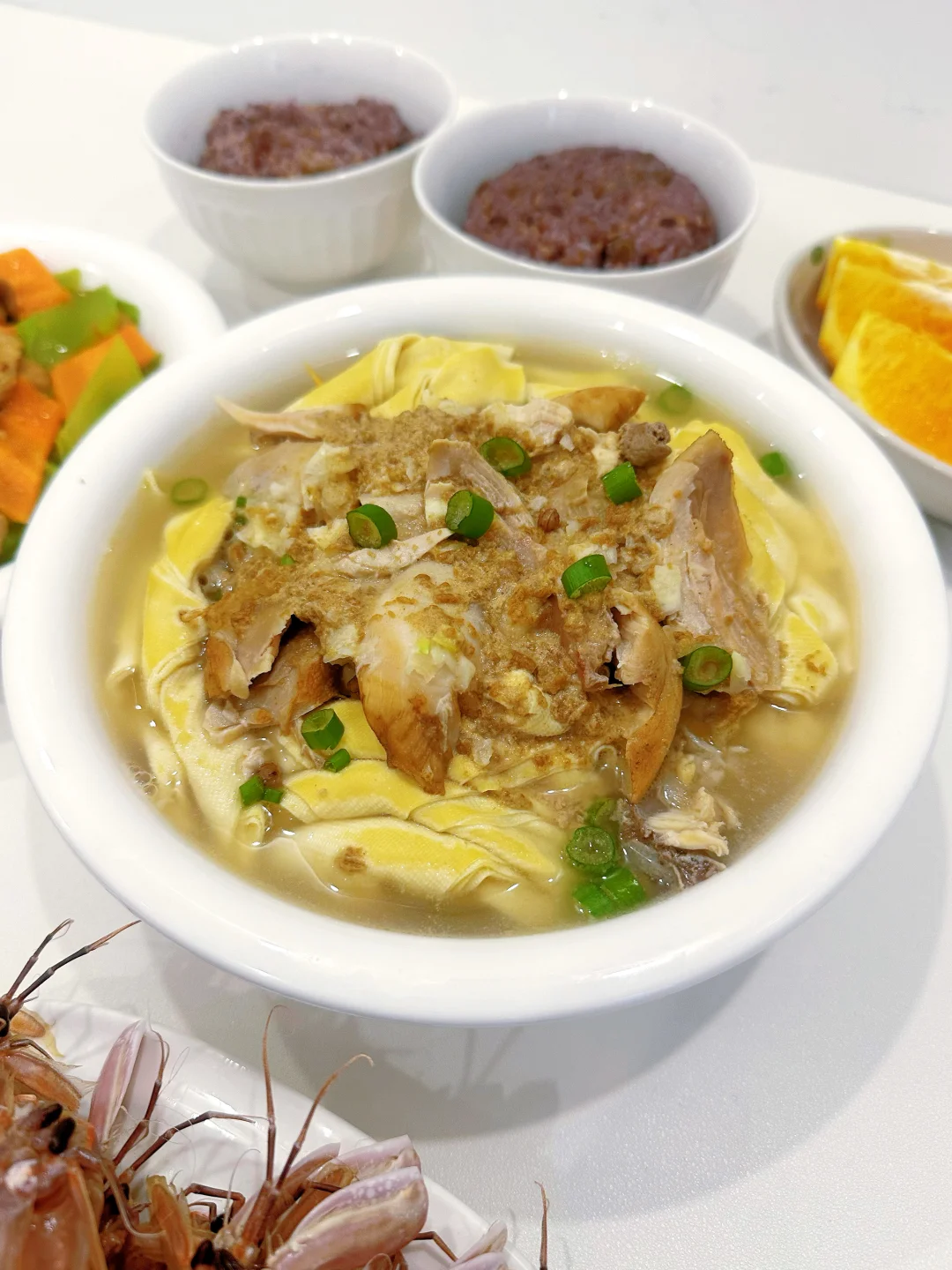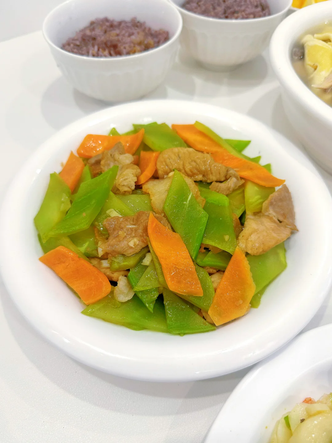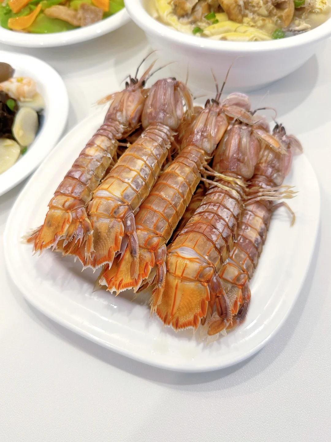 今天吃: 山药木耳炒虾仁 🥕莴笋炒肉 🍗鸡汤千叶豆腐 🦐皮皮虾 ~