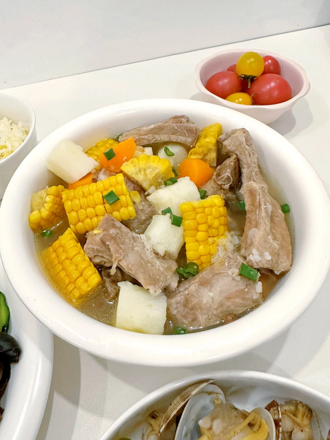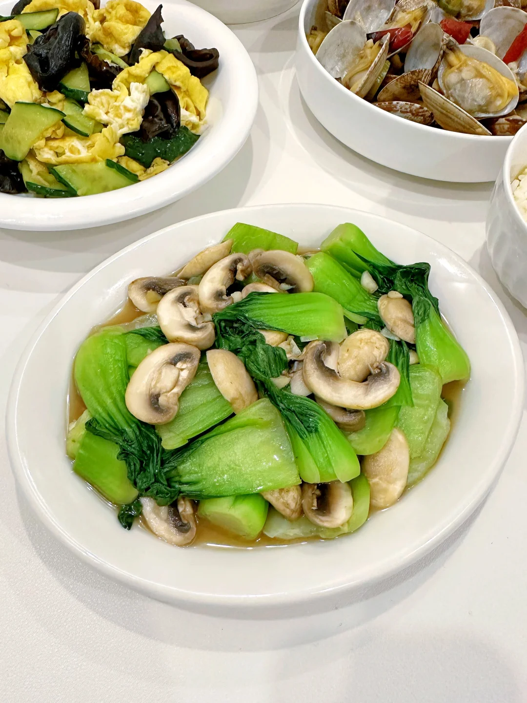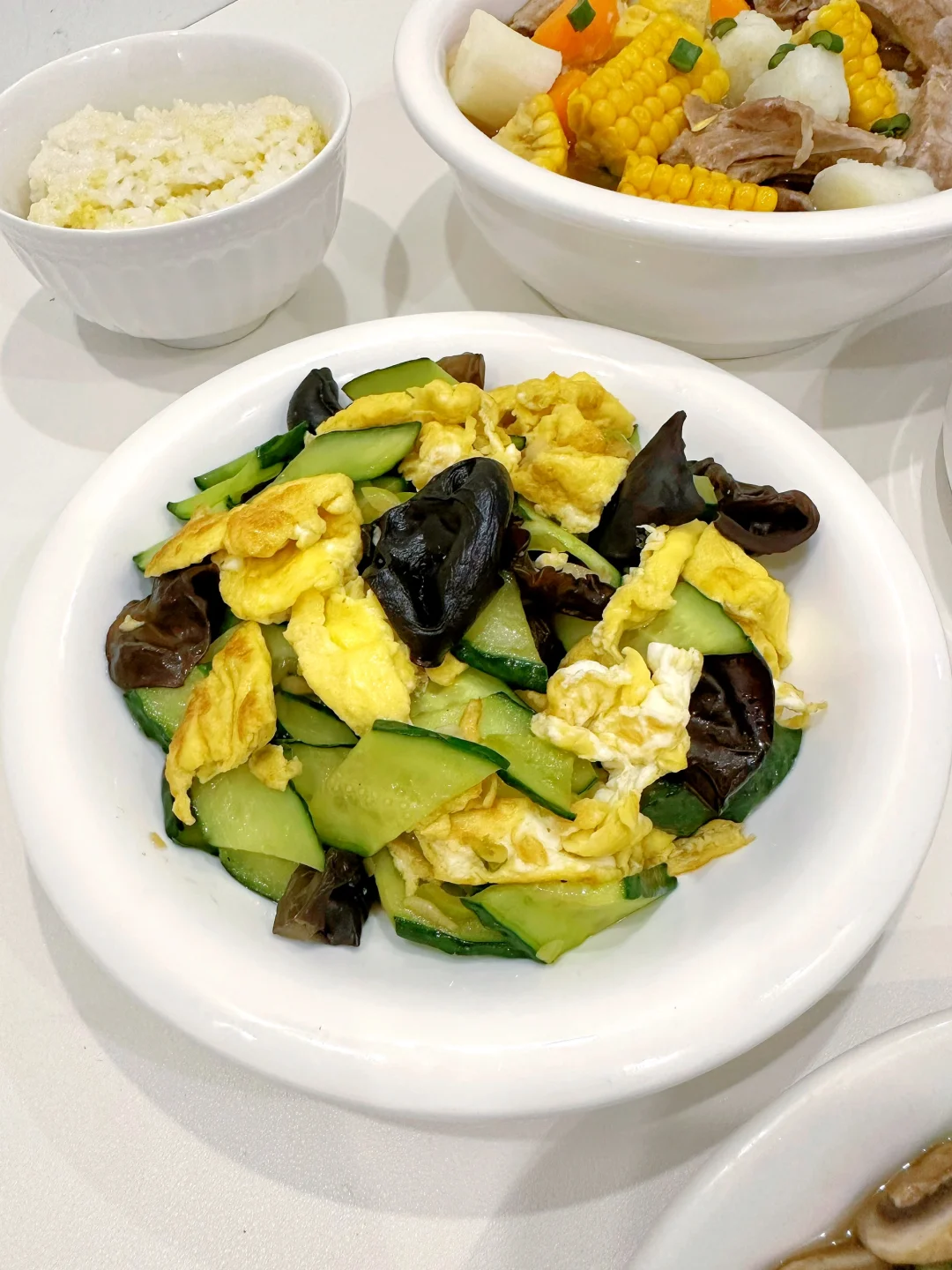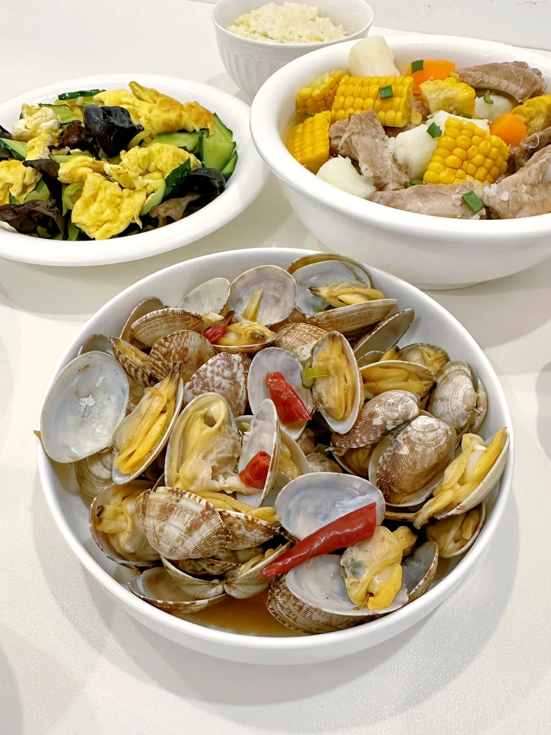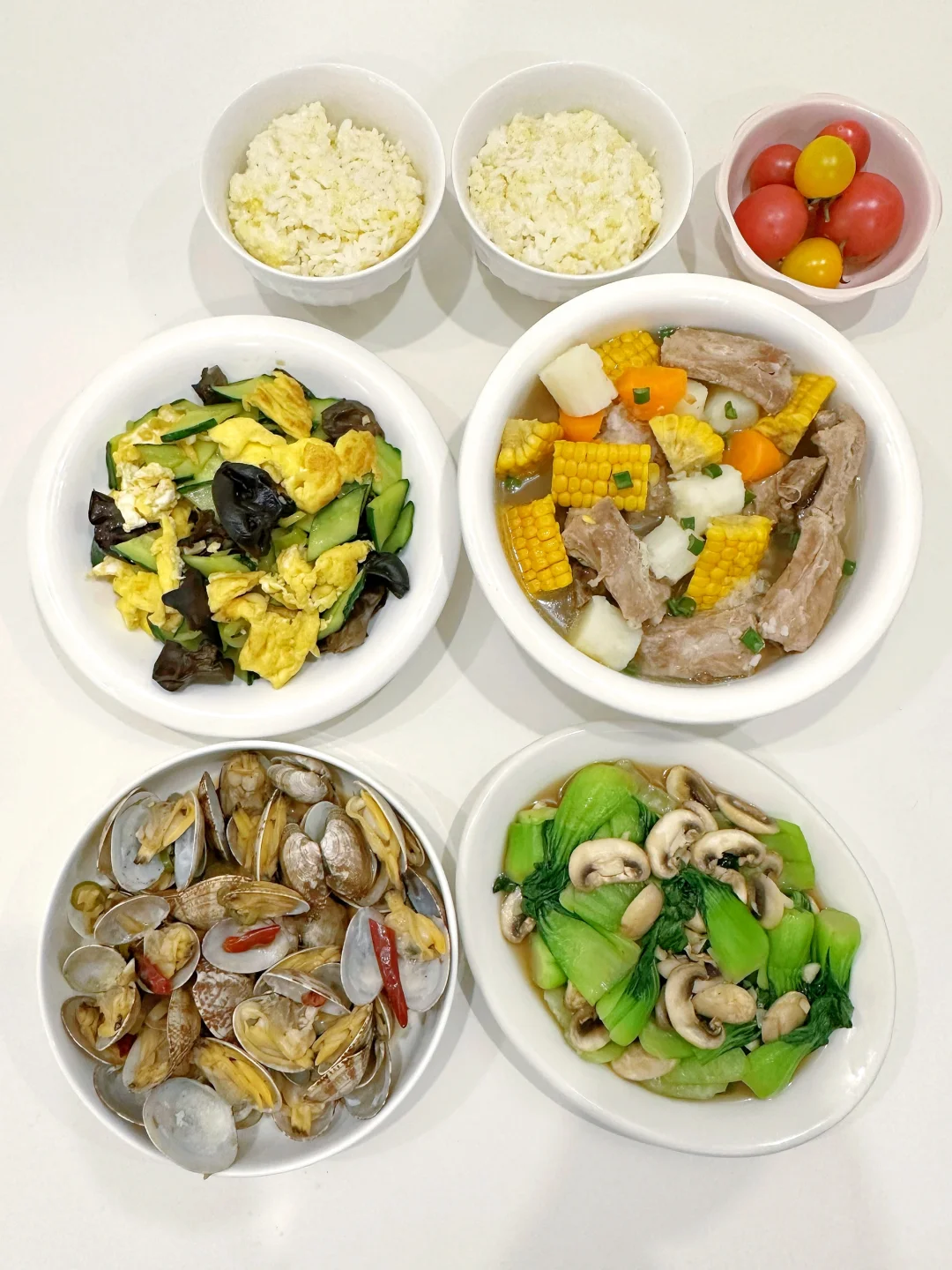 今天吃: 🥬口蘑上海青 🐚炒花甲 🥩山药玉米排骨汤 🥒黄瓜木耳炒鸡蛋 ~
