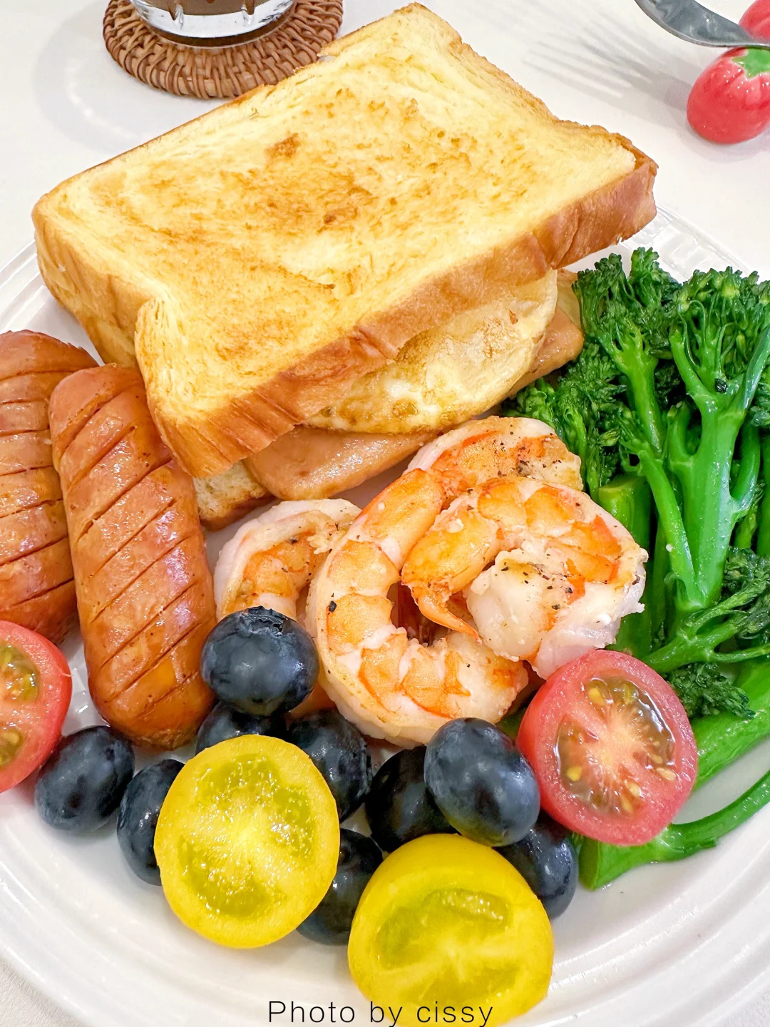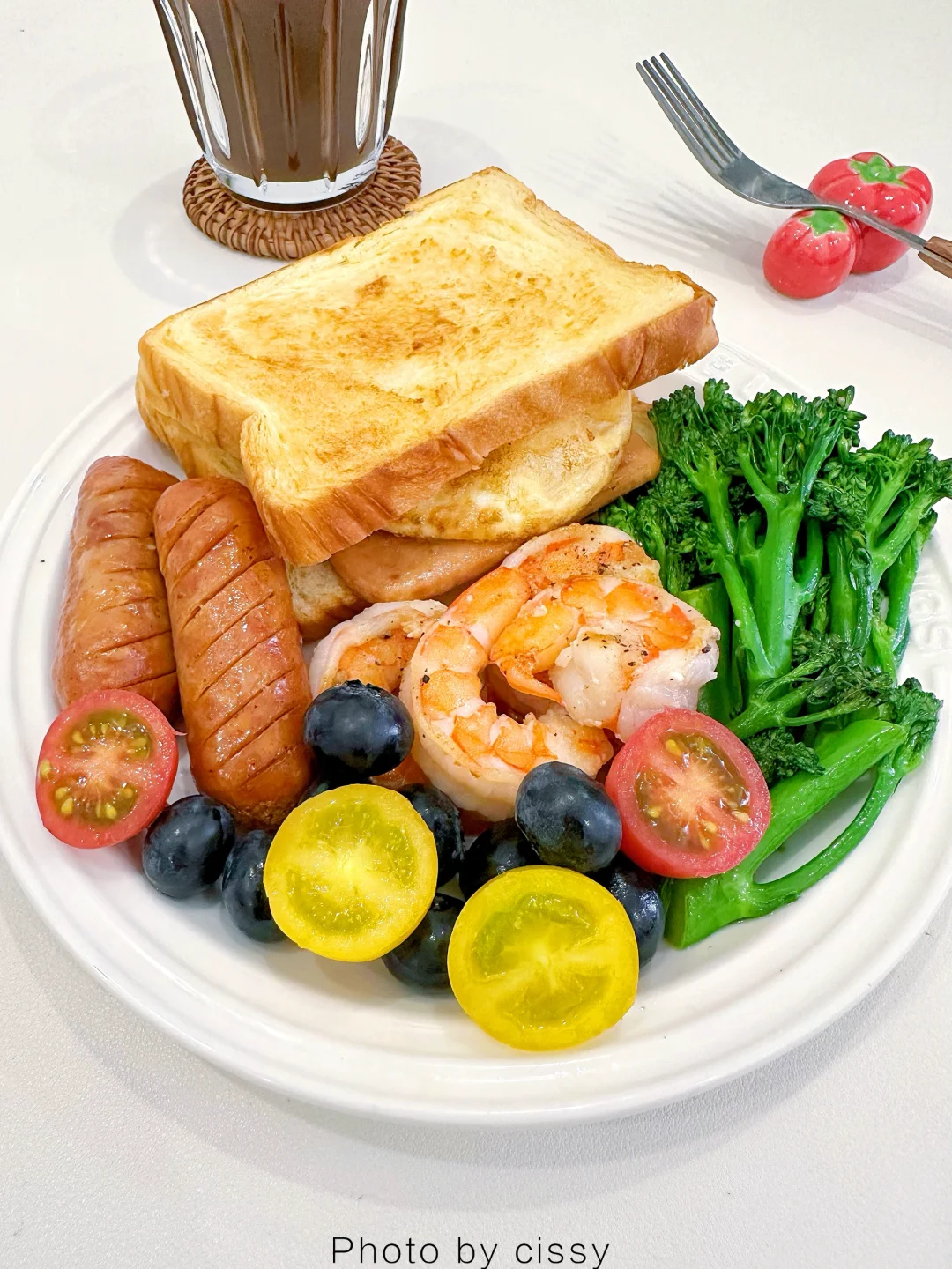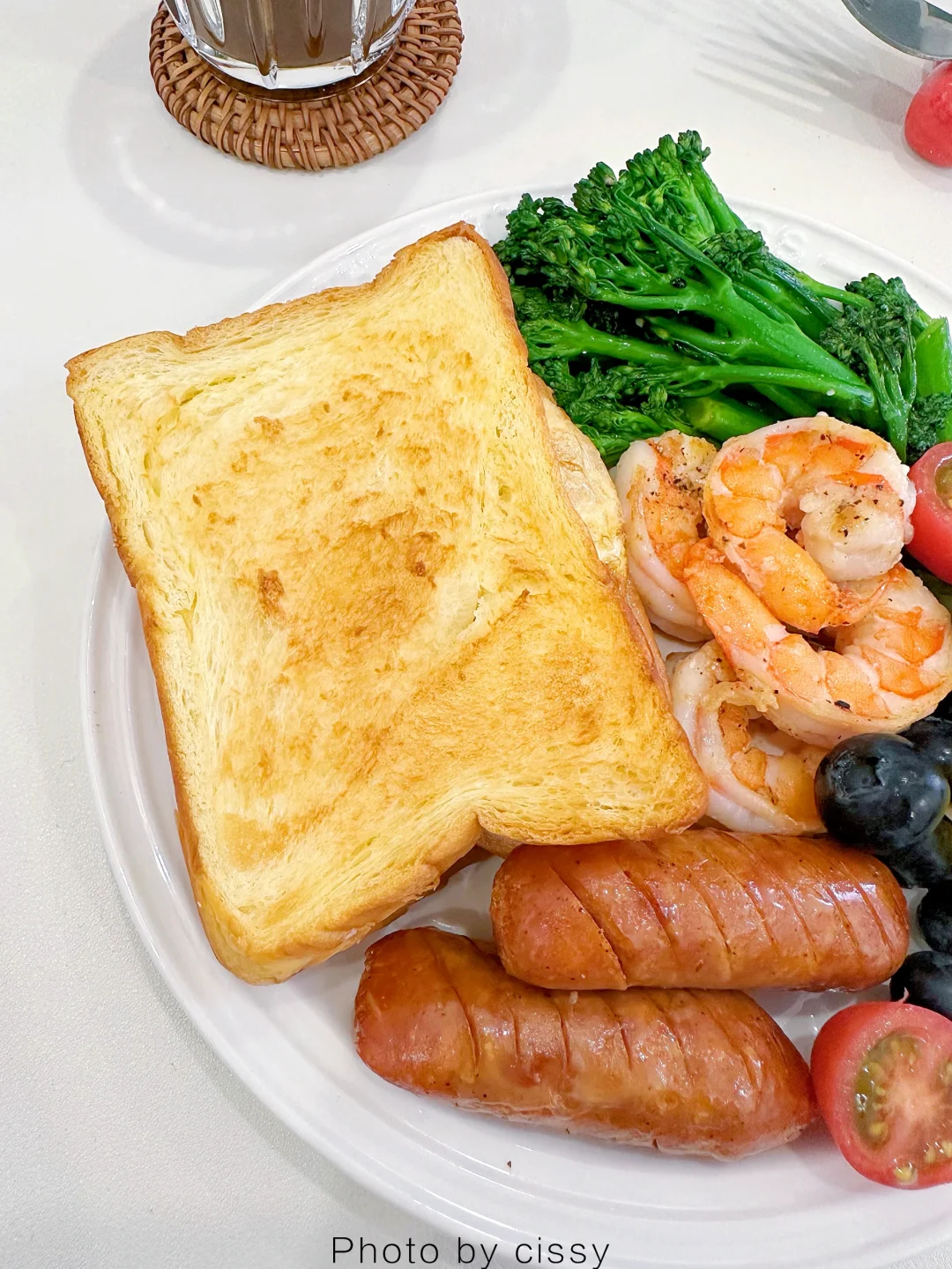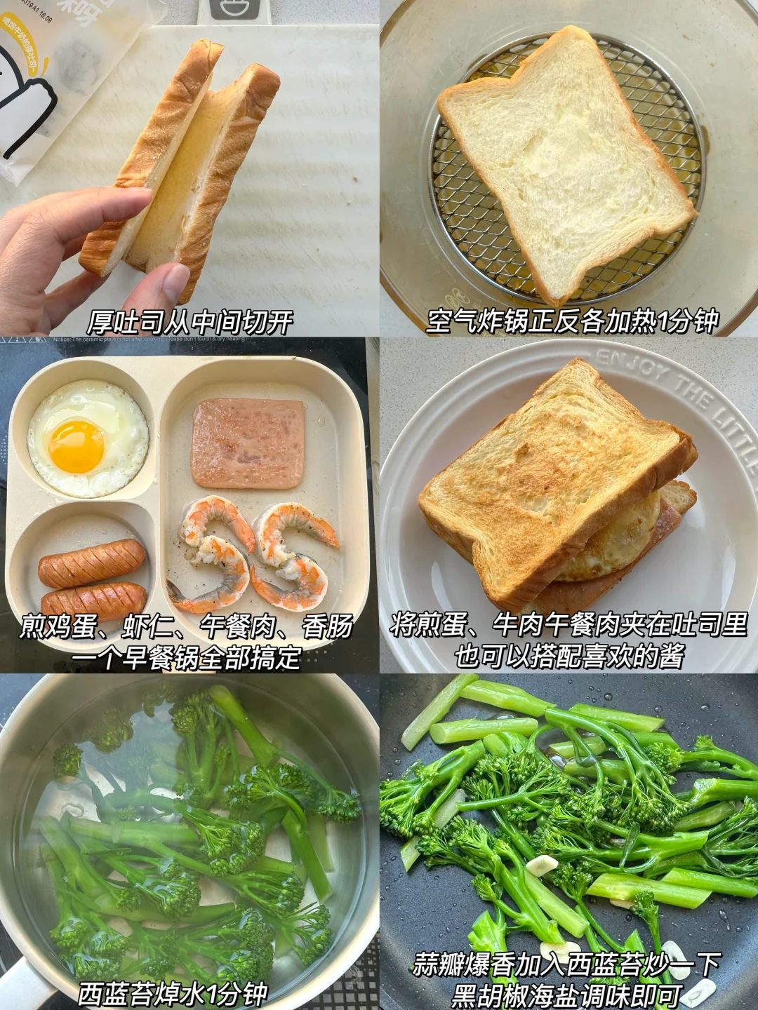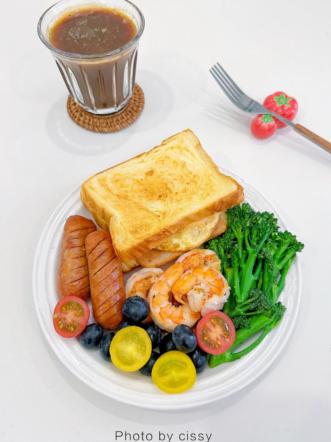 【今日份早餐】 🥪厚吐司午餐肉三明治 🍤黑胡椒海盐煎虾仁 🥦西蓝苔 🍖烤肠 🫐蓝莓、小番茄 ~ ✨用厚吐司做了三明治,中间切开夹上喜欢的食材就可以啦!🥩午餐肉一直吃的是牛肉午餐肉,比猪肉的热量更低,多吃点没罪恶感,哈哈哈🤣。 ✨早餐锅真的是我的做饭好搭子,一个锅同时煎熟各种食材,效率up⬆️。