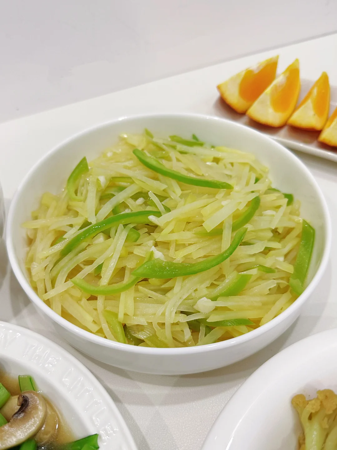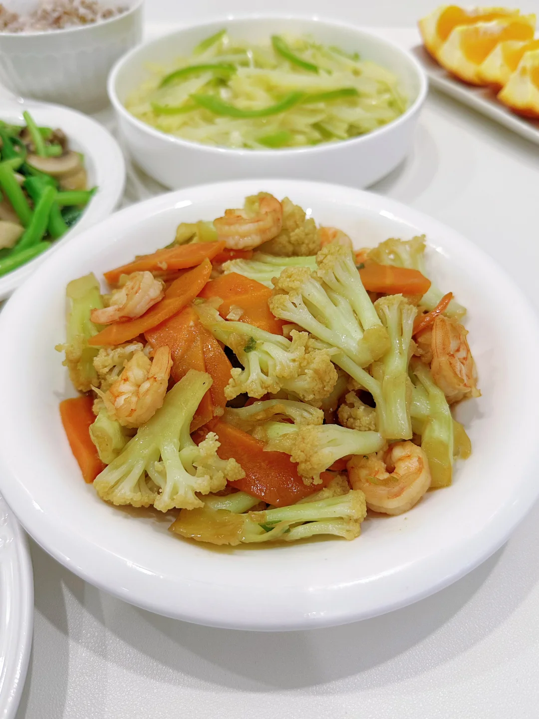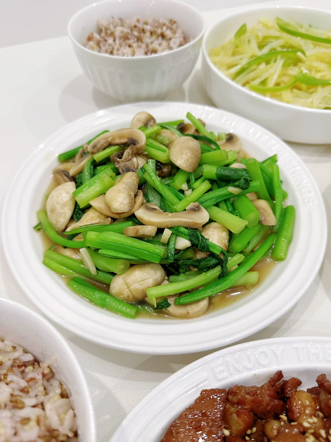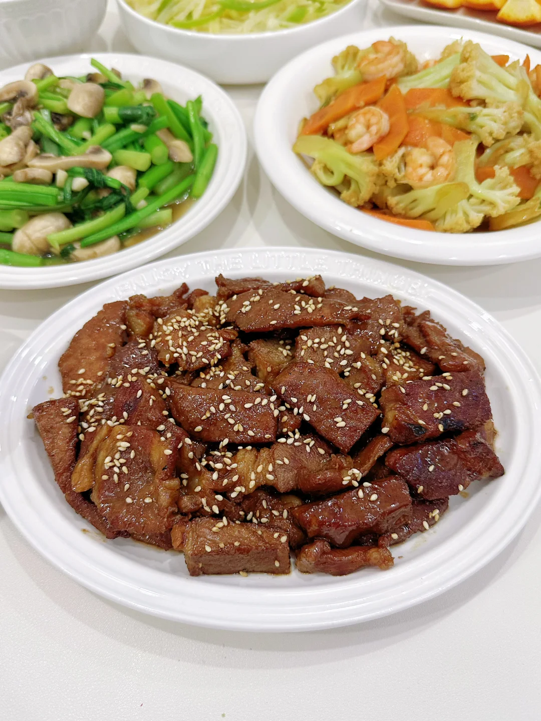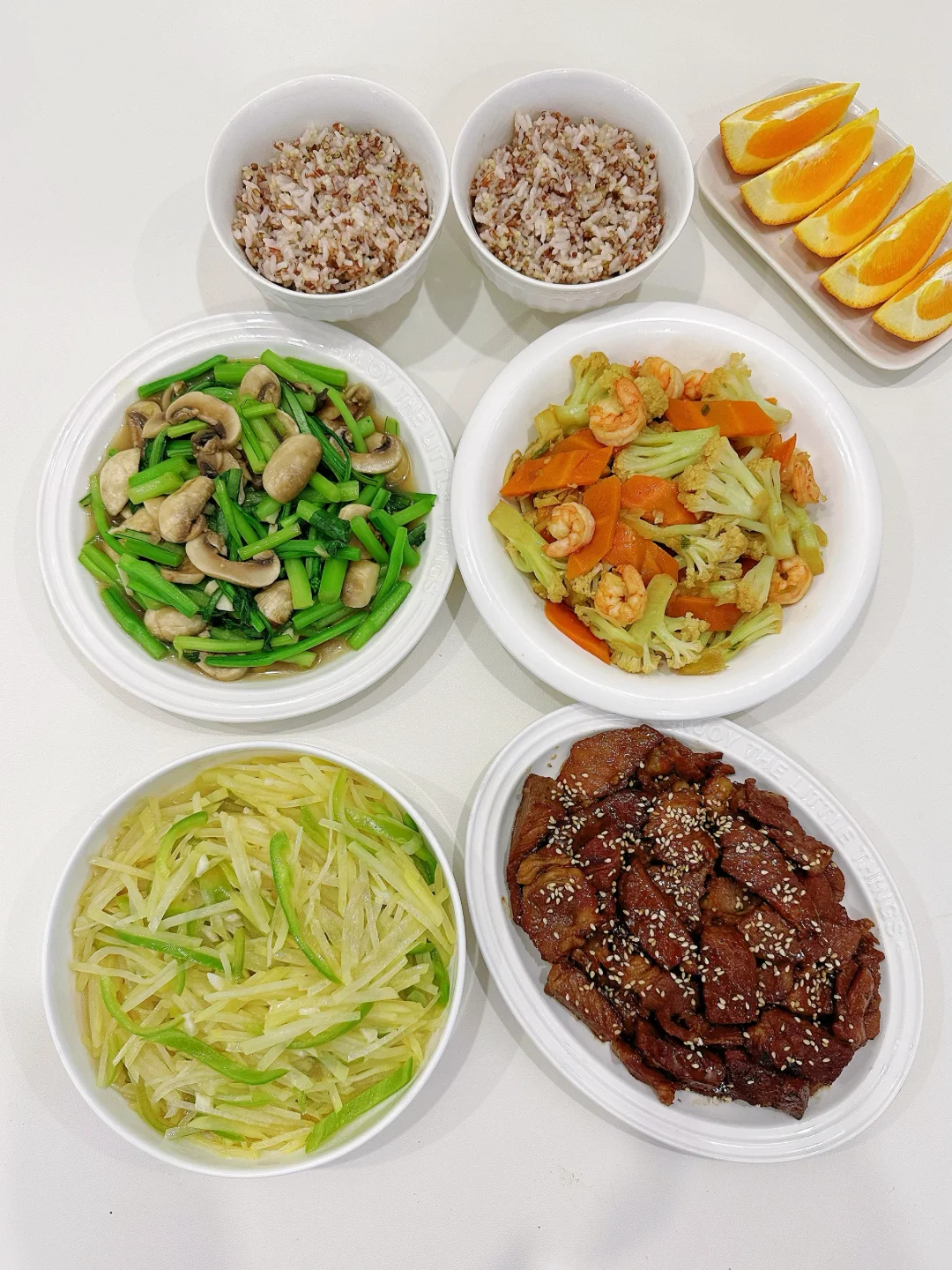 今天吃: 🥩日式烤梅花肉 🥔清炒土豆丝 🥦花菜炒虾仁 🥬口蘑菜心 ~