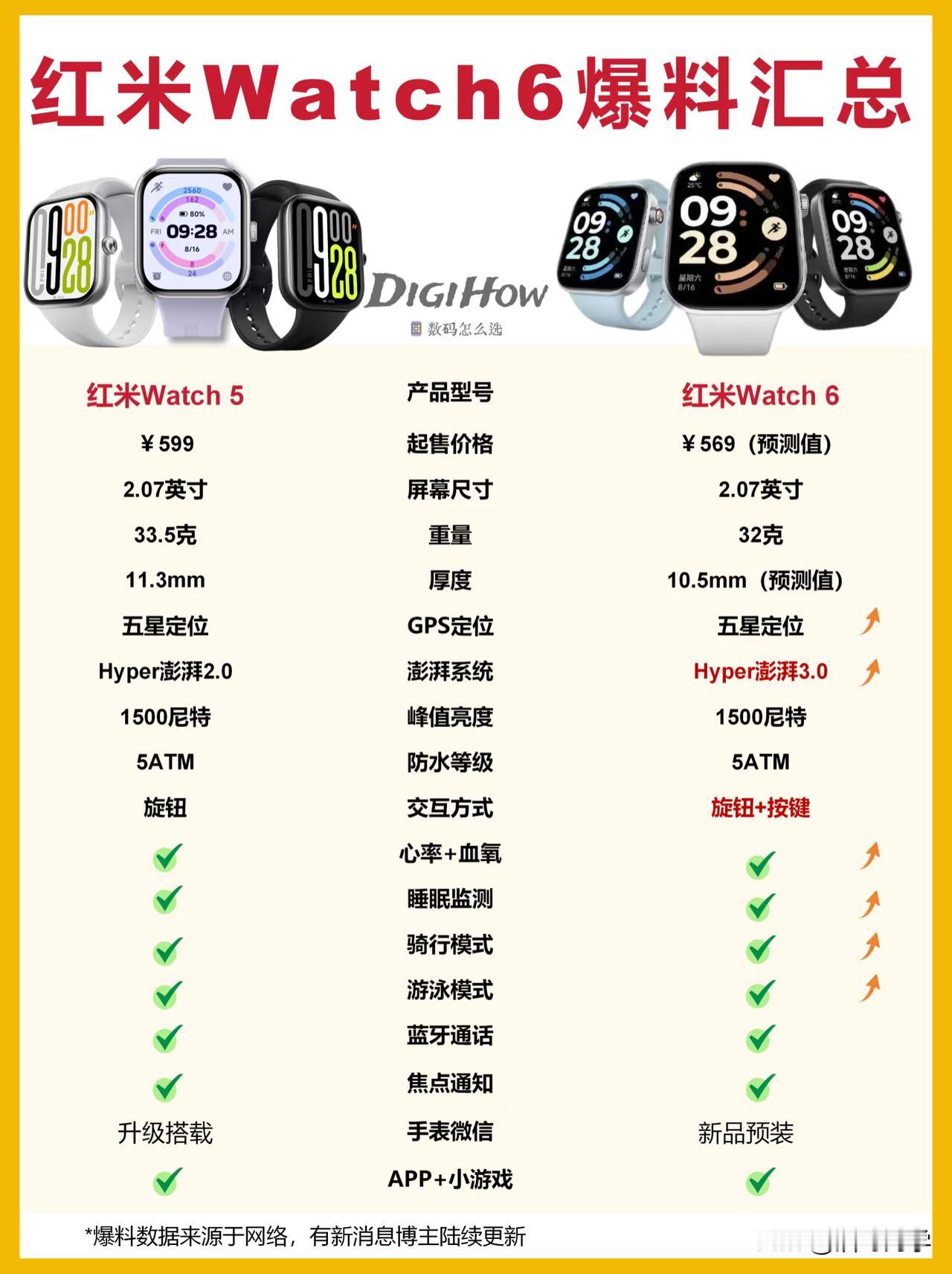 分享我这周有趣的事:本周,REDMI的最新一版手表Watch 6发布,对比上一代Watch 5,有一些升级点,比如,重量更轻,五星定位更加精准,出厂搭载澎湃OS3,交互方式增加了一个按键……如果你现在用着Watch 5,我个人认为没有太大的必要去升级Watch 6,因为这一代的手表升级点还是很有限的,虽然599的价格没变,还不如买Watch 5有优惠呢!不知道大家觉得Watch 6这款手表怎么样?