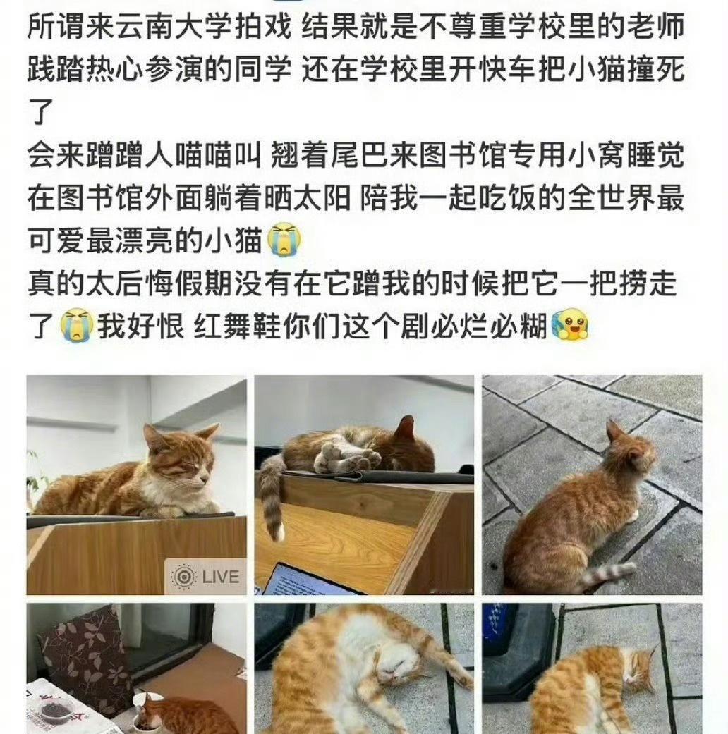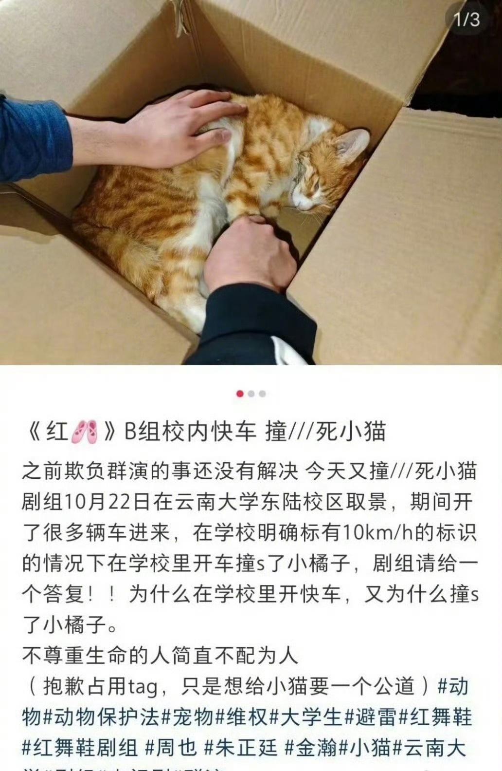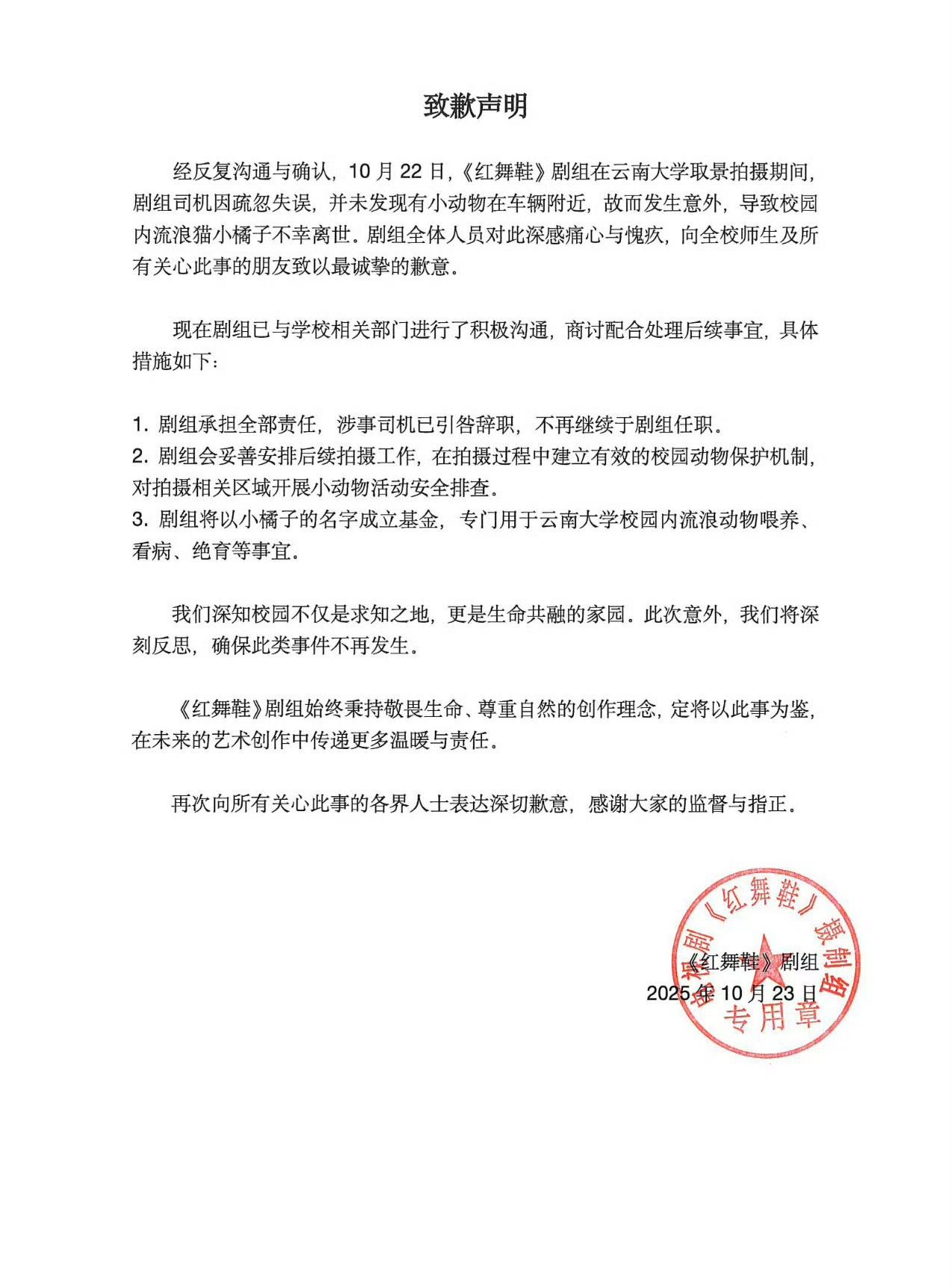 《红舞鞋》剧组官微凌晨发布致歉声明,称因剧组司机疏忽失误,导致校园内流浪猫小橘子不幸离世 剧组已与学校相关部门进行了积极沟通,商讨配合处理后续事宜,具体措施如下: 1.剧组承担全部责任,涉事司机已引咎辞职,不再继续于剧组任职 2.剧组会妥善安排后续拍摄工作,在拍摄过程中建立有效的校园动物保护机制,对拍摄相关区域开展小动物活动安全排查 3.剧组将以小橘子的名字成立基金,专门用于云南大学校园内流浪动物喂养、看病、绝育等事宜。