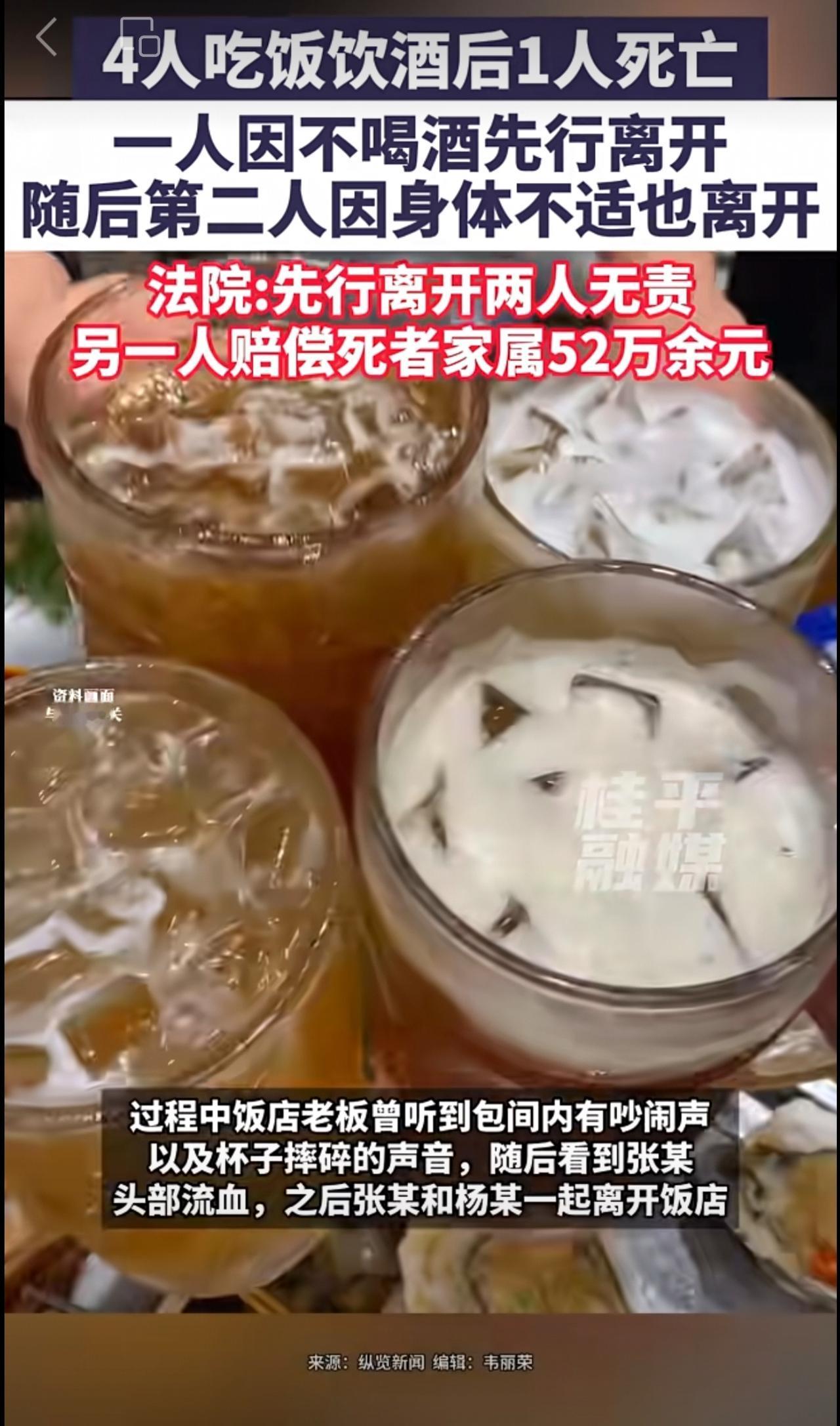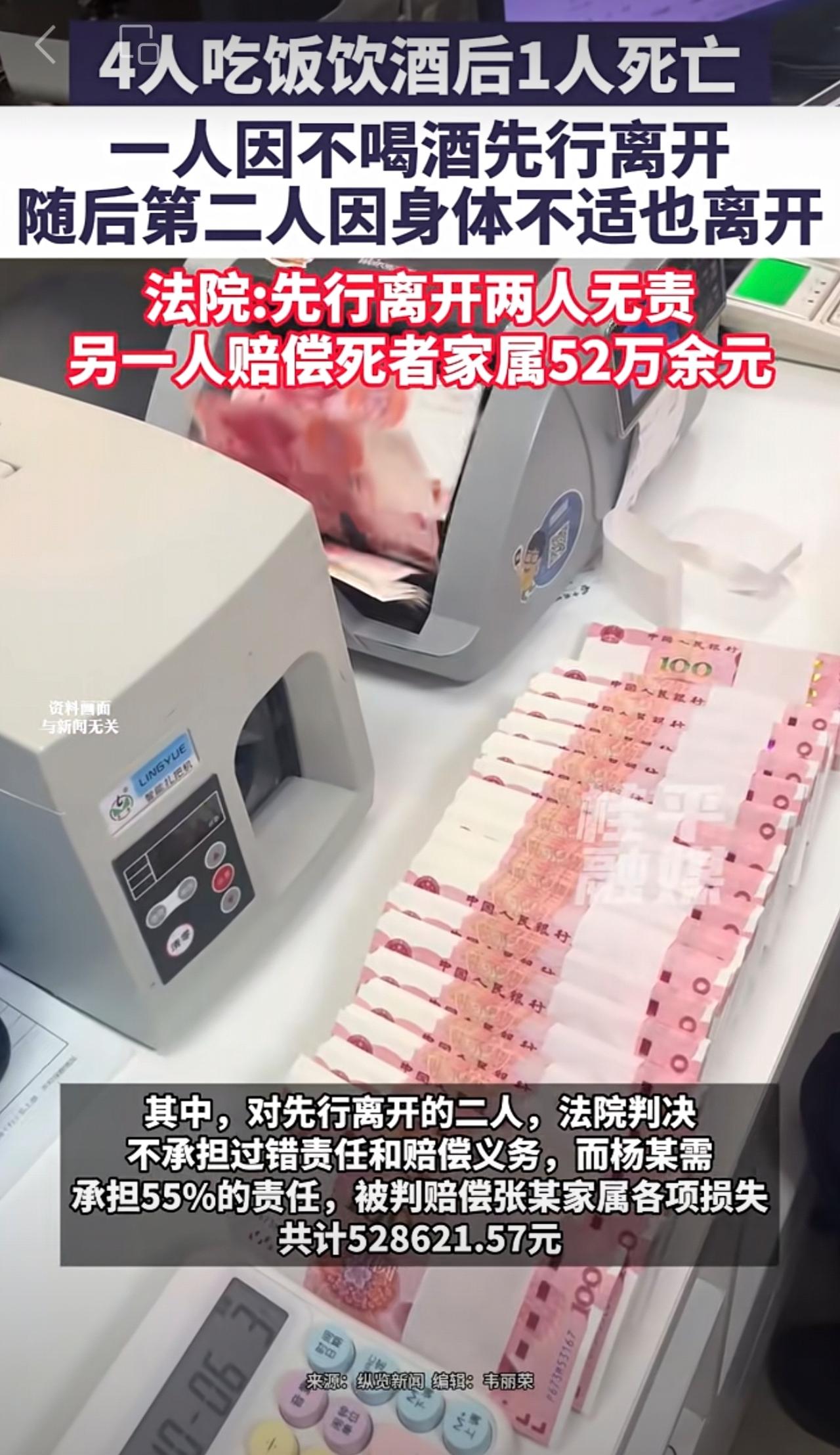 四人吃饭饮酒后一人死亡,法院一审判先行离开两人无责,另一人承担55%的责任,赔偿死者家属52万余元聚餐 喝酒 饮酒适可而止 法院判决 赔偿@微信创作者 @热门小助手+