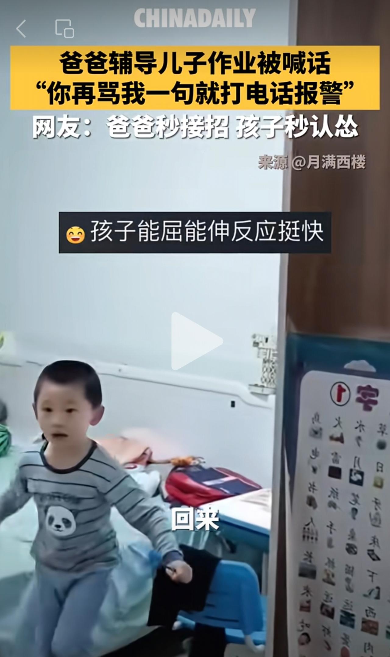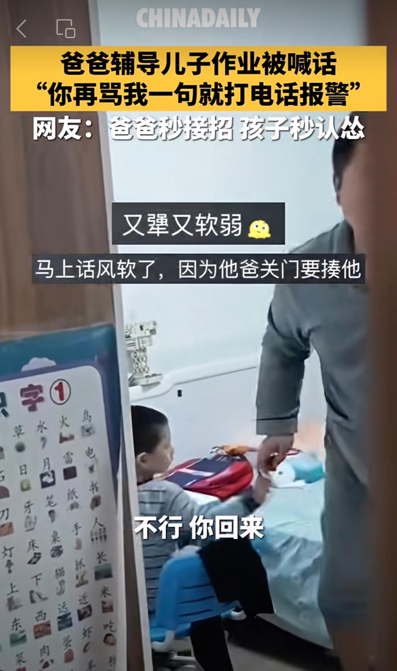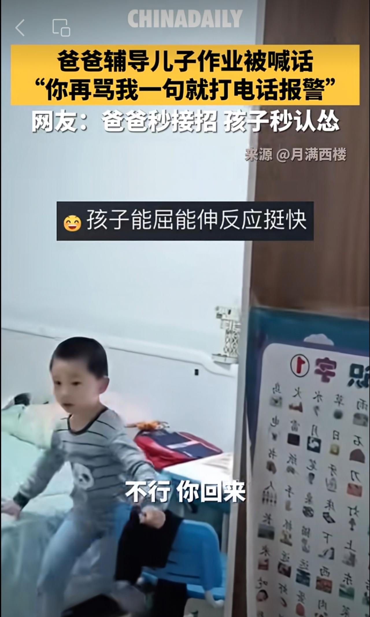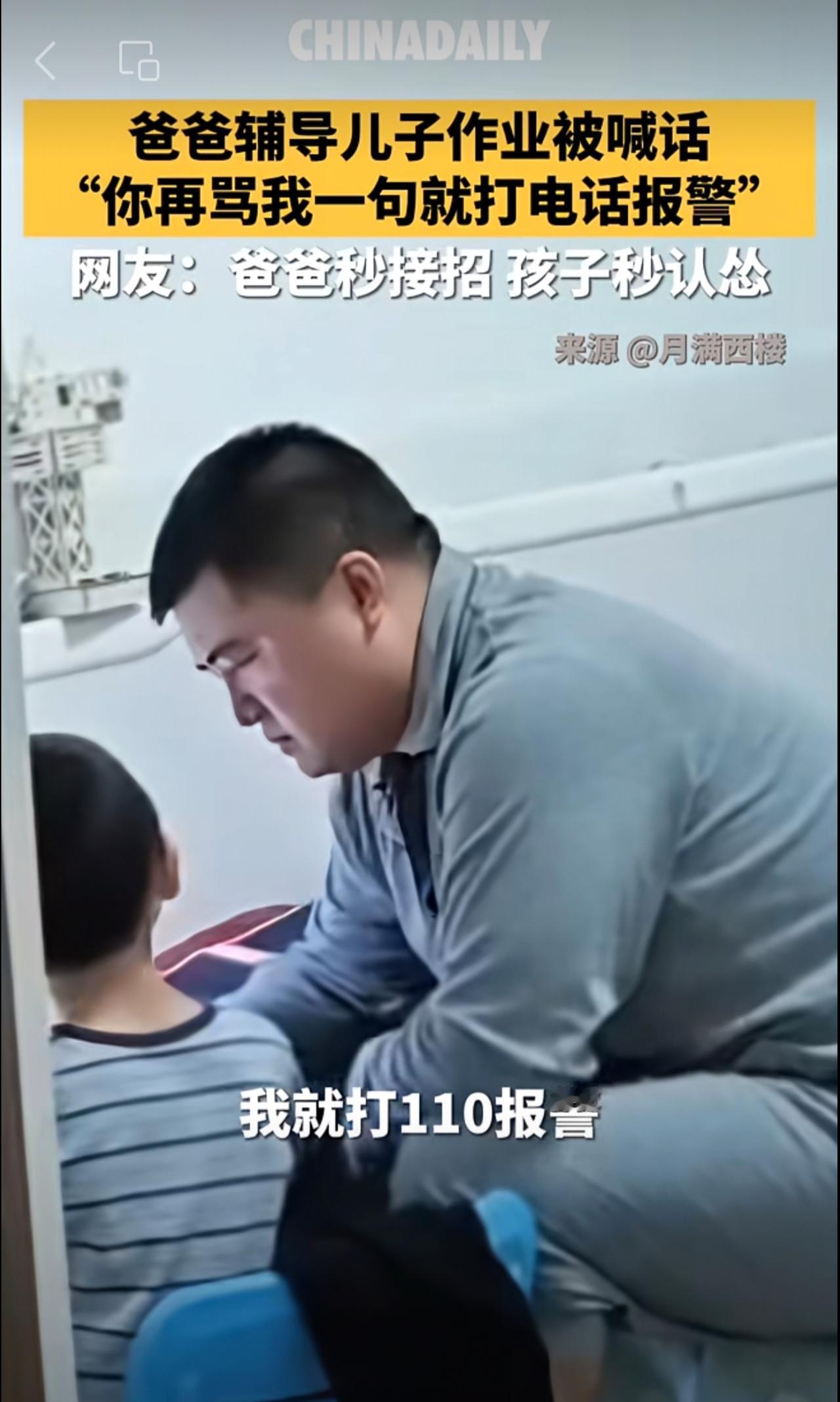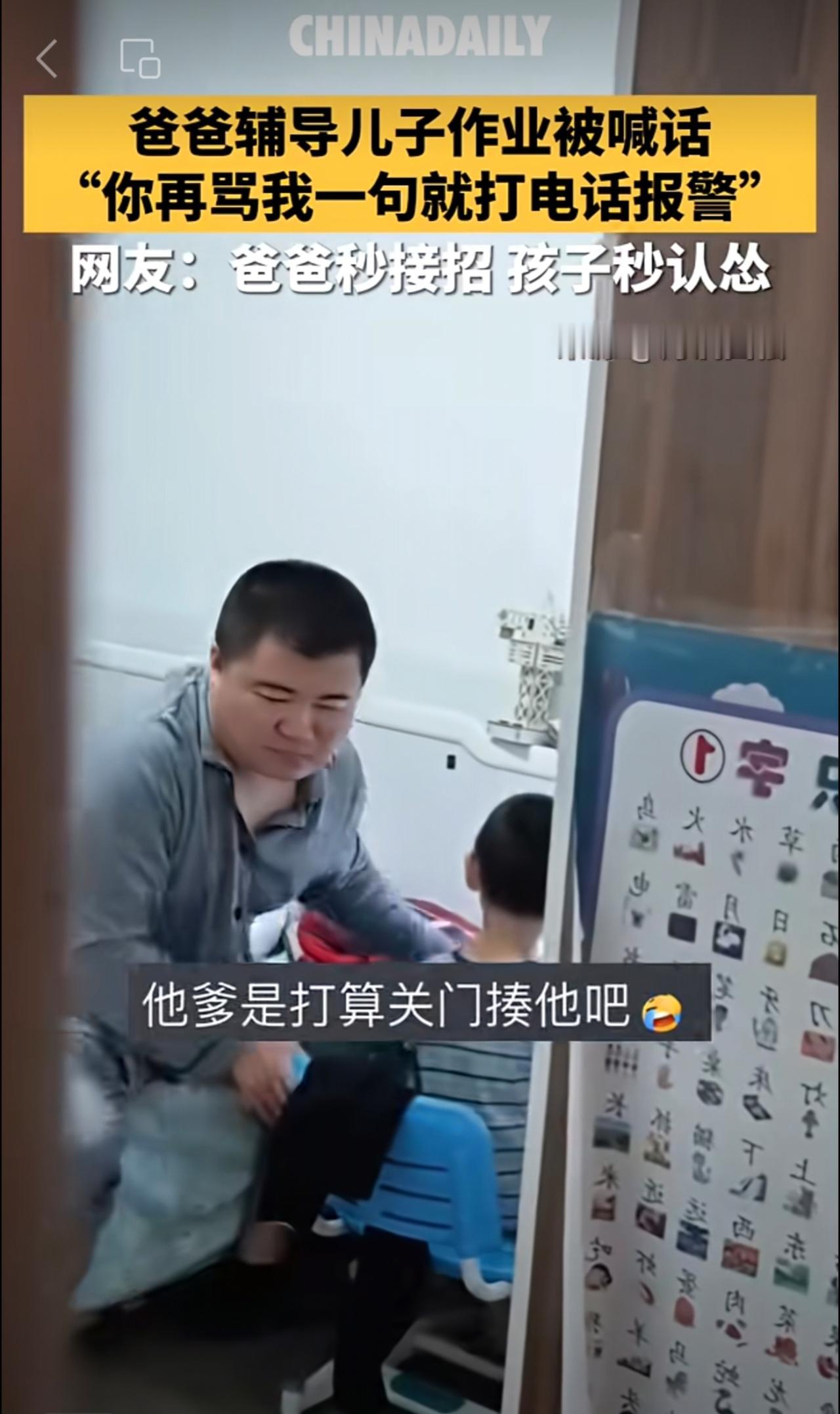 爸爸辅导儿子作业,被喊话:“你再骂我一句,我就打电话报警!”没想到爸爸没有一秒犹豫。网友:爸爸秒接招,孩子秒认怂。