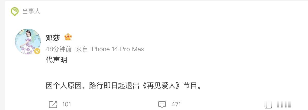 《再见爱人5》重新播出,但是嘉宾之一的路行退出了节目。 我就挺好奇了,路行退出了,身为妻子的邓莎难道要一个人录制节目吗? 毕竟这是再见爱人啊,爱人都走了,邓莎和谁再见去? 单纯好奇这档综艺节目接下来会怎么剪辑...