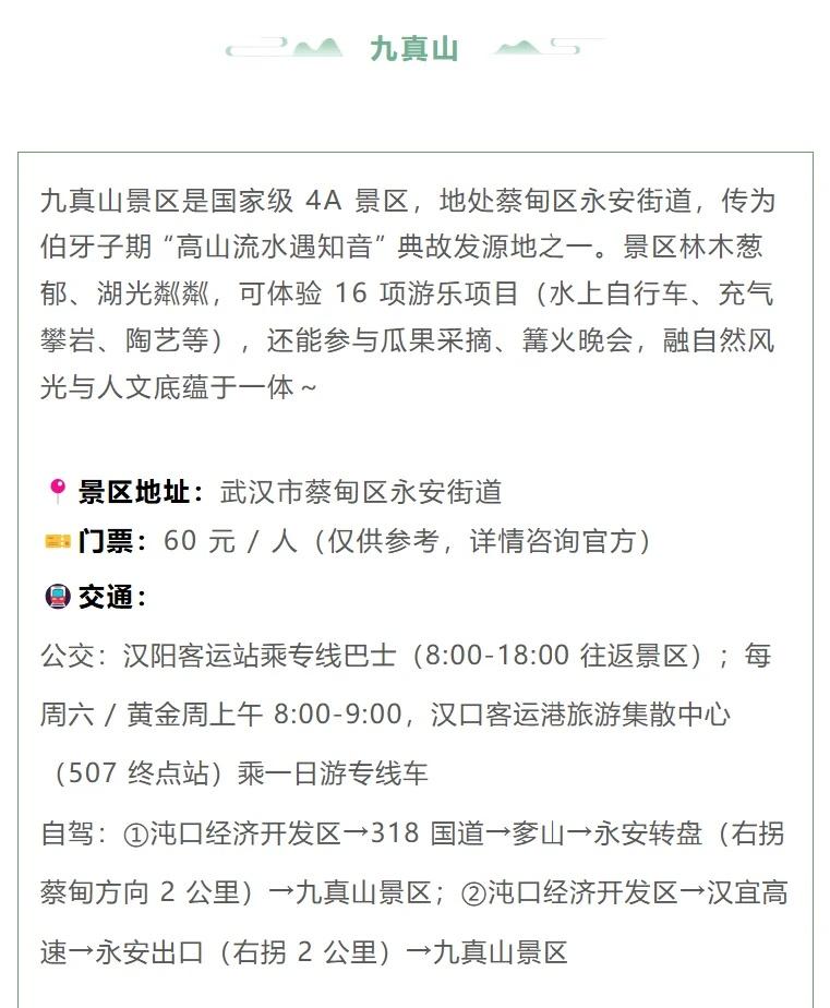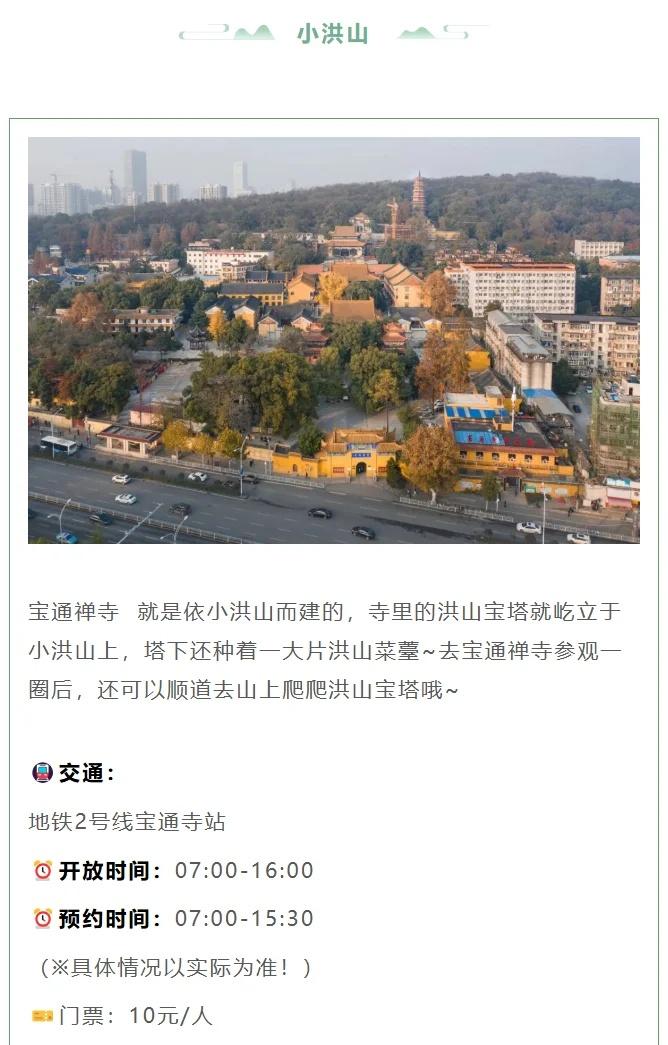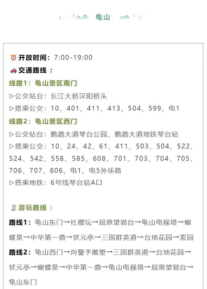 武汉秋日爬山指南🍂大部分免费!承包周末 秋高气爽适合徒步~武汉气温即将回升并且稳定下来!整理了武汉 7 座各有特色的山,自然氧吧、人文古迹都能 get,挑个天晴的日子去吸氧吧~ 🐢龟山 亮点:城市中心山林,可逛三国群英道、龟山电视塔,俯瞰长江大桥 路线:东门→社稷坛→屈原望郢台→电视塔 或 西门→向警予雕塑→三国群英道→台地花园 🍃九真山 亮点:4A 景区 + 知音文化发源地,能玩水上自行车、充气攀岩,秋日可摘瓜果、办篝火晚会 交通:汉阳客运站专线巴士(8:00-18:00 往返);自驾走 318 国道 / 汉宜高速→永安出口 🌺东湖磨山 亮点:三面环水,有 “十里长湖八里磨山” 美誉,景区内植物园众多、花木繁茂 交通:公交 401/402/413→“鲁磨路磨山” 站 🌅八分山 亮点:武汉 “最美日出日落” 打卡地,海拔 270 米,被誉为 “最具自然特色的山” 交通:地铁 7 号线北华街站 A2 口→转江夏 V1 路到八分山路站西社区 🏞️青龙山 亮点:森林公园 + 人文景点(熊廷弼公园),游乐设施齐全,适合亲子 / 好友同游 交通:地铁 7 号线纸坊大街站 D 口→公交 J11 路→青龙路宁港桔园站步行 🕌小洪山 亮点:宝通禅寺依此而建,可逛洪山宝塔,塔下有洪山菜薹,人文氛围浓厚 交通:地铁 2 号线宝通寺站直达 🐍蛇山 亮点:西连黄鹤楼、东接首义公园,逛完可冲大成路夜市吃美食 交通:地铁 7 号线小东门站;公交到武珞路阅马场 / 武昌路阅马场等站 秋光短暂,而山不会辜负每一个向它走去的人。当你踏上石阶,风里的桂香、叶间的光斑、古迹的低语…… 大学生爬山 秋季去爬山 武汉吃喝玩乐 户外爬山徒步 登山好去处 户外徒步爬山 武汉去哪玩 徒步踏秋去 城市轻徒步 每周一山 @发发薯 @户外薯