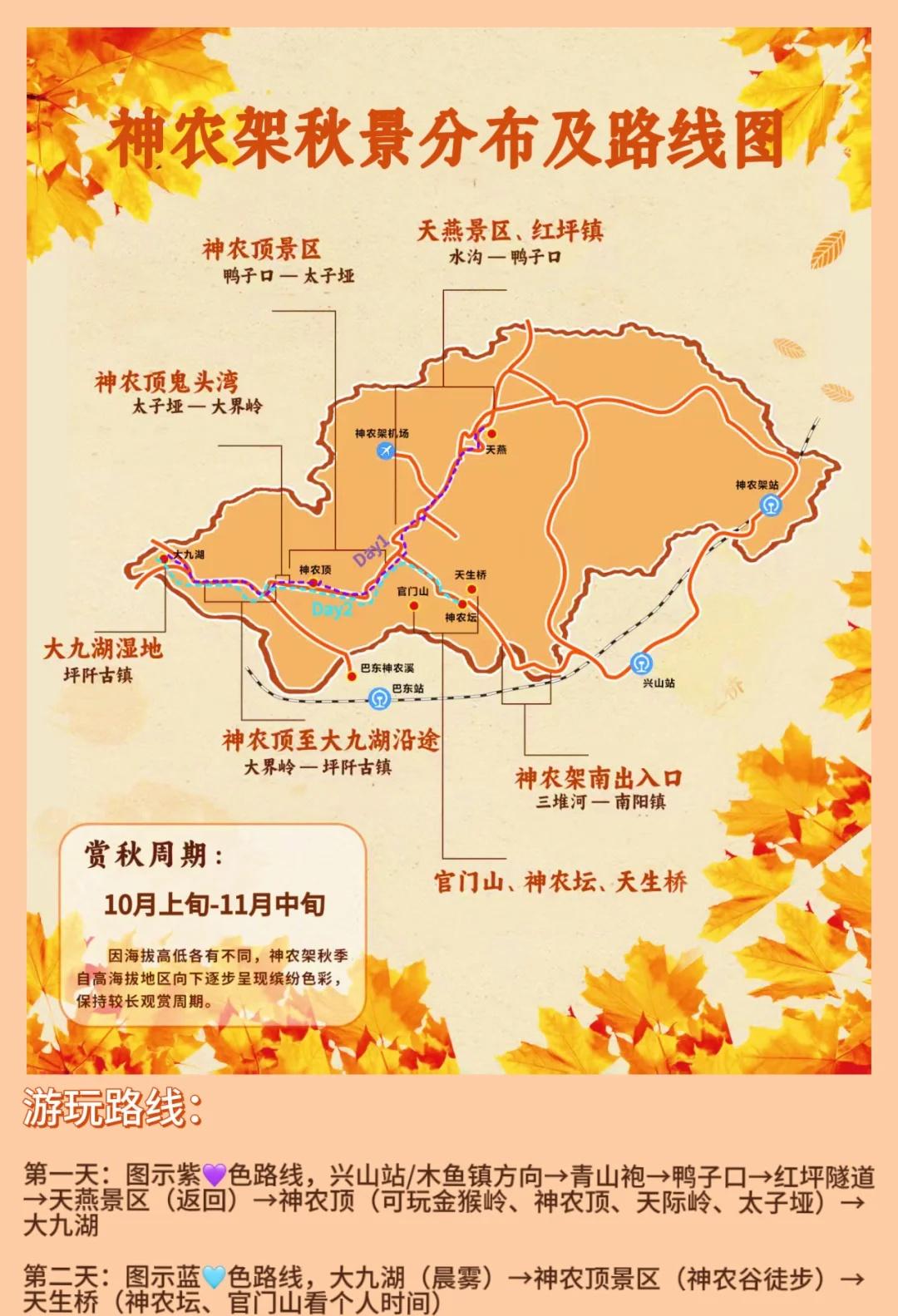 神农架!你的秋天这么美!!湖北同意了吗??? 丸子的1000个玩乐计划继续分享 283期来咯 - 武汉出发🚄2h邂逅了油画般的秋天! 真的美哭我了😭 层林尽染的天燕群山 云海翻腾的天际岭 绝美晨雾的大九湖 真的不输我看过的其他国内秋色 - 很遗憾人们只记得神农架夏可避暑,冬可滑雪 丸子总结了全网zui新zui全的赏秋吃住行攻略 (连续游玩7年,N刷的宝贵经验) 只需1个周末即可get同款小众冷门媲美川西的神农架秋日徒步 - 🚗追秋行程路线推荐(详见图3) Day1:兴山站/木鱼镇方向→青山袍→鸭子口→红坪隧道→天燕景区(返回)→神农顶(可玩金猴岭、神农顶、天际岭、太子垭)→大九湖 Day2:大九湖(晨雾)→神农顶景区(徒步约4h)→天生桥(神农坛、官门山看个人时间)或去小众景区香溪源 - 🏠住宿 ✔️大九湖:不看晨雾可以不去,看晨雾,想环境好住坪阡古镇,想轻松可选二号湖附近民宿(人均100r➕),步行看晨雾,网上搜不到,有需要滴朋友可以榴言) ✔️天燕景区:可以考虑住红坪镇或者天燕里的营地、星空帐篷 ✔️如选木鱼镇:这两年夏天都住的燕栖别院,环境舒服,交通方便,菜好吃😋,晚上有时间可看《秘境神农架》,很精彩 - 🚄交通:高铁不要在神农架站下,兴山站哦!租车或者包/拼车游玩更方便 - 🍁红叶推荐地和时间(跟着玩赏秋不留遗憾) P2/5/11/15为昨日实景,其他图美景月底和月初都可赏,赏秋预计可以持续至11月中旬 ✔️红坪镇&天燕景区(10月下旬-11月上旬): 沿途还可以游玩青山袍→鸭子口,沿途秋日红叶 ✔️神农顶(10月下旬)6景区本人最喜欢的,有很多小景点(天际岭、金猴岭、神农谷、板壁岩、迷人倘等) ✔️神农顶-大九湖(10月下旬-11月上旬):环山公路风景非常美,秋色迷人 ✔️大九湖(10月下旬-11月中旬):高原湿地湖泊,心中与新疆“喀纳斯”媲美的晨雾(如果不早起不看晨雾就很普通了) ✔️香溪源(11月):小而美的景点,徒步看秋叶、瀑布 旅游编辑部秋日到站计划现在徒步正好 武汉周边游 神农架 神农架旅游武汉周边游神农架攻略 神农架赏秋攻略 神农架赏秋 神农架红叶 武汉周边赏秋本地人去哪玩 周末去哪儿 武汉周边游攻略 @户外薯