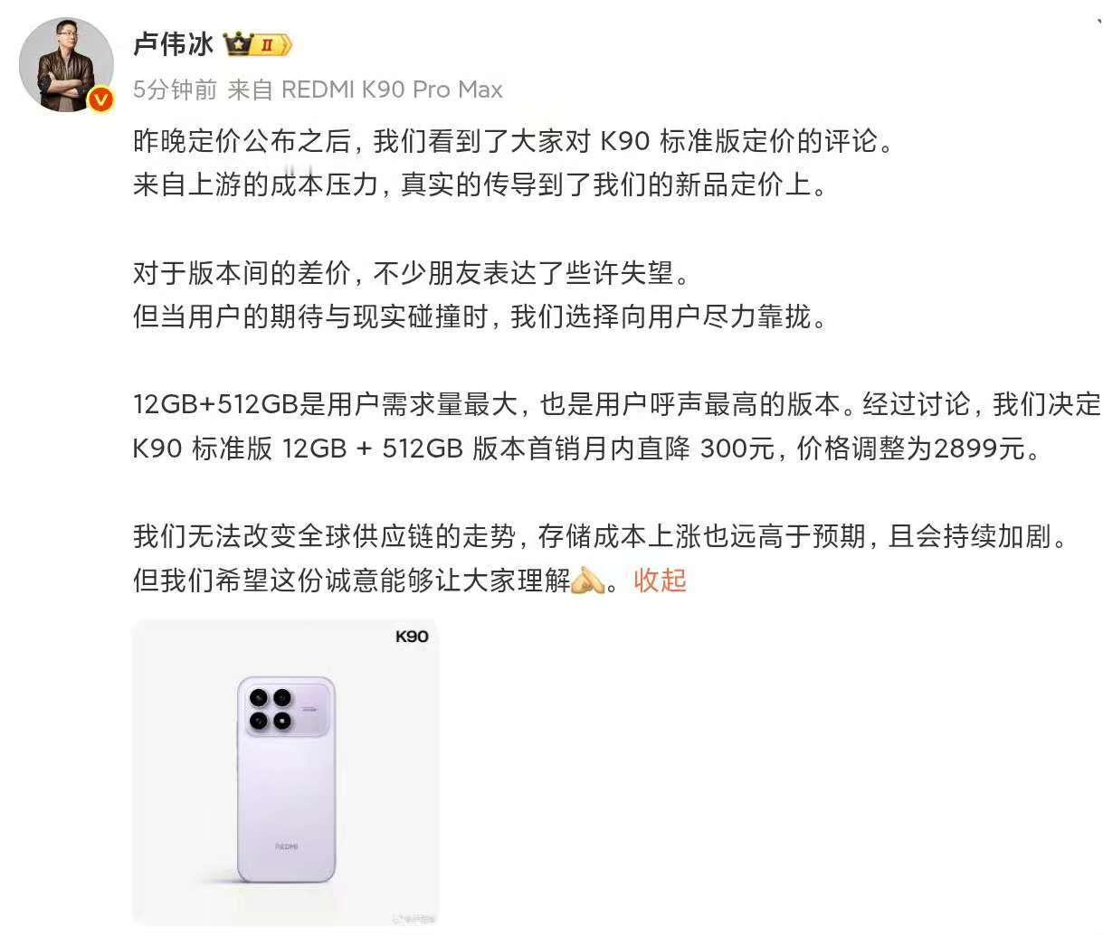 上市就破发?卢伟冰官宣K90降价300。雷总说过硬件利润率不超5%,319