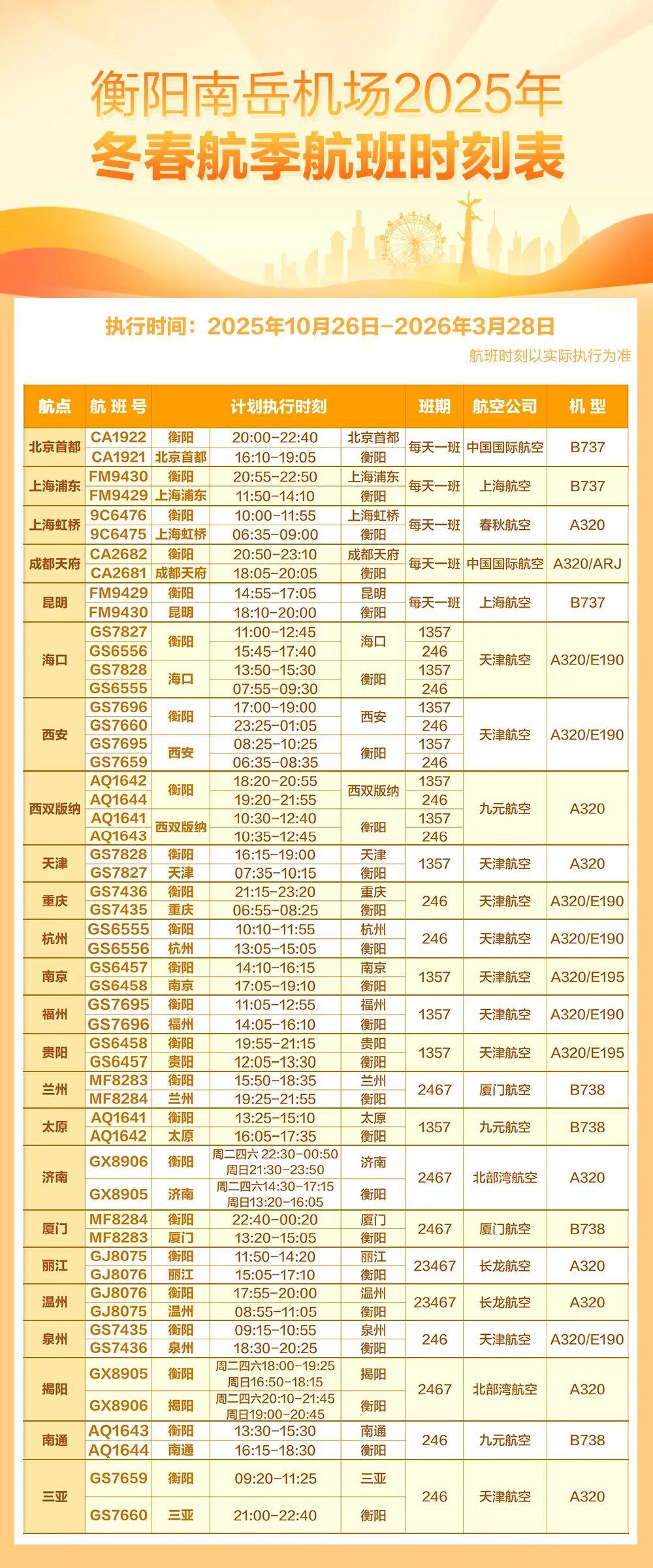 根据航班执行计划,新航季衡阳南岳机场日均进出港17个航班,航线结构与航班频次分布更为均衡合理。其中,衡阳往返上海的航班每天2班,往返北京、成都、昆明、海口、西安、西双版纳等城市的航班每天1班,往返天津、重庆、杭州、南京、福州、贵阳、兰州、太原、济南、厦门、丽江、温州、泉州、揭阳、南通、三亚等城市的航班每周3至5班,为市民提供了丰富的出行选择。