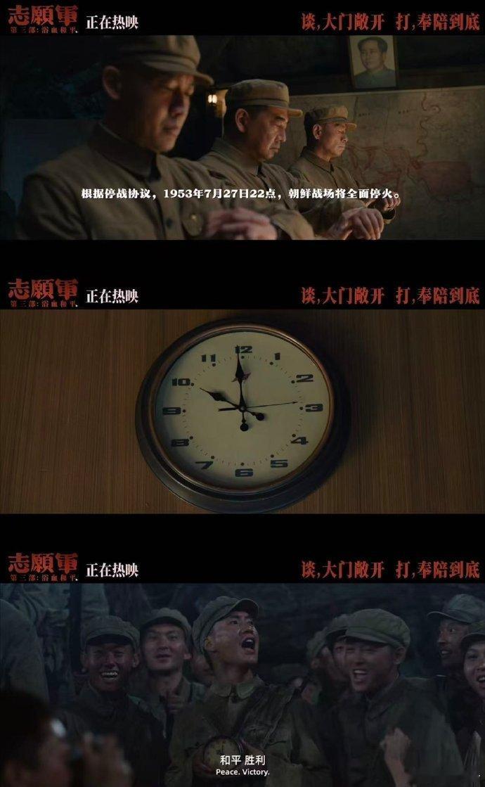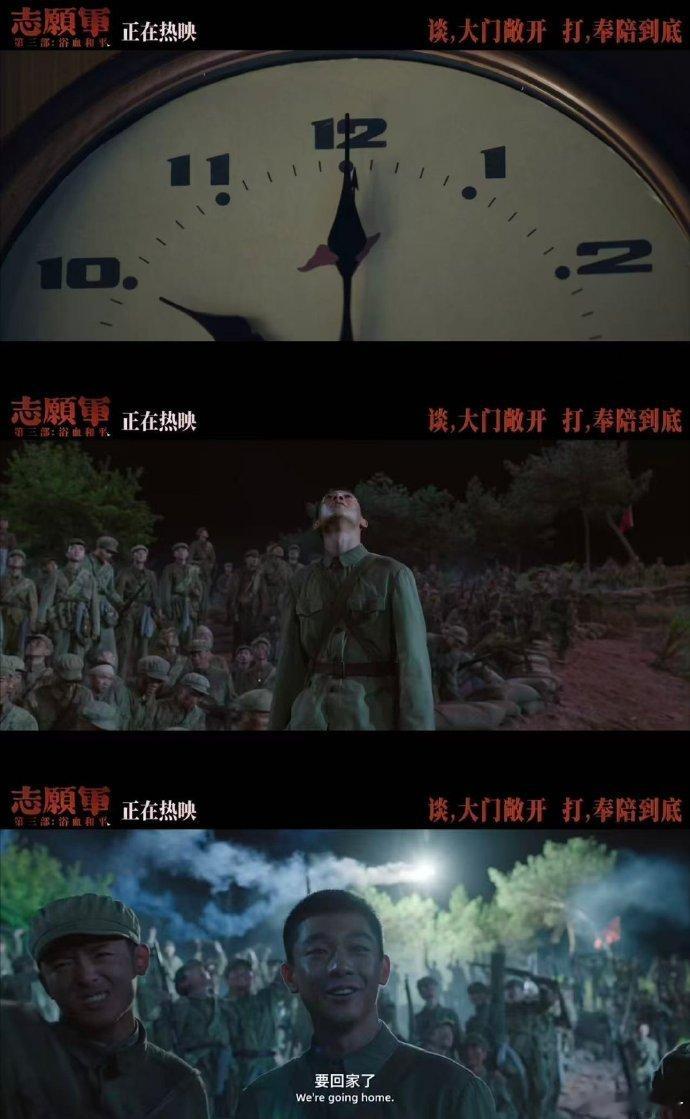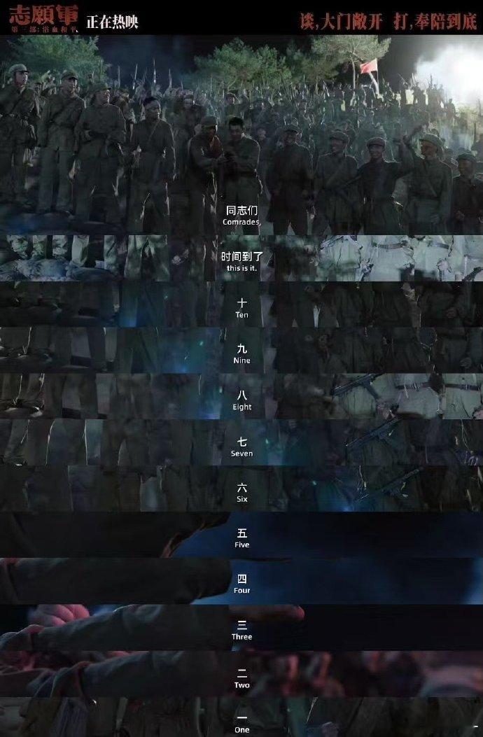 0人能平静地走出这段倒计时 看了《志愿军:浴血和平》结尾,心被那倒计时紧紧揪住!三年血战,和平降临,战士们倒数欢呼,眼中泪光闪烁。鏖战场景一一闪现,杨三弟“要回家了”轻语,是演员真情流露,更是无数战士心底呐喊,和平珍贵无比,我们携手守护这盛世!