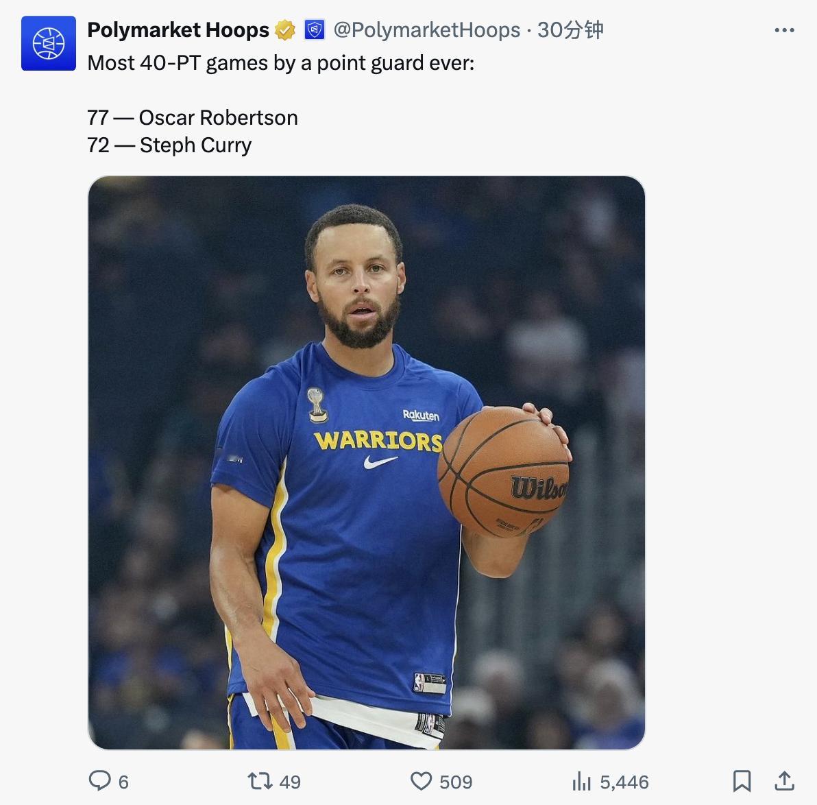 得分40分以上且罚球数少于 10 次的场次,库里历史第一
