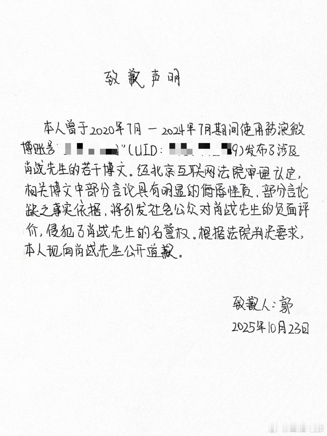 肖战又一黑粉手写致歉声明黑粉手写致歉声明向肖战道歉 10月24日,肖战又一黑粉手写致歉声明,向肖战公开道歉。肖战[超话]