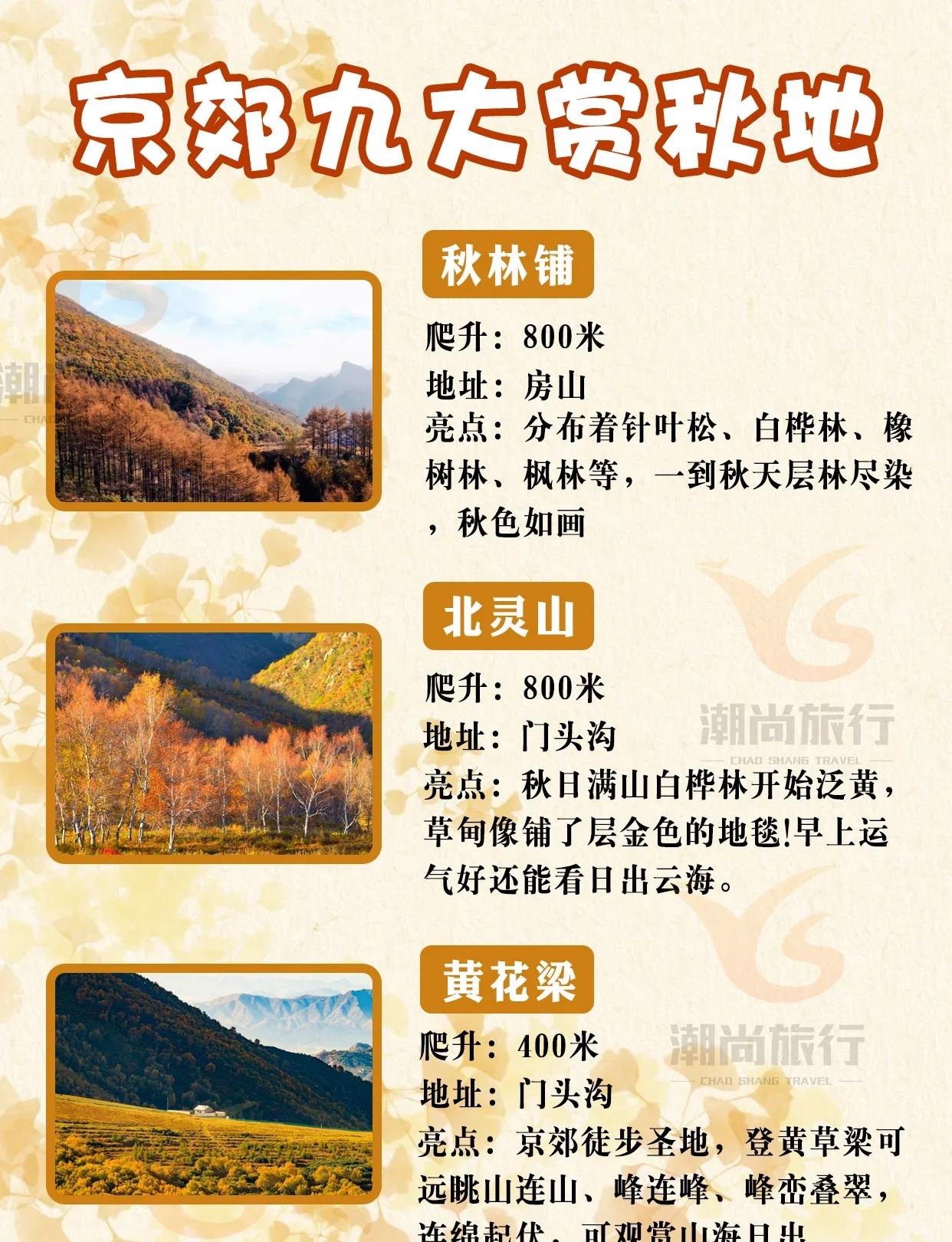 📢京郊九大赏秋推荐地~赶快收藏🎉 🍁北京绝美徒步赏秋路线 ,闯入油画般的五彩世界 🍂 十月下旬到十一月中下旬,北京邂逅最美秋色的黄金季节💥 📢这些九大宝藏徒步路线🙈赶紧码住啦~ -· 🏞️ 坡峰岭 🎯 环线徒步6km|新手友好 🌟 北京红叶浓度天花板!色彩炸裂 · 🏞️ 喇叭沟 🎯 往返12km|小白放心冲 🌟 原始森林秋景,沉浸式吸氧 · 🏞️ 红螺寺 🎯 徒步8km|祈福徒步两不误 🌟 红螺山水相依,古寺秋韵绝配 · 🏞️ 金海湖 🎯 环湖6km|散步级难度 🌟 枫叶映湖光,漫步水墨画中 · 🏞️ 舞彩浅山 🎯 徒步9km|初级难度 🌟 赏红叶满山,寻五色金秋~ · 🏞️ 石虎线 🎯 徒步10km|初级难度 🌟 漫步小众原生态山谷,赏秋摘野果 · 🏞️ 秋林铺 🎯 徒步15km|中级难度 🌟 一到秋天层林尽染,秋色如画 · 🏞️ 北灵山 🎯 徒步10km|初级难度 🌟 秋日满山白桦林开始泛黄,草甸像铺了层金色的地毯 ·