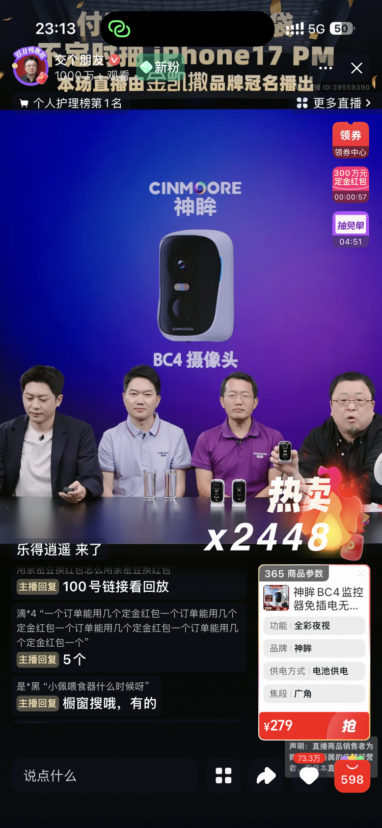 本次直播恰逢淘宝双十一活动首日,神眸BC4系列产品的技术创新和实用功能赢得了消费者的广泛认可。直播期间,观众对产品“不接电、不接网”的便捷安装特性表现出浓厚兴趣,特别是BC4Pro+的双镜头设计和AI智能识别功能成为讨论焦点。