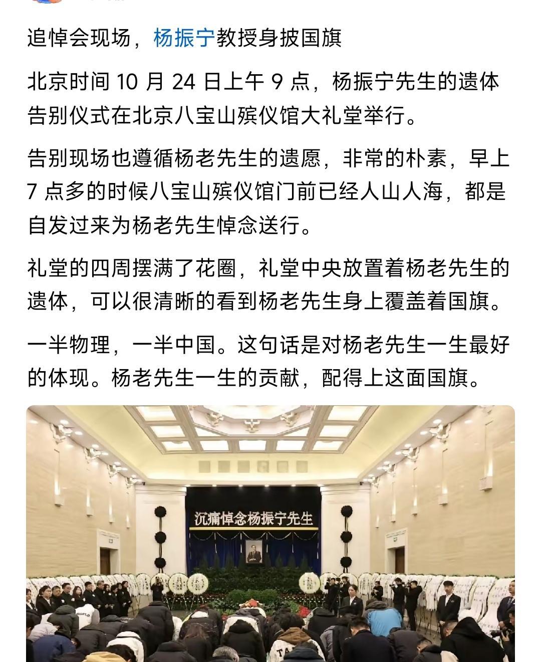 杨振宁先生,走的时候能披上五星红旗,说明先生的贡献,国家给了定论:是一个伟大的爱国者 他的贡献不是在两弹一星上,而是对后期中国科技的发展引进了大量前沿人才,对中国互联网的发展更是做了巨大贡献 先生已逝,愿在科学王国耕耘了一生的巨人,在天堂安息! #杨振宁遗体告别仪式今日举行#