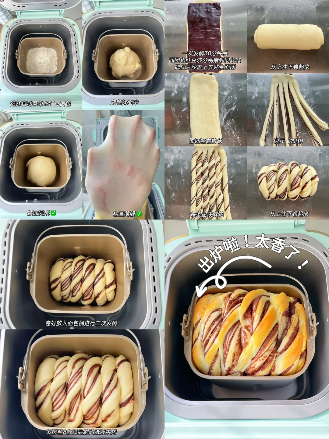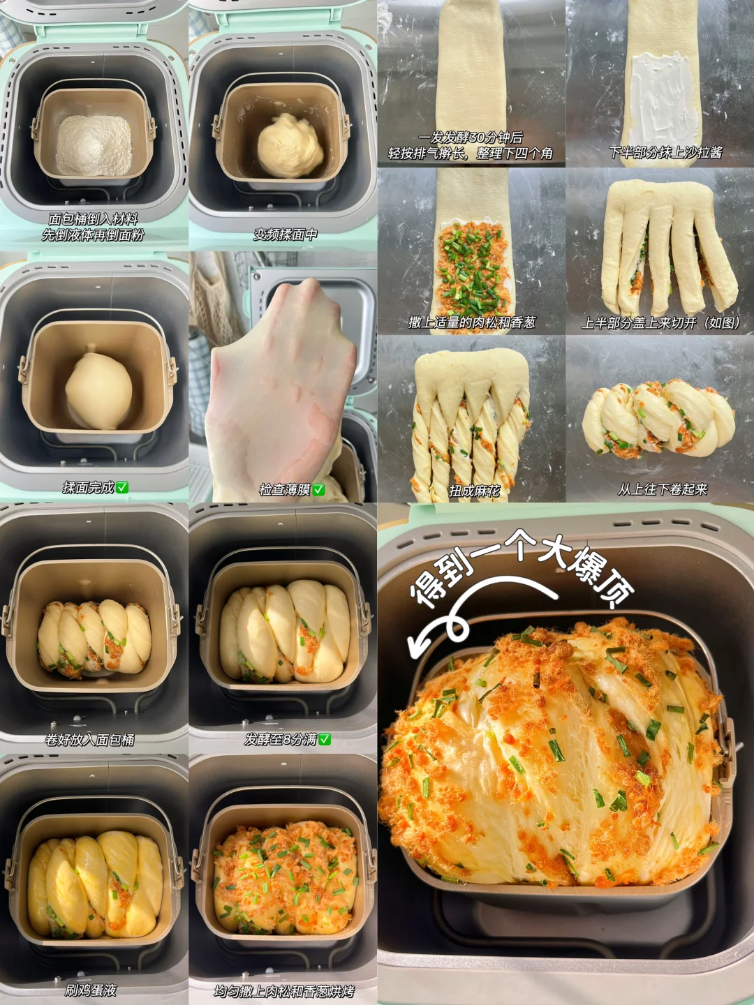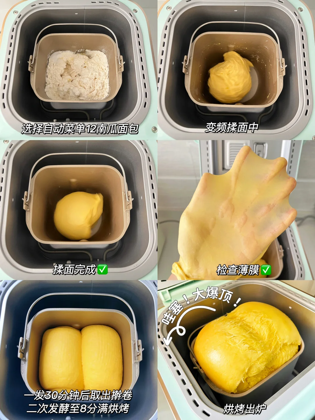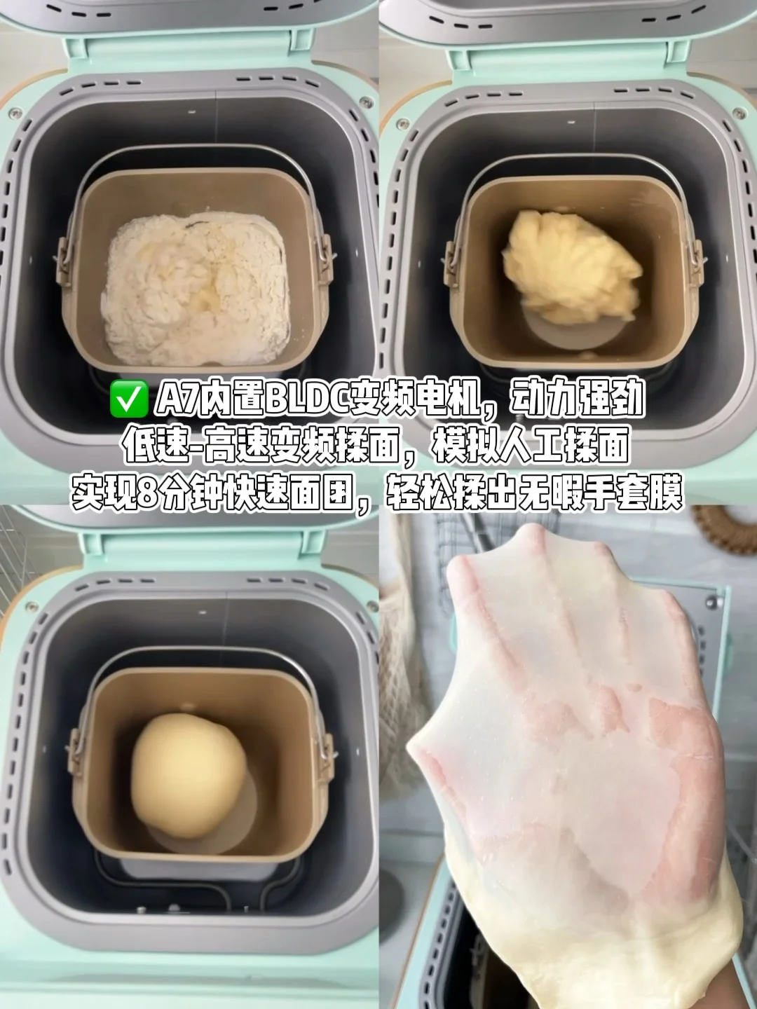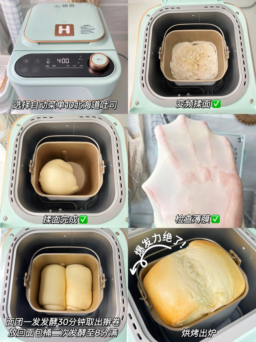 都是用自动菜单操作的,时间基本上4小时,烤色为淡色,酵母倒到酵母盒,启动自动菜单,揉面10分钟加入室温软化的黄油,放心交给机器。海氏A7变频揉面非常好用,从低速到高速,模拟人工揉面,出膜非常快,一键操作简单方便,新手小白也不会翻车~