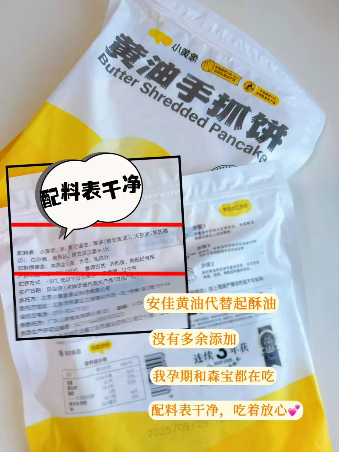 大家一直在问我哪款手抓饼健康好吃,其实我们一直在吃的是小黄象黄油手抓饼🫓小孕妇带着三岁的娃买东西时首先要看的就是配料表,这款手抓饼的配料表干干净净,没有其他乱七八糟的添加剂,是国少篮球队、冰球队指定产品,国家队小运动员都在吃。他们家是用安佳黄油代替的起酥油,0反式脂肪酸,口感绝佳,吃起来香而不腻,非常美味,做起来也简单方便,我双十一的必囤好物必须有小黄象黄油手抓饼,每天5分钟就能搞定小朋友的早餐,简直是我这种懒妈必备🤭🤭🤭
