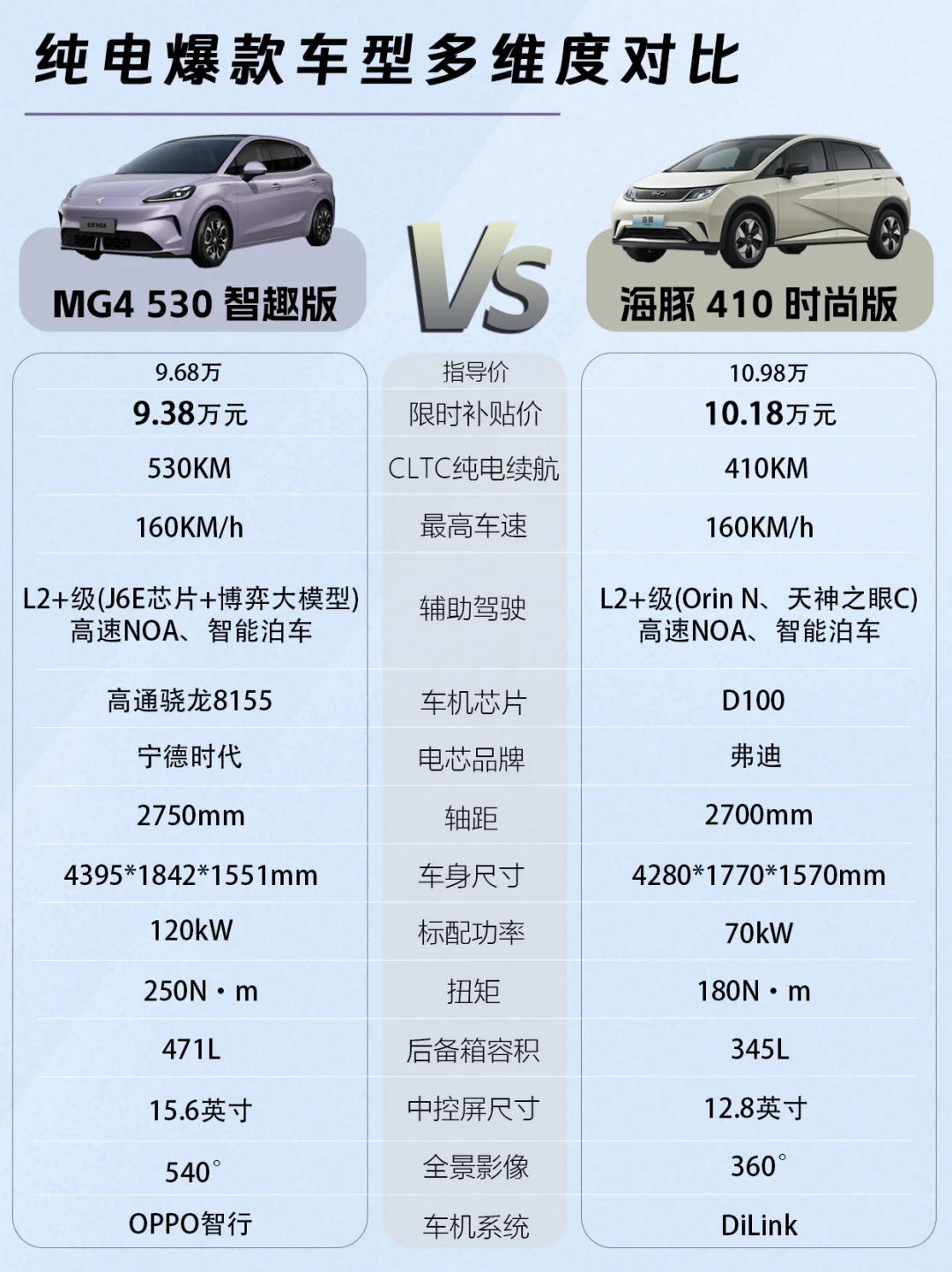 不仅智驾、配置高于同级✨,其他参数方面,MG4 530智趣版相比🐬410时尚版也是全面碾压:
