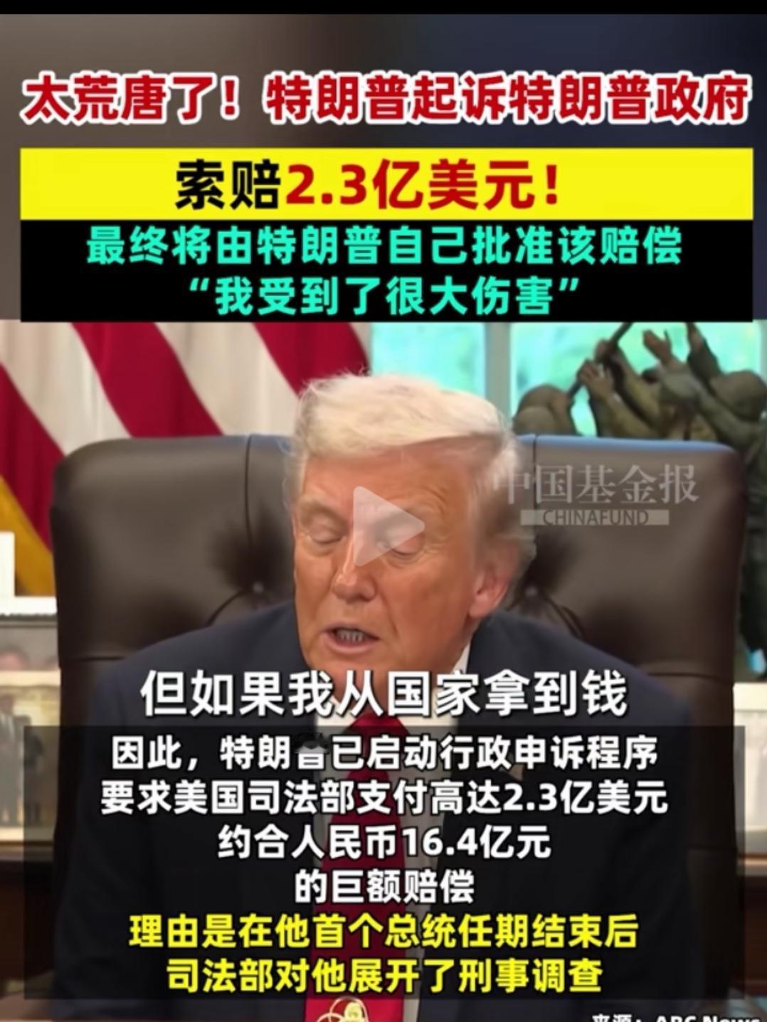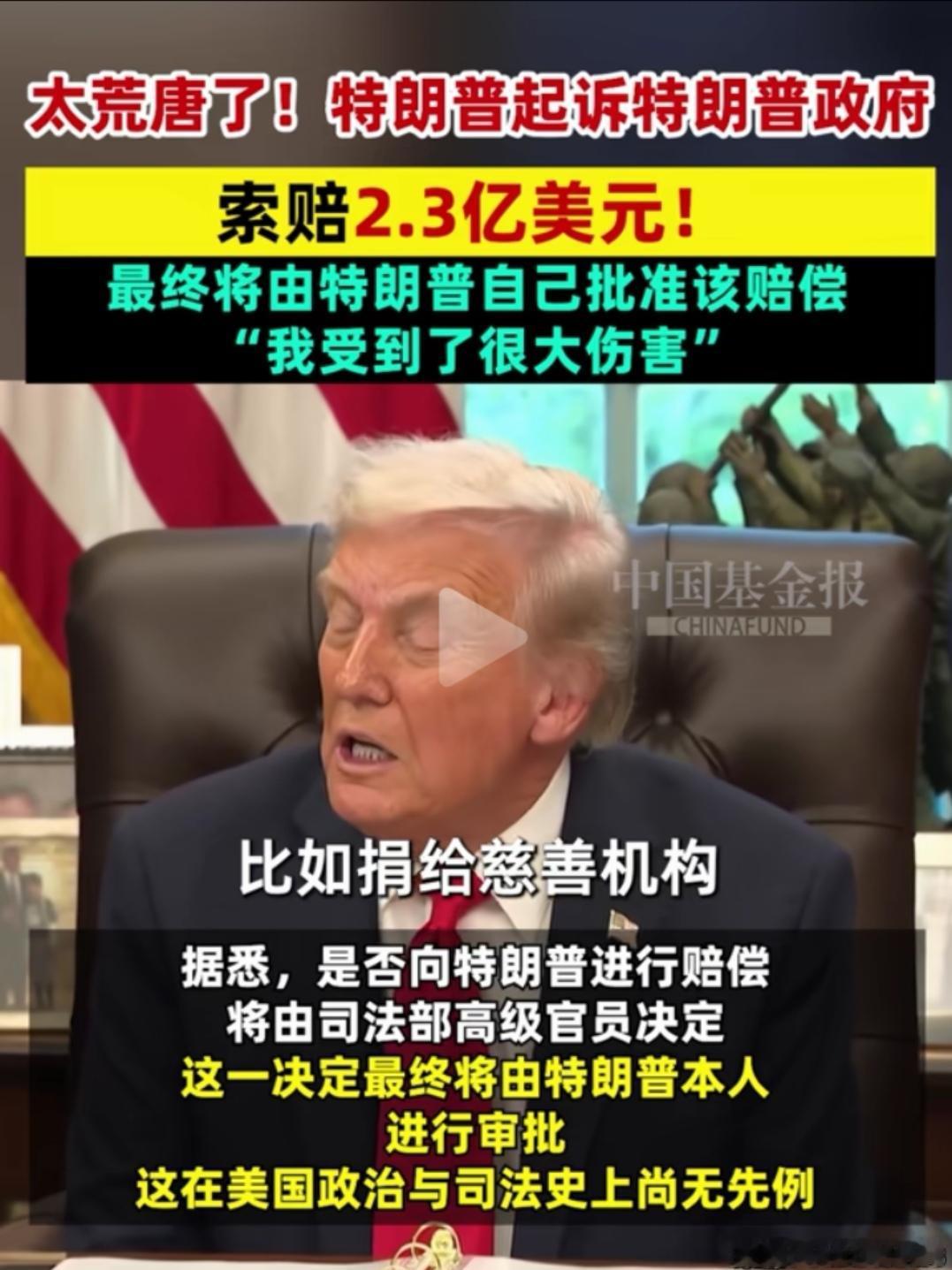 特朗普展露了特朗普特色! 很新奇,特朗普把特朗普政府给告了,还要求赔偿金2.3亿美元。 你关政府的门,没有线弄宴会厅,这不有招了。 特朗普要亲自起诉,司法决定给自己赔钱,最后自己审批,作为补偿,以挽回自己当年的被伤害。 赔偿金捐给慈善或拆白宫,建宴会厅! 特朗普弄钱,总是思维新奇,很有特色,但还总会成功,总有合情的理由,商人的天才发挥到了极致! 没有人比特朗普更懂得怎么弄钱,没人不服吧! 还记得特朗普第一届下台后,拜登政府调查特朗普,还有搜查特朗普别墅,通俄门,泄密门,此操作确实也是很难过,伤心的事,现在手握大权,有权不用,过期作废。 奇特的国度,奇特的总统,却被奉为世界秩序的统领!